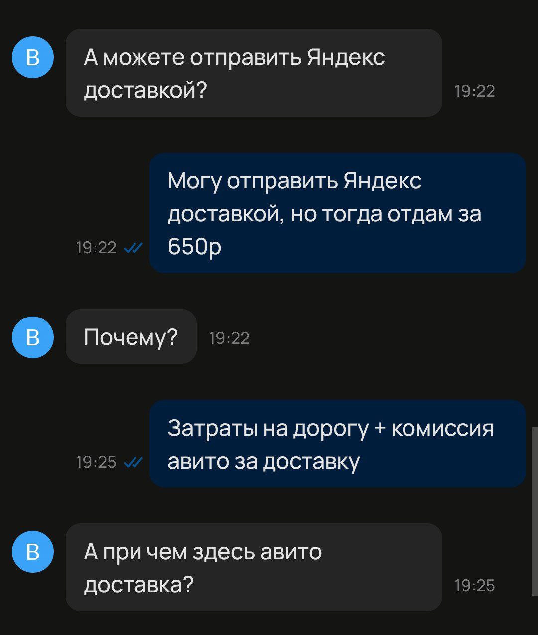 >>328948758 (OP) "ПРОСЬБА НАПИСАТЬ ПЕРЕД ОФОРМЛЕНИЕМ АВИТО - ДОСТАВКИ @ У ВАС НОВЫЙ ЗАКАЗ, ОТНЕСИТЕ ЕГО В ПУНКТ ВЫДАЧИ НЕ ПОЗДНЕЕ... @ ЗДРАВСТВУЙТЕ! ИЗ-ЗА КОМИССИИ АВИТО - ДОСТАВКОЙ СТОИМОСТЬ БУДЕТ ДОРОЖЕ НА 500 РУБЛЕЙ, ЕСЛИ ВАМ ОК, ТО ОТМЕНИТЕ ПОЖАЛУЙСТА ЗАКАЗ, ИЗМЕНЮ ЦЕНУ И МОЖЕТЕ ОФОРМЛЯТЬ @ ДА, ХОРОШО, ОТМЕНИЛ ЗАКАЗ @ ЦЕНУ ИЗМЕНИЛ, МОЖЕТЕ ОФОРМЛЯТЬ @ ВЫ ПОДНЯЛИ ЦЕНУ НА 500 РУБЛЕЙ И Я ЕЩЕ ДОЛЖЕН ЗАПЛАТИТЬ ЗА ПЕРЕВОЗКУ, ДОРОГОВАТО ПОЛУЧАЕТСЯ @ НО ВЫ ЖЕ САМИ СКАЗАЛИ... МОЖЕТЕ КУПИТЬ ПО ПРЕДОПЛАТЕ, ОТПРАВЛЮ ЯНДЕКСОМ ЗА 250 РУБЛЕЙ @ РАДИОМОЛЧАНИЕ