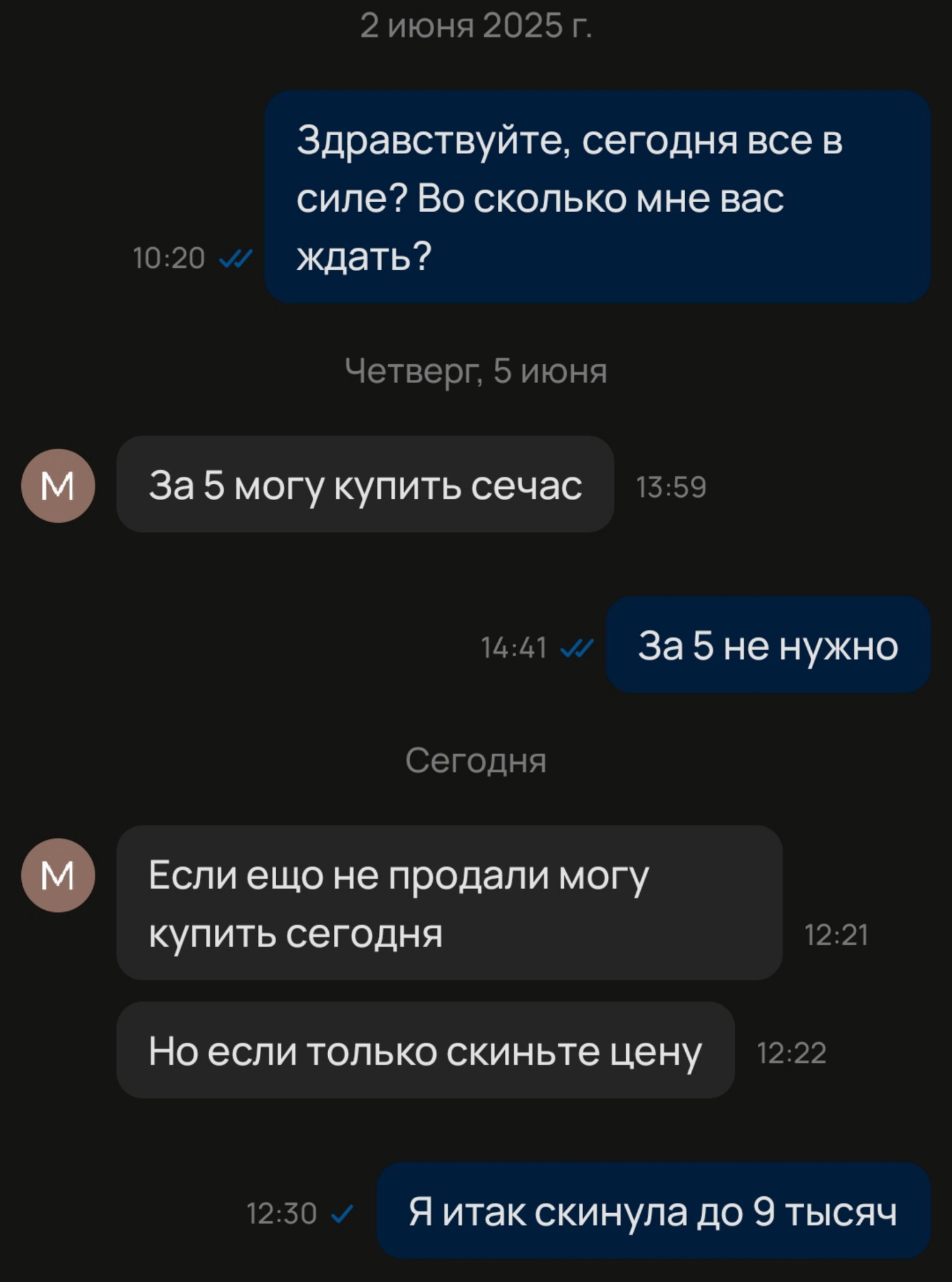 >>328953609 > Сообщений было дохуища, но я поехал на встречу к тому, кто мог встретиться прямо сейчас. Первая ошибка. Никогда и никуда не езжай. Ты продаешь, значит ехать должны к тебе. Не хочешь пускать домой - назначай встречу в ближайшей к дому кофейне или в маке, да хоть в подъезде. Ты продаешь, он покупает, это значит ты назначаешь место встречи. > началось: "бляя, вот тут царапки, "бляяя, так он розовый значит нелеквииид". Сходу цену с 65к скинул до 30к и сказал, что дороже никто не купит. Не хочешь - не покупай, цена 65к. > Сидел 40 минут ему доказывал, что за 30к его не отдам, а тот не поддавался. 15 минут. 15 минут, больше я на рандома не трачу. Через 15 минут говоришь типо не хочешь покупать - не покупай. Важный момент, ты встаёшь и начинаешь собираться. > этот сразу 15к накинул, так на 45к и обусловились. Лошара, блять. Я бы сказал - 70к, 5к мне за потраченное время. Не хочешь - не покупай.