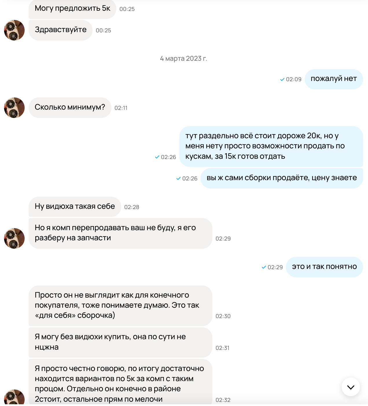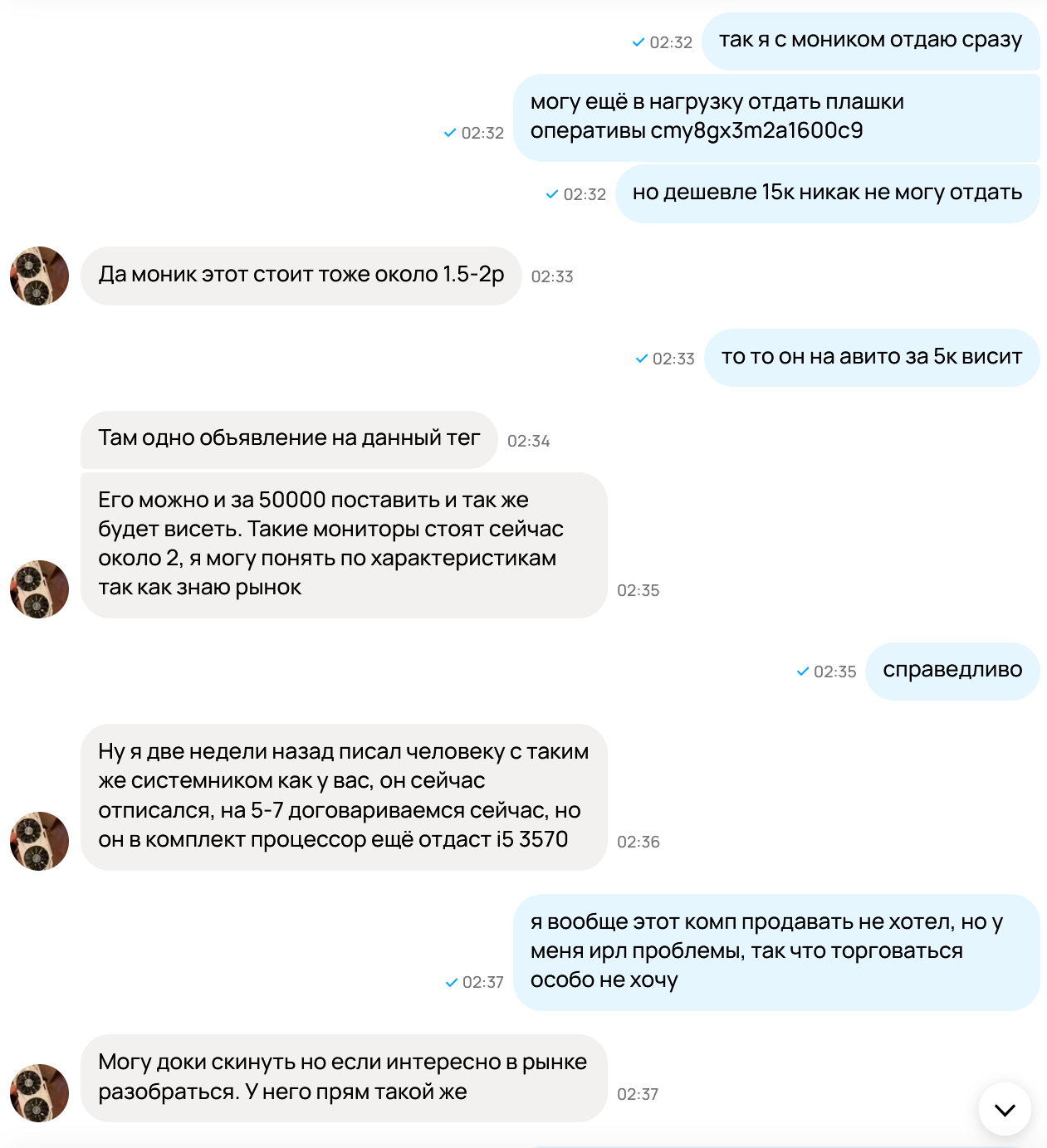 Продавал ПК старый системник+моник за 15к в 2023 году. Сразу скажу, что отдал за 13к через неделю буквально другому челу, который даже работоспособность не стал проверять. Конфиг был такой: Процессор Intel Core i5 3570 Видеокарта Geforce GTX 660ti Материнка MSI z77a-g45 Оператива Kingston KHX 1600c 10d3 две по 8гб Блок питания Corsair VS 650 Кулер для процессора Cooler Master Hyper 212 EVO V2 Монитор Samsung SyncMaster B2440