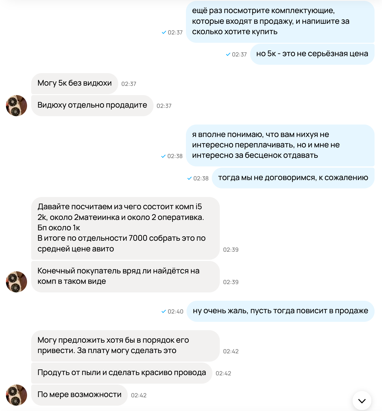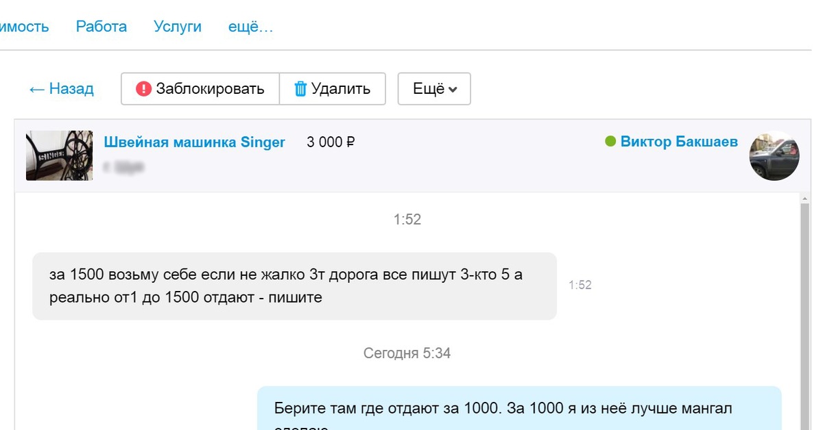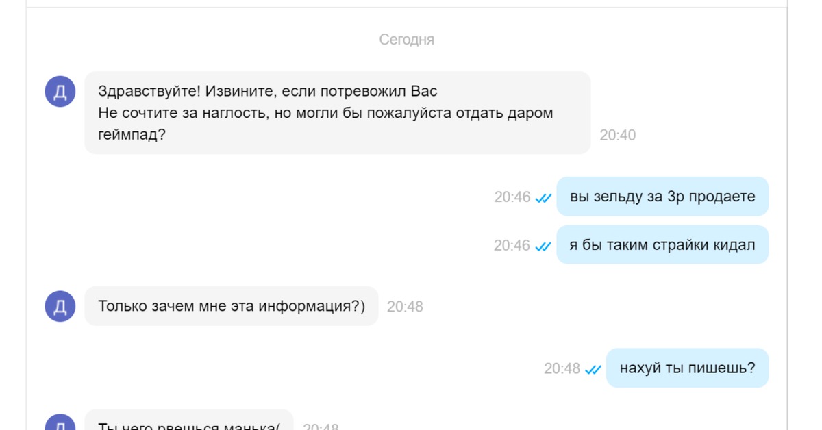 Но этот хрюндель меня взбесил, я зашел на его страницу на авито и увидел, что это ебло барыжит вской хуйней телевизор доисторический продавал за 100к еще какую то хуету , ну я и начали писать на все его объявления точно также как и он. Типа заберу телевизор за полторы тыщи, с вашей доставкой и подьёмом на 5 этаж без лифта. Он игнорил какое то время, потом начал агрится, бесился, угрожал. А я лузовил с хрюнделя этого.