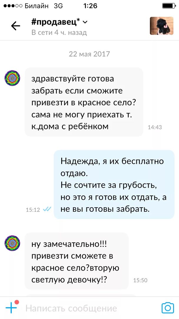 >>328952709 Заказываю товар доставкой. Продавец, ой, я не хочу этой доставкой оформлять, мне до неё ехать далеко в Москве. Смотрю по локации, у него рядом все есть. Ладно, какой вариант устроит? Вот такой. Заказываю. Меня стоимость доставки не устраивает, давайте оплатите разницу. Хорошо, пишу, поднимите цену объявления. Снимает объявление и поднимает цену. Заказываю, не отвечает.