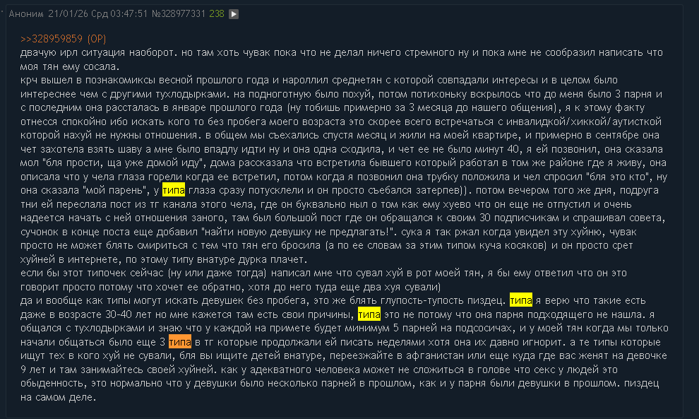>>328959859 (OP) двачую ирл ситуация наоборот. но там хоть чувак пока что не делал ничего стремного ну и пока мне не сообразил написать что моя тян ему сосала. крч вышел в познакомиксы весной прошлого года и нароллил среднетян с которой совпадали интересы и в целом было интереснее чем с другими тухлодырками. на подноготную было похуй, потом потихоньку вскрылось что до меня было 3 парня и с последним она рассталась в январе прошлого года (ну тобишь примерно за 3 месяца до нашего общения), я к этому факту отнесся спокойно ибо искать кого то без пробега моего возраста это скорее всего встречаться с инвалидкой/хиккой/аутисткой которой нахуй не нужны отношения. в общем мы съехались спустя месяц и жили на моей квартире, и примерно в сентябре она чет захотела взять шаву а мне было впадлу идти ну и она одна сходила, и чет ее не было минут 40, я ей позвонил, она сказала мол "бля прости, ща уже домой иду", дома рассказала что встретила бывшего который работал в том же районе где я живу, она описала что у чела глаза горели когда ее встретил, потом когда я позвонил она трубку положила и чел спросил "бля это кто", ну она сказала "мой парень", у типа глаза сразу потусклели и он просто съебался затерпев)). потом вечером того же дня, подруга тни ей переслала пост из тг канала этого чела, где он буквально ныл о том как ему хуево что он еще не отпустил и очень надеется начать с ней отношения заного, там был большой пост где он обращался к своим 30 подписчикам и спрашивал совета, сучонок в конце поста еще добавил "найти новую девушку не предлагать!". сука я так ржал когда увидел эту хуйню, чувак просто не может блять смириться с тем что тян его бросила (а по ее словам за этим типом куча косяков) и он просто срет хуйней в интернете, по этому типу внатуре дурка плачет. если бы этот типочек сейчас (ну или даже тогда) написал мне что сувал хуй в рот моей тян, я бы ему ответил что он это говорит просто потому что хочет ее обратно, хотя до него туда еще два хуя сували) да и вообще как типы могут искать девушек без пробега, это же блять глупость-тупость пиздец. типа я верю что такие есть даже в возрасте 30-40 лет но мне кажется там есть свои причины, типа это не потому что она парня подходящего не нашла. я общался с тухлодырками и знаю что у каждой на примете будет минимум 5 парней на подсосичах, и у моей тян когда мы только начали общаться было еще 3 типа в тг которые продолжали ей писать неделями хотя она их давно игнорит. а те типы которые ищут тех в кого хуй не сували, бля вы ищите детей внатуре, переезжайте в афганистан или еще куда где вас женят на девочке 9 лет и там занимайтесь своей хуйней. как у адекватного человека может не сложиться в голове что секс у людей это обыденность, это нормально что у девушки было несколько парней в прошлом, как и у парня были девушки в прошлом. пиздец на самом деле.