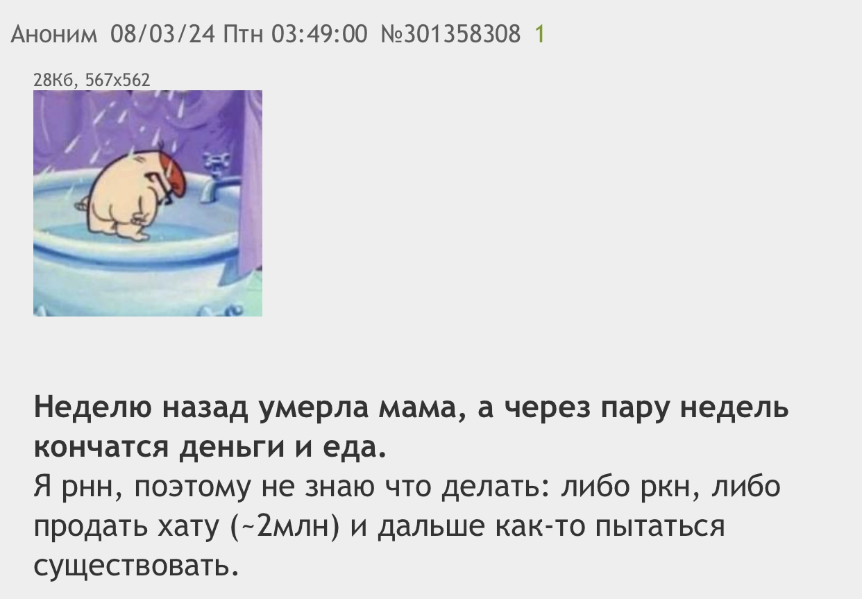 >>328962371 (OP) Хз, не понимаю драмы РННщиков некоторых. Крякнут родаки? Ну все, лафа кончились, пиздуйте на работку. Мне чуть больше 30 лет, работал из них 1.5 года, когда поссорился с родаками и был послан нахуй. Пошел работать в ближайший супермаркет в 30 минутах ходьбы от дома, выставлял с палетов товар на полки за около-минималку 2/2. На работе ещё и кормили бесплатно, была столовка, так что половину дней не надо было едой вообще запариваться. То есть в чем проблема все таки пойти работать, если есть свое жилье? Если вы прям аскет, то можно на 3-4 месяца зимой устраиваться каждый раз, а потом увольняться и жить на заработанные 100к. Можно подрабатывать в праздники, там двойная оплата. Чё бы сычу 31 декабря и 1 января не поработать. Короче РНН бывают разные, как выше писали. Есть идейные чуваки-ленивцы-тутовики-бобыли, а есть мамины хуишки, которые без мамки просто не выживут. Для меня РНН осознанный выбор, мне впадлу работать, если я у родаков с доходом 300кмес могу 20к просто выпросить. Но если меня выгонят опять, то я просто пожму плечами и пойду звонить в говнерочку или красно-белое. Хули вы ноете, чушки? Пиздуйте работать, если кормежка пропала. Ничего с вами не случиться от работы. Все таки 21 век на дворе, можно даже не дноработе работать 80 часов в месяц и как-то выживать, если запросы небольшие уровня жрачка+интернет. Единственное- зубки берегите с молодую ну и вообще здоровье. Я тут к стоматологу попал на 20к, мамка ругалась.