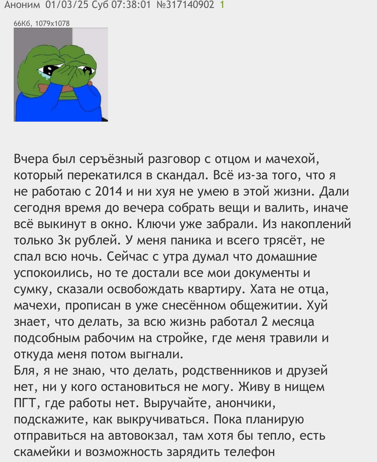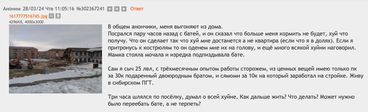 Бля, ебать. Жалко челиков, конечно. ПГТ - это вообще клоака ебучая в плане поиска работы. Хотя не везде хуёво. Где-то есть нормальные магазины, куда можно устроиться. А вот жить.. хуй знает. Съёма в ПГТ я не встречал. Зато заброшек таки дохуя