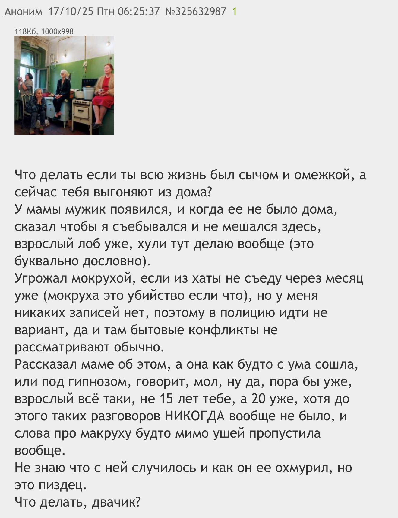 >>328970153 В коммуналке. Рядом живут дед под 60, студент-медик и женщина-алконавт.