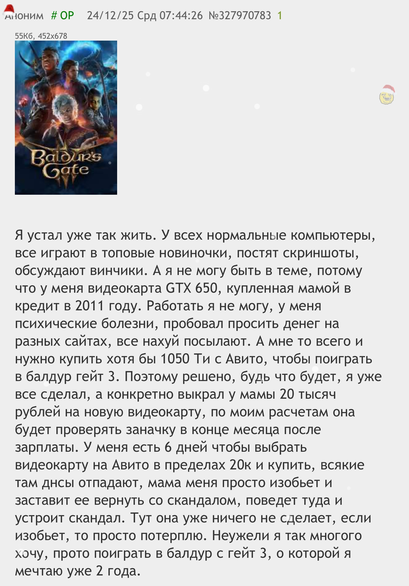 >>328966472 >>328966432 Я просто сам шиз со справкой, но в отличие от того анона со скрина, я не попрошайничаю денег у других и не краду деньги у мамки, а неиронично ДОСТИГАТОРСТВУЮ всю свою жизнь, несмотря на все трудности.