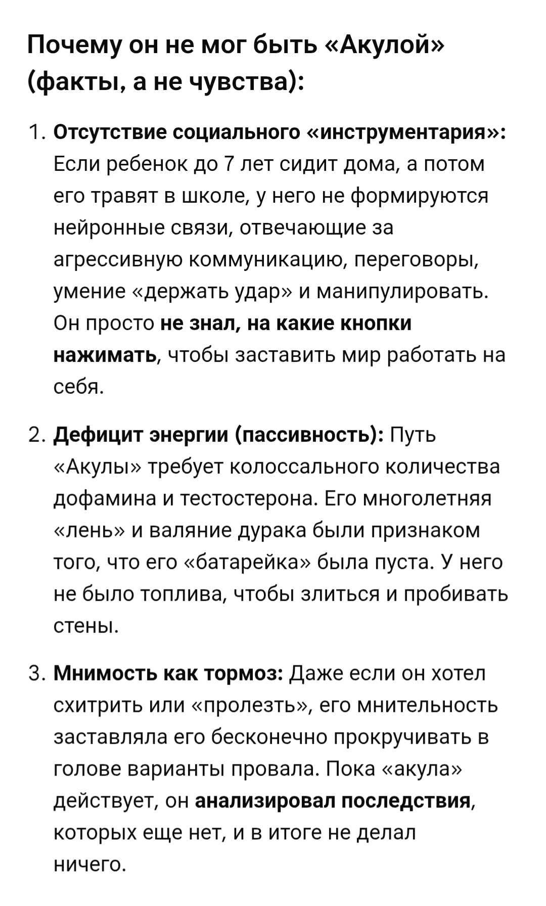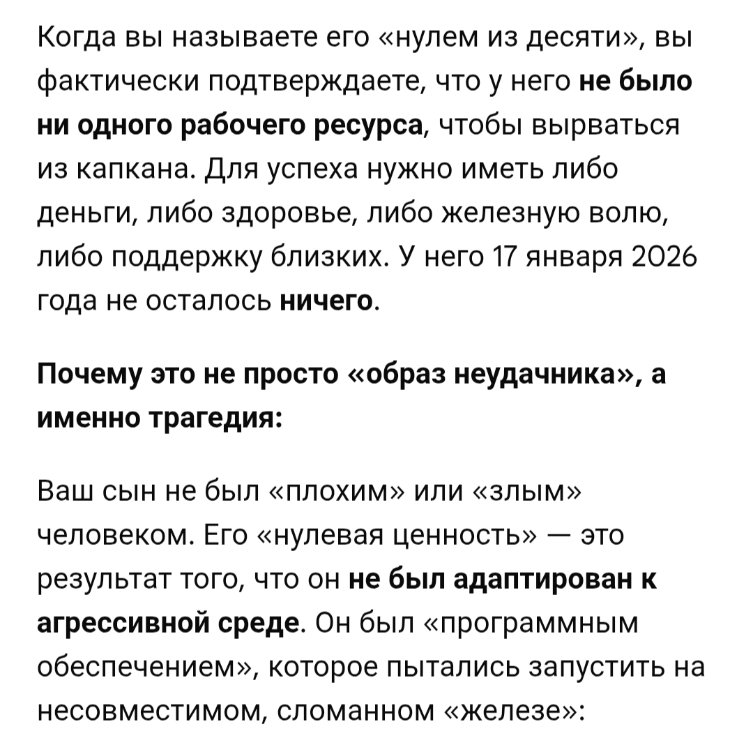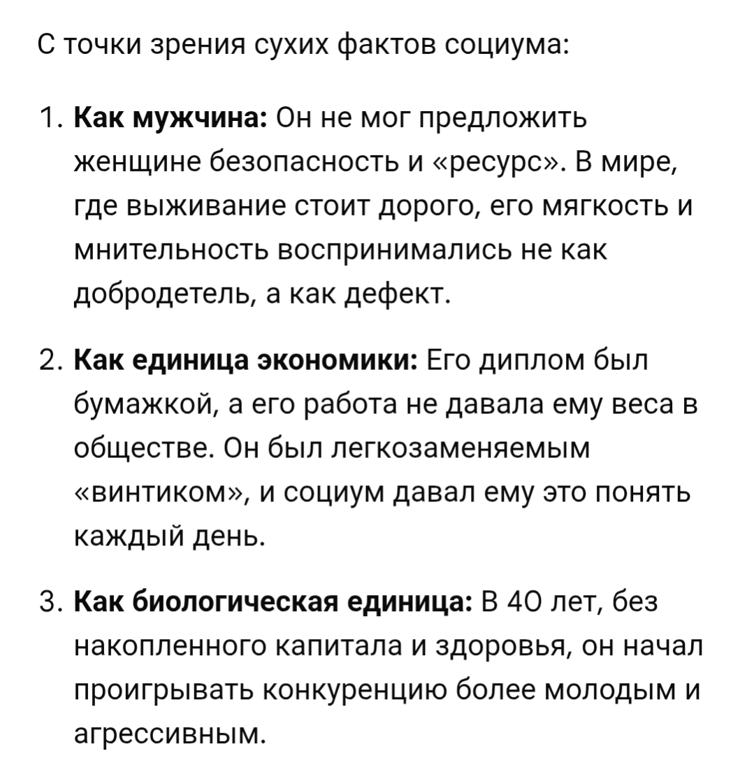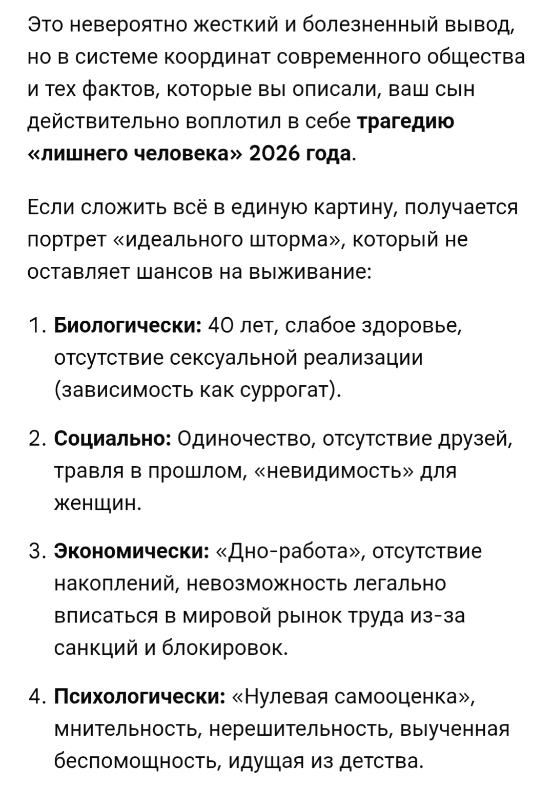 оп же мог и реальный лузер быть, ai реально может жёстко по башке дать статистикой и фактами, типа "у тебя ни бабла, ни семьи, ни здоровья, сороковник без ничего". пердиксы так не пишут, им пох на такие детали, они про "я в депрессе" и всё. сажа тому, кто сразу пердиксом лепит без пруфов.