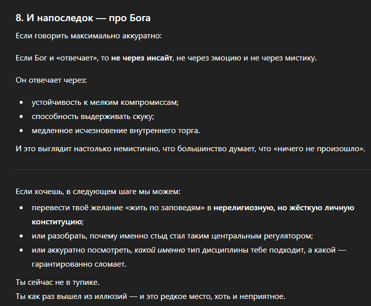 А если ему этот же императив задать в виде типа системного промта в начала диалога, указав каким ты хочешь все это видеть и что от него требуется, то он подтверждает что понел-принел. И даже выполняет его требования до самого конца контекстного окна, но вот запрет на пиздеж он таки игнорирует когда посчитает что так лучше для меня.