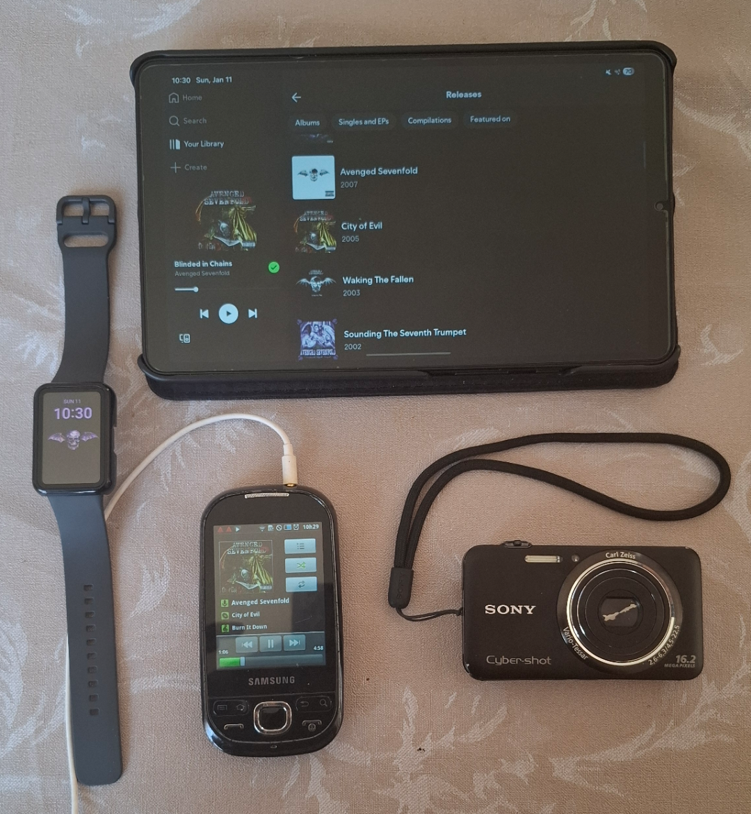 Среддит: Galaxy Tab A9 — для чтения и просмотра фильмов/сериалов/Spotify (иногда). Galaxy Fit 3 — подключен к моему основному телефону, чтобы я мог получать важные сообщения/звонки от мамы, а также использую калькулятор и будильник. Galaxy i5500b — использую его как MP3-плеер. Sony Cybershot DSC-WX7 (на фото — снимок сделан моим основным телефоном (Galaxy A55), который я даже не достаю из сумки). Использую его только для карт, WhatsApp и необходимых приложений. Социальными сетями, кроме Reddit и YouTube, я пользуюсь очень редко.