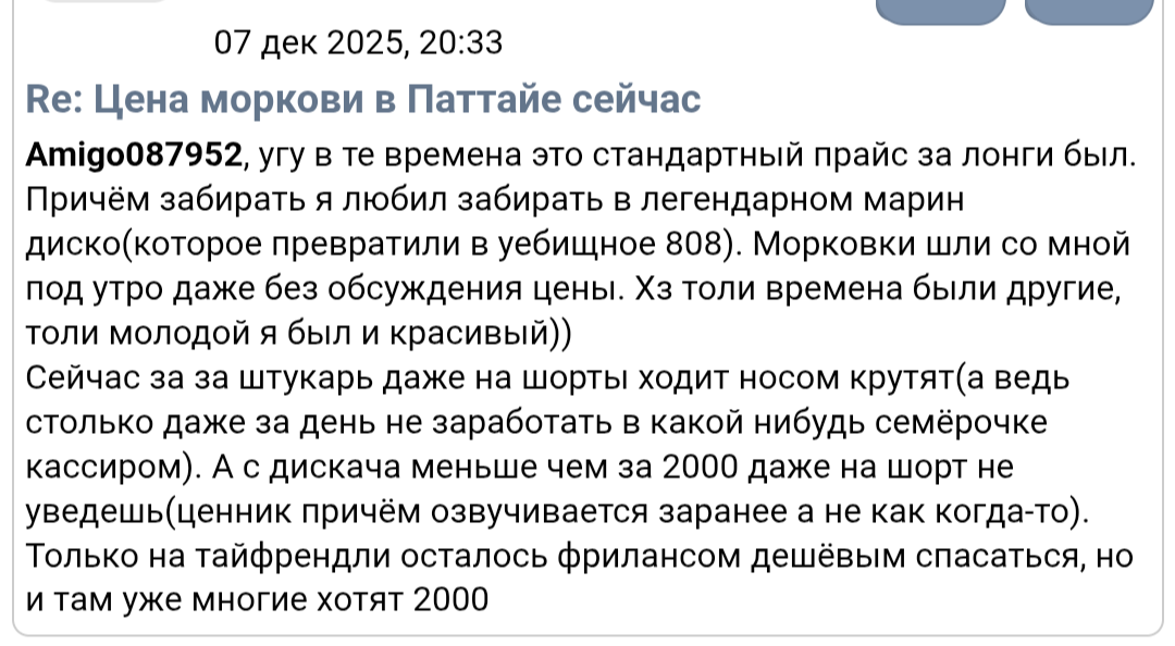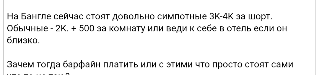Правда 1000 бат это сейчас 2700 рублей гже-то, плюс комната и может пиво, вот уже и 3к. У нас в Тжевске такие же цены на проституток.