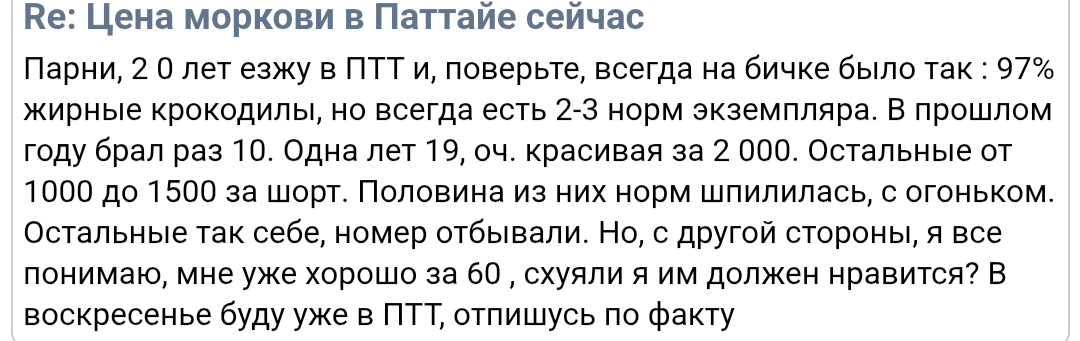 >>329013617 Не верю я тебе, зашёл на 1 минуту на форум Винского, цены даже в птт, где всегда в 2 раза ниже ценник был. А на Пхукете европейцы ценник подняли в разы. Шт 1000-1500 в птт, в Пхукете х2