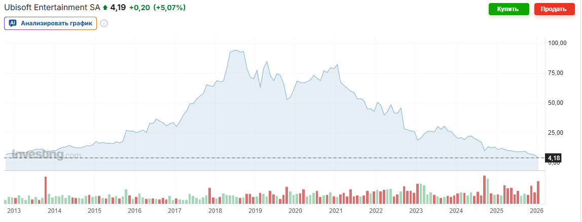 >Акции французского разработчика видеоигр Ubisoft 22 января потеряли более трети стоимости на Парижской бирже после сообщения об отмене разработки нескольких проектов. К моменту написания материала бумаги компании дешевели на 34,97 процента, до 4,31 евро за штуку, свидетельствуют данные торгов.