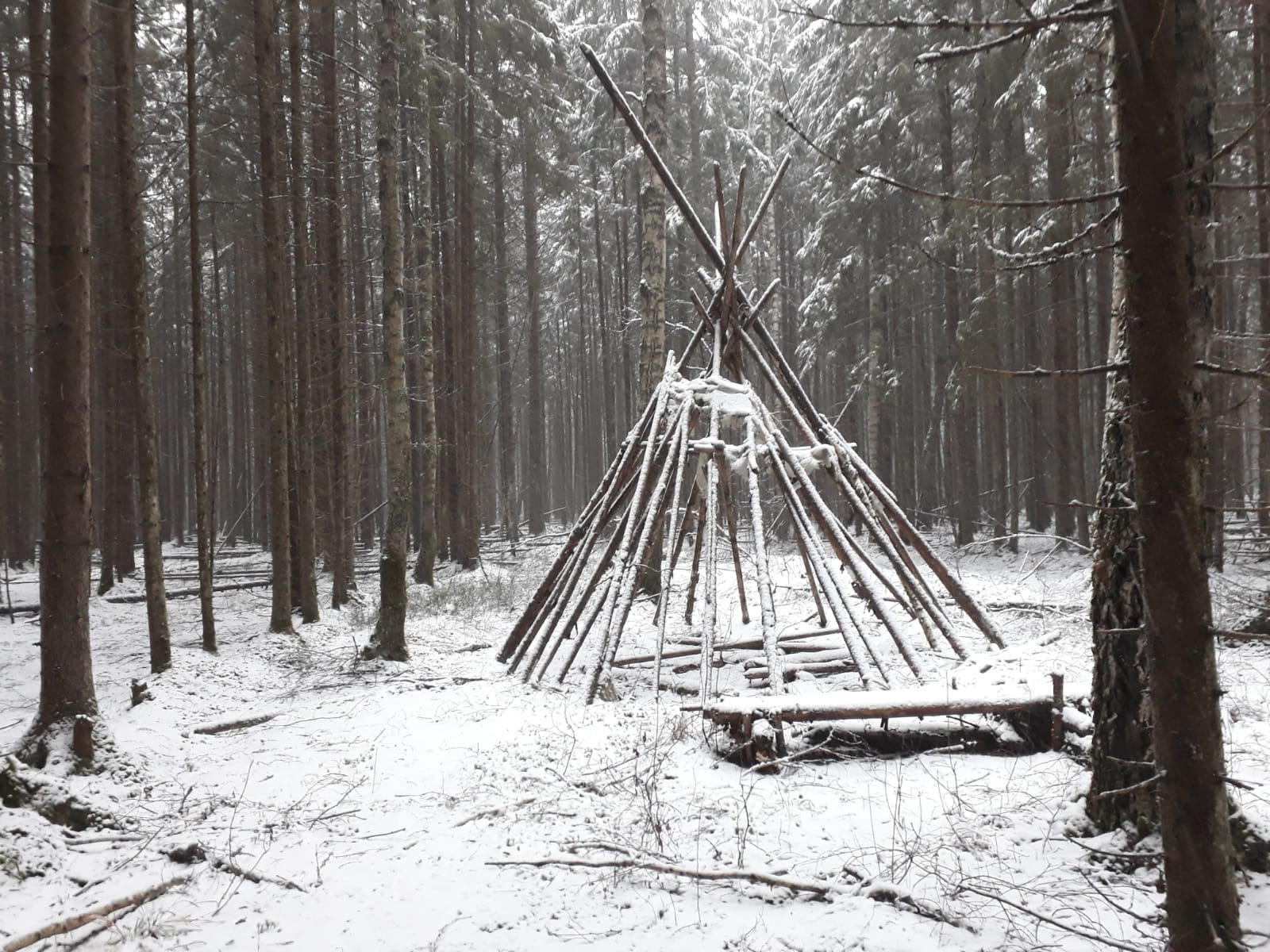 В реальности жердины примерно одинаковой длины. Связываются на конца и отступают какое-то расстояние. Потом палки перекручиваются, перекладываются и поднимаются. На этот склеет из трех палок накидываются остальные, они просто лежат. Потом брезент привязывается к двум палкам и так накидывают все стороны. Делается потом палка/две палки с березентом - вход, брезент подвернут или палка сдвигается.