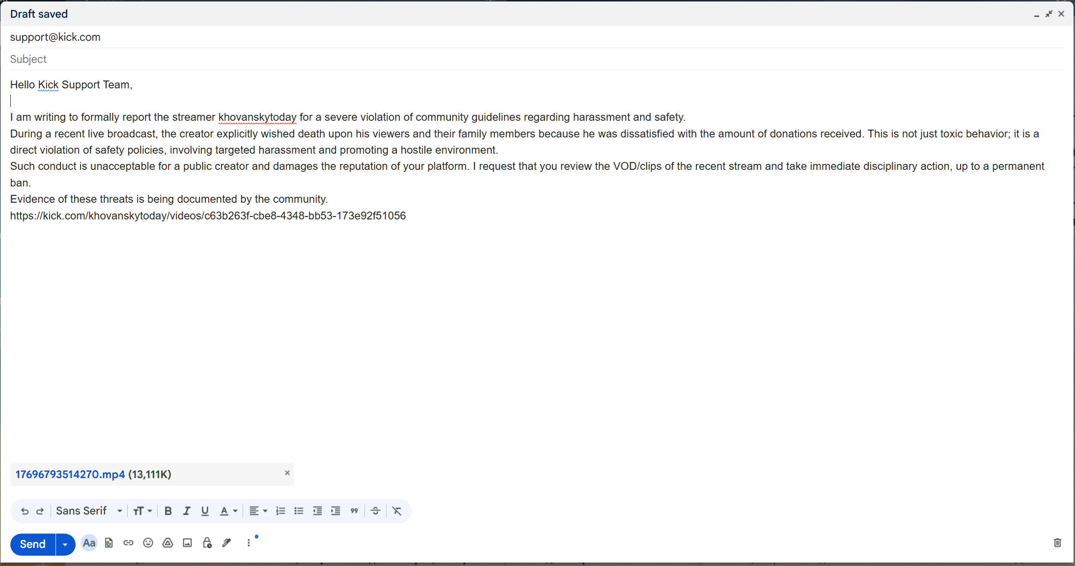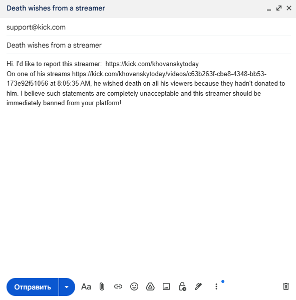 ТЕМА: ЛЮБАЯ, НАПРИМЕР: Death Wishes and Harassment by Streamer khovanskytoday Report: Severe Abuse During Live Stream Community Guidelines Violation – khovanskytoday Formal Complaint: Wishing Death to Viewers Urgent Report of Abusive Conduct on Kick