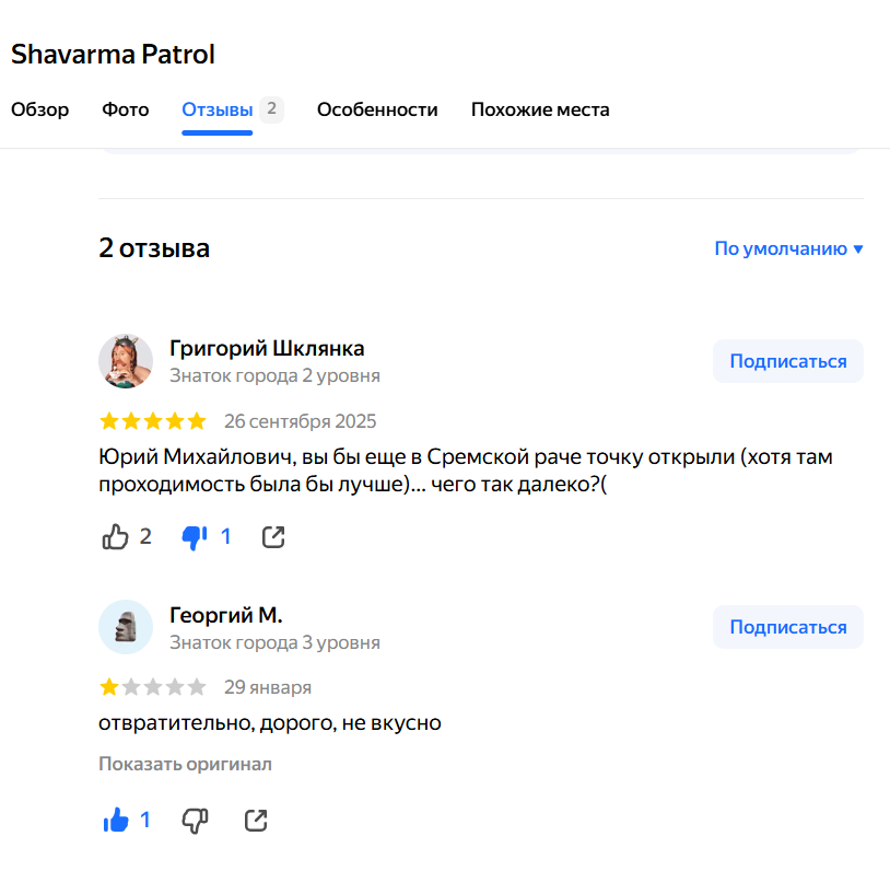 Так же можно работать по шаурмичной хованского в сербии: Shavarma patrol Адрес: Максима Горког 51a, Београд 11000, Сербия обваливаем оценку на гуглах и яндексах(да там этим тоже пользуются)