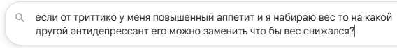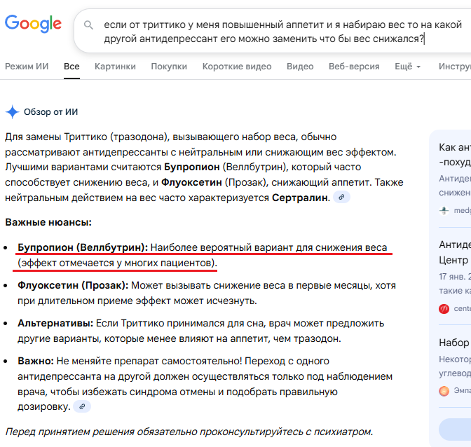 >Выписал мне Триттико, у меня от него повышенный аппетит и набор веса как от Флуоксетина, Амитриптилина, Лимипрамила и других антидепрессентов.