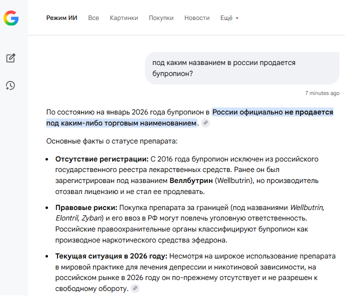 >Ходил к психиатру он сказал мне купить антидепрессант бупропион. Оказалось в аптеках его нигде нет, и нет на маркетплейсах потому что в 2019 году он был причислен к запрещенным препаратам