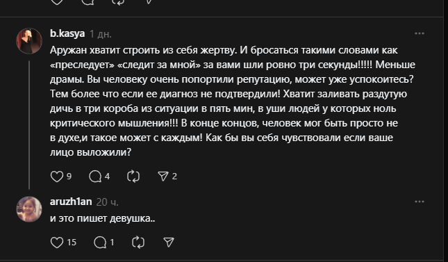 Ну и полиция подсуетилась и отреагировала. Аружанка ещё и в суд подала, в итоге потаскали по полиции, потом в суд с родителями - дали штраф 13 тыс рублей (85 тыс тенге) + много кто в тхреадс узнал Анелю, одноклы из школы, знакомые и тд. + люди из ЖК подсуетились, вытащили записи с камер, как Анеля шатается по ЖК за людьми.