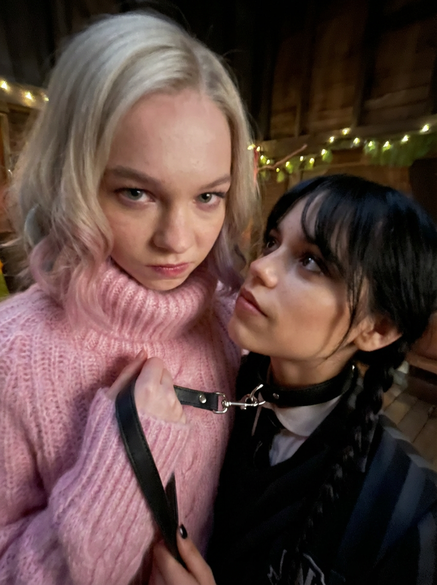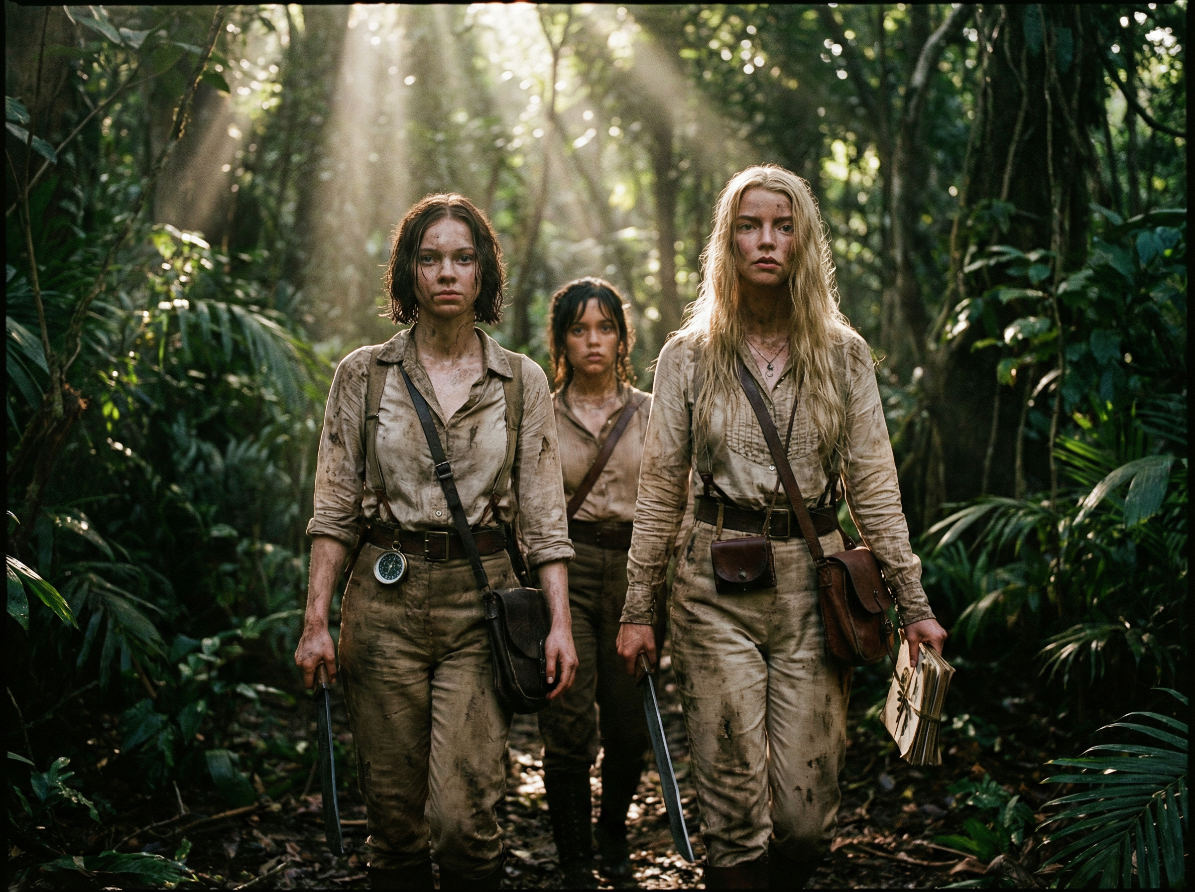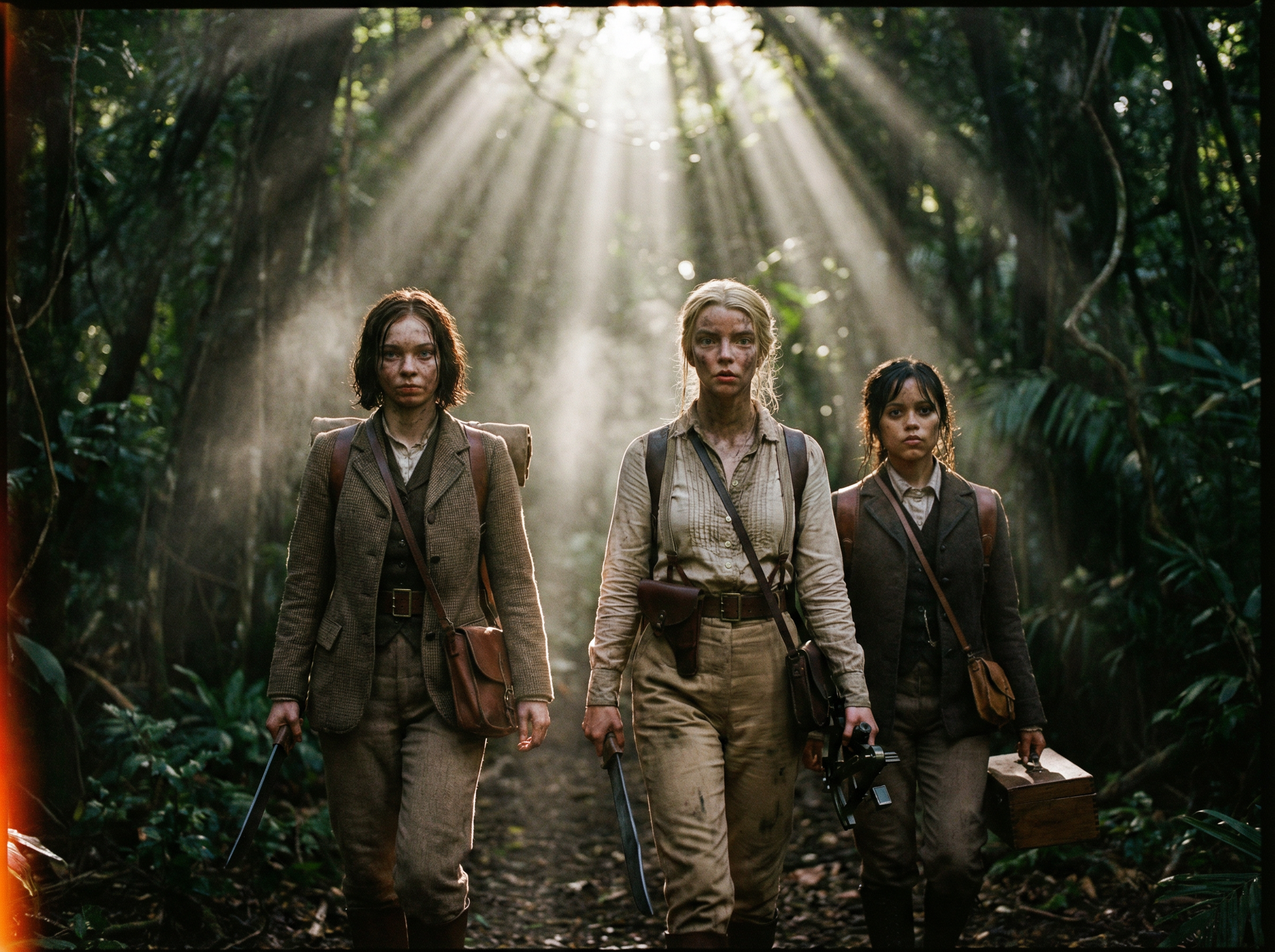 Adventure movie scene. Shallow depth of field. dark color palette, film grain, volumetric lighting. long telephoto lens, bokeh blur, close-up on faces. Low angle view. Year 1821, somewhere in Amazonia. Three female explorers are making their way through the jungle, towards the camera, all sweaty, tired, exhausted, dirty. In the foreground, the leader of the expedition, Anya Taylor-Joy, wielding machete and cutting her way through the lush vegetation, determined look on her face, gritting her teeth, spark in her eyes. Next to her, on the left, is a whiny weakling Emma Myers, dragging herself along, looking at Anya and complaining. On the right, slightly in background, is Jenna Ortega, with cuts on her face, stoically overcoming obstacles, glancing at Emma judgmentally. 21:9