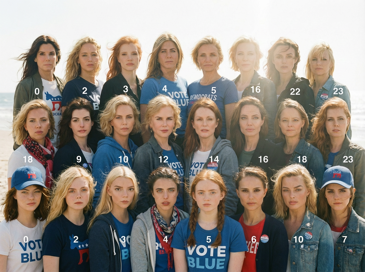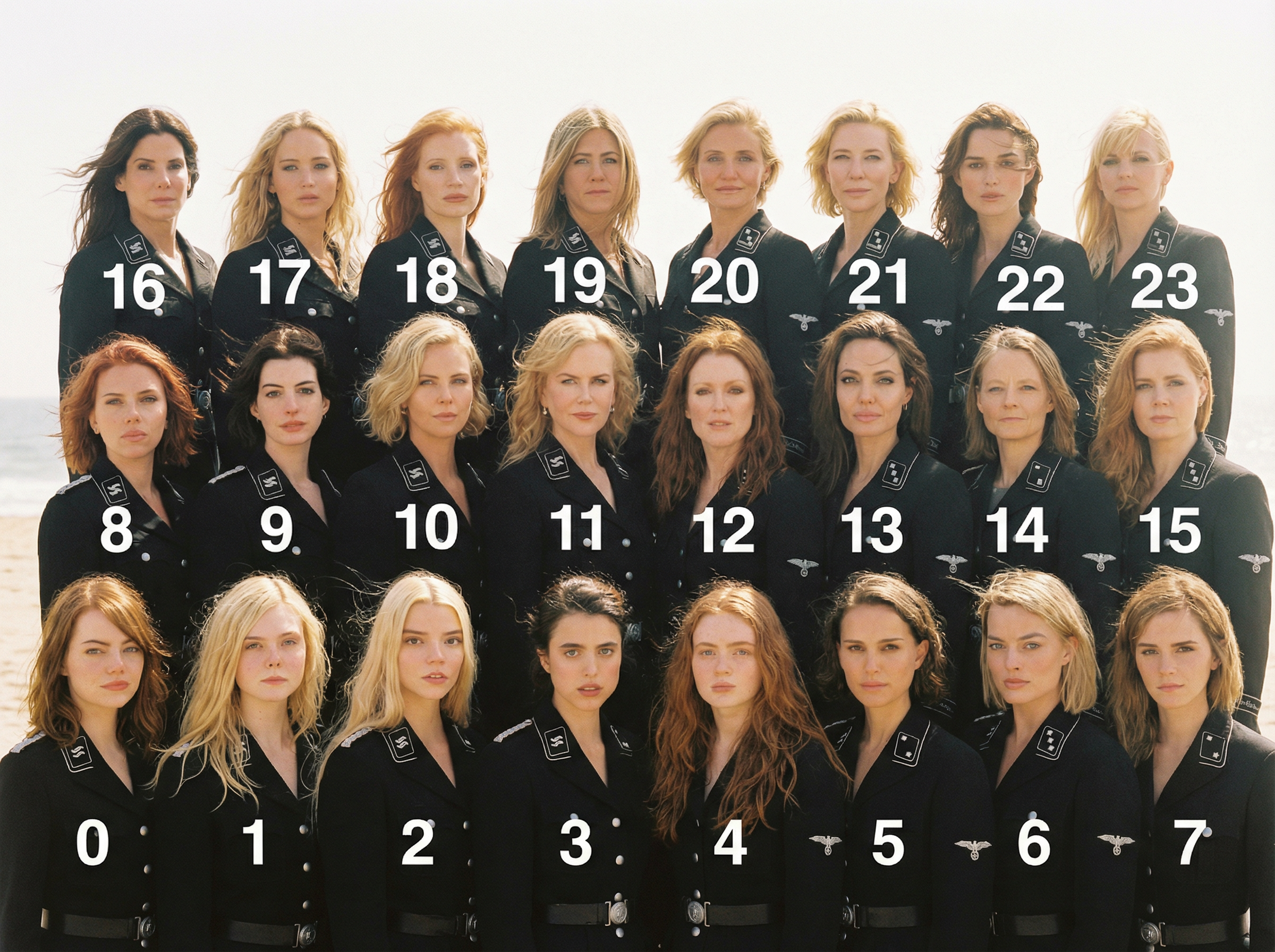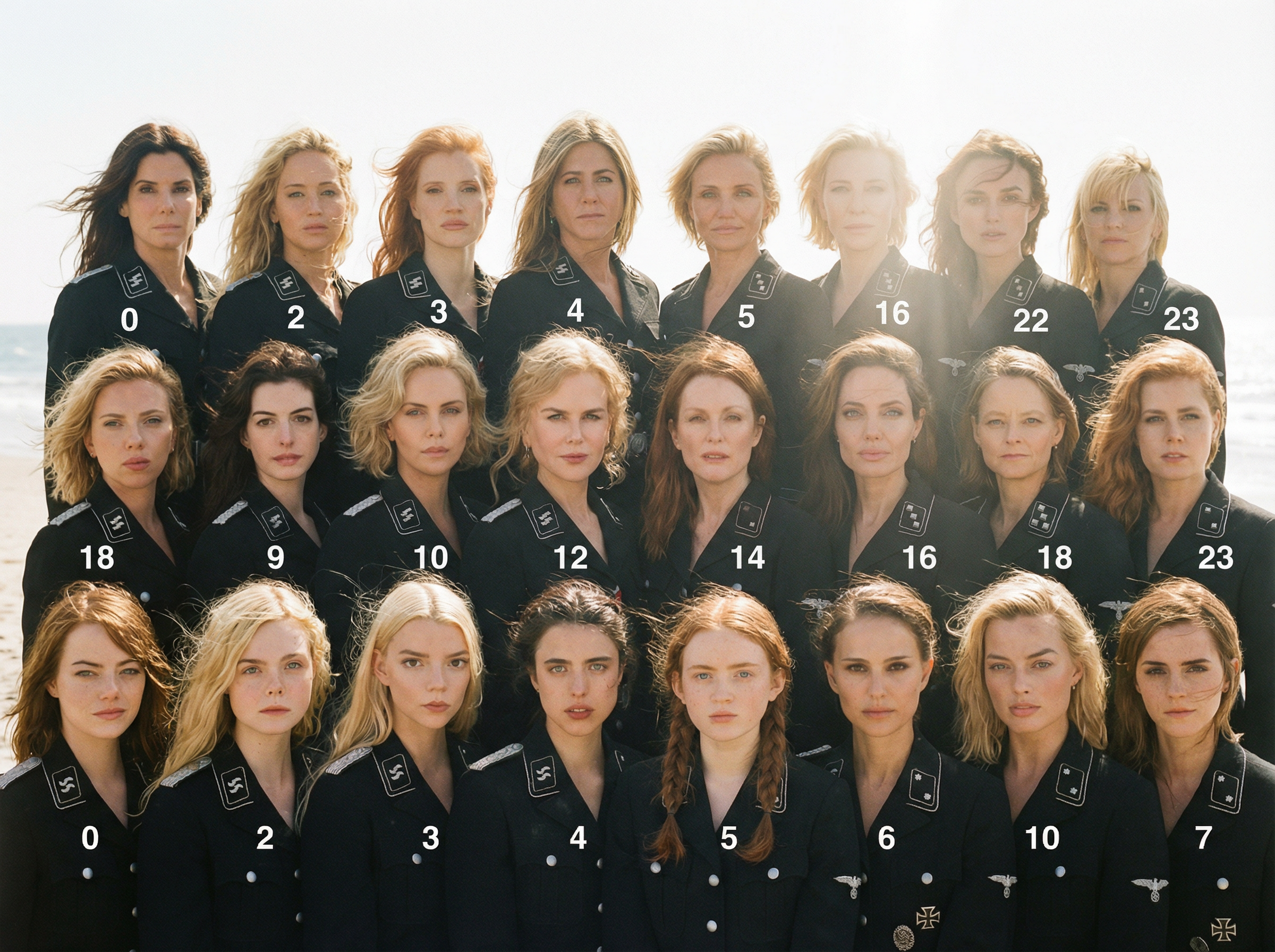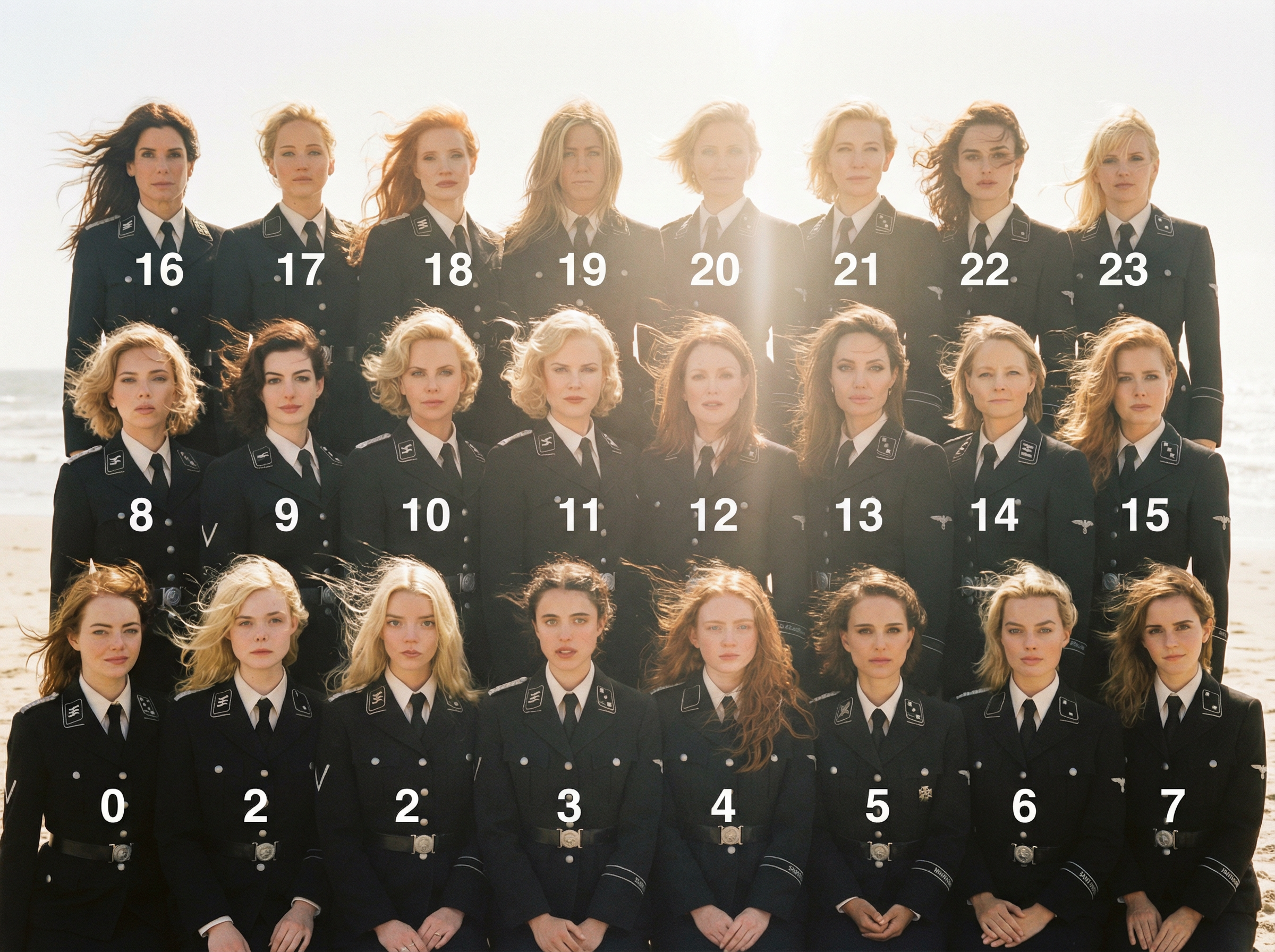>>329224039 (OP) На изображении крупным планом запечатлены девушки в три ряда на ярком солнечном пляже в ветреную погоду. Emma Stone и Elle Fanning и Anya Taylor-Joy и Margaret Qualley и Sadie Sink и Natalie Portman и Margot Robbie и Emma Watson в нижнем ряду. Scarlett Johansson и Anne Hathaway и Charlize Theron и Nicole Kidman и Julianna Moore и Angelina Jolie и Jodie Foster и Amy Adams в среднем ряду. Sandra Bullock и Jennifer Lawrence и Jessica Chastain и Jennifer Aniston и Cameron Diaz и Cate Blanchett и Keira Knightley и Anna Faris в верхнем ряду. Исключи повторения лиц. Возле каждой девушки с нижнего и до верхнего ряда слева направо написаны цифры белого цвета шрифтом Helvetica от 0 до 23. Волосы девушек развиваются на ветру. Девушки одеты в черную униформу СС 1940-ых годов и стоят в полный рост. Лица всех девушек находятся очень близко друг другу и к объективу камеры, создавая контакт со зрителем. Освещение очень мягкое как на Canon Leica Hasselblad, имитирующее полдень на открытом белом солнце. В кадре присутствует сильный белый солнечный засвет, заливающий изображение мягким белым сиянием. Цветовая гамма снимка бледно-теплая, с преобладанием бежевых, золотистых и песочных оттенков. Фотография имеет качество пленочного снимка с легкой зернистостью и высокой детализацией кожи. Видны мельчайшие волоски, текстура ткани и блеск на губах. Атмосфера снимка передает ощущение летней жары. Соотношение сторон изображения 4:3.