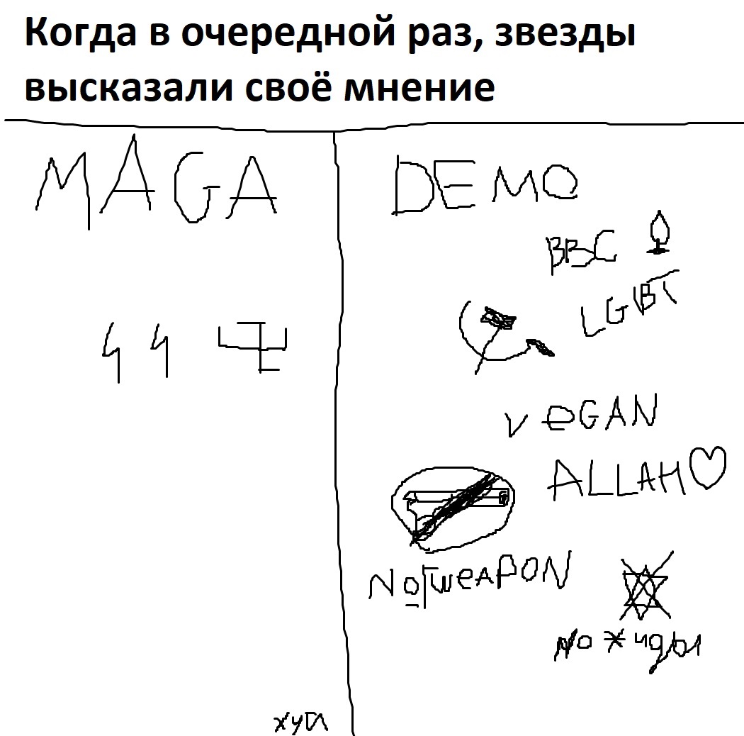 >>329224878 Ну есть общая пикча, где с одной стороны актрисы в форме СС, а сдругой одеты как либерахи/фемки/любители совка и т.д. Сверху над первой, где они в форме СС, надпись "У власти республиканцы", а над второй, где одеты как либерахи/фемки/любители совка надпись "У власти демократы.