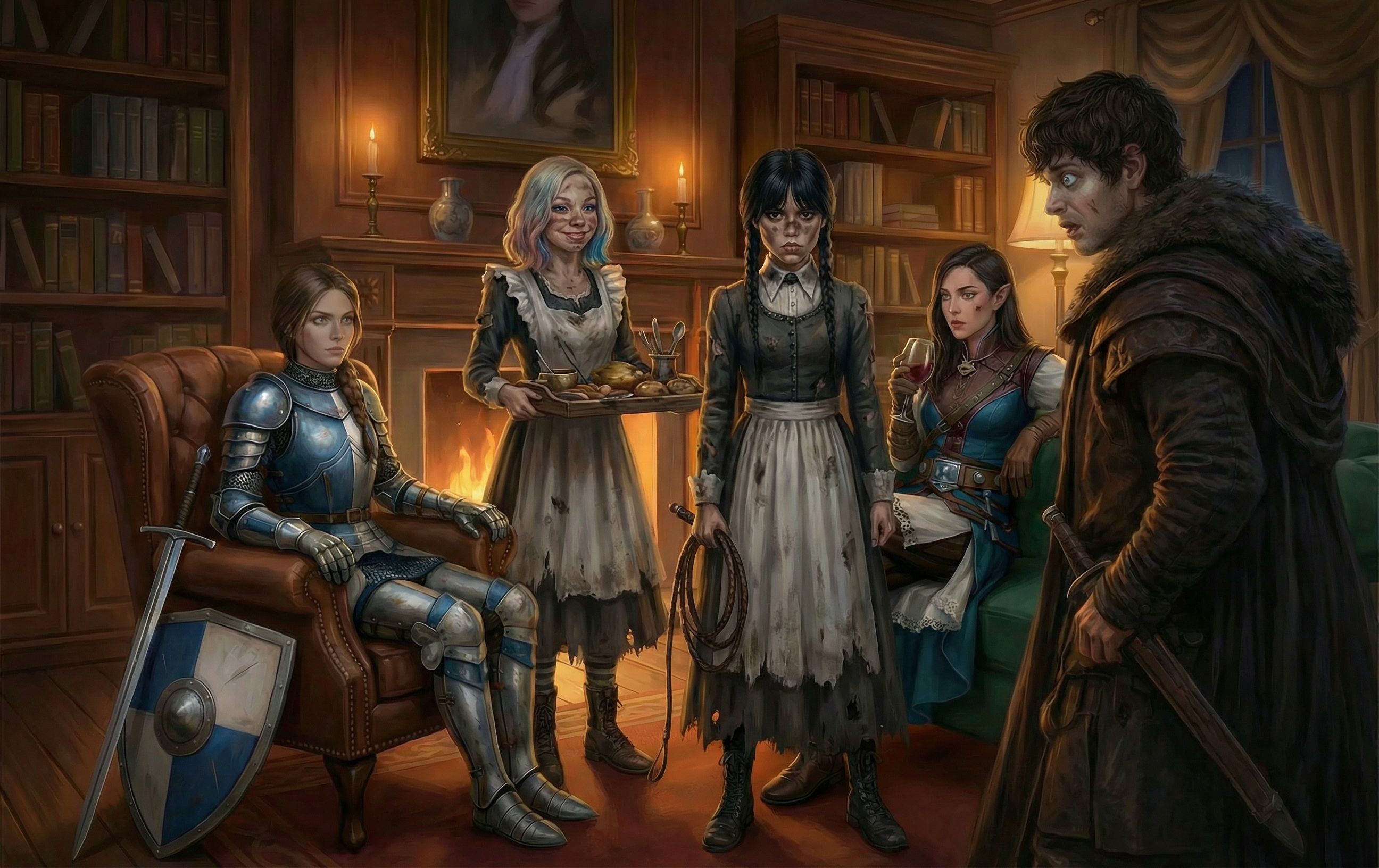 Внезапный шедевр без референсов, только текст: соотношение сторон изображение 4:3, фото на камеру, обьектив 60мм, джунгли, солнце пробивается сквозь деревья сверху вниз, в одежде исследователей 19 века, эмма маерс, аня тейлор джой, дженна ортега, грязные, вспотевшие, уставшие, несут инструменты исследователей джунглей 19 века, идут двое рядом, ортега чуть позади, мдут прямо на камеру и смотрят в камеру, вокруг свет в темноте пробивается свысока сквозь густые заросли джунглей