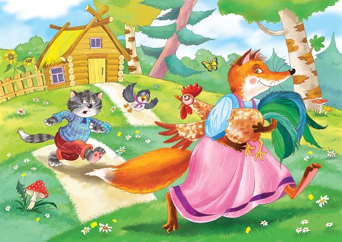 Так пела лисица, сидя под окном. Петух выставил окошко, высунул головку и посмотрел: кто тут поет? А лиса хвать его в когти и понесла в свою избушку. Петух закричал: >That's what the fox sang under the window. The cock unzipped the fly and sticked out his cock-head to look: who's singing. The fox grabbed him with her claws and carried to her foxhole. The cock cried: