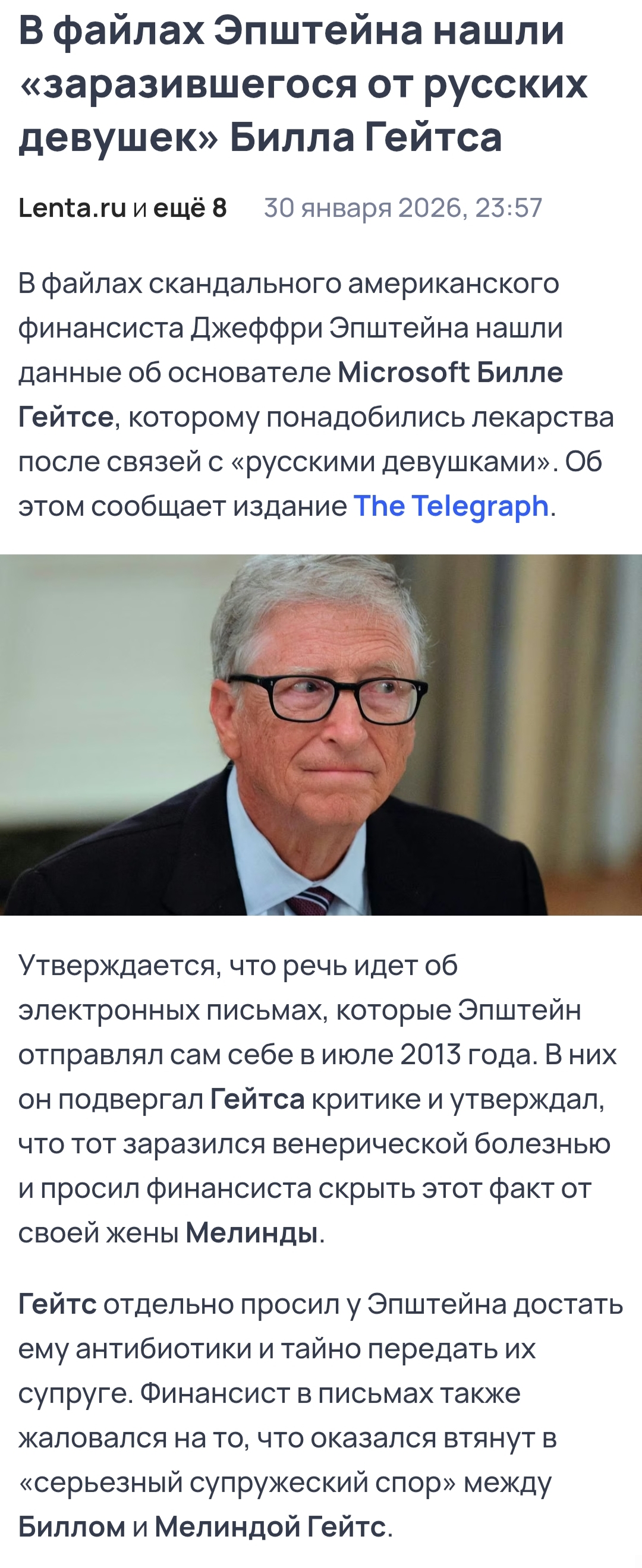 >>329305026 > потому что от них нельзя ничем заразится билл гейц заразился, заразил жену, а потом спрашивал у альбрехта эпштейна как незаметно подсыпать антибиотики жене в еду.