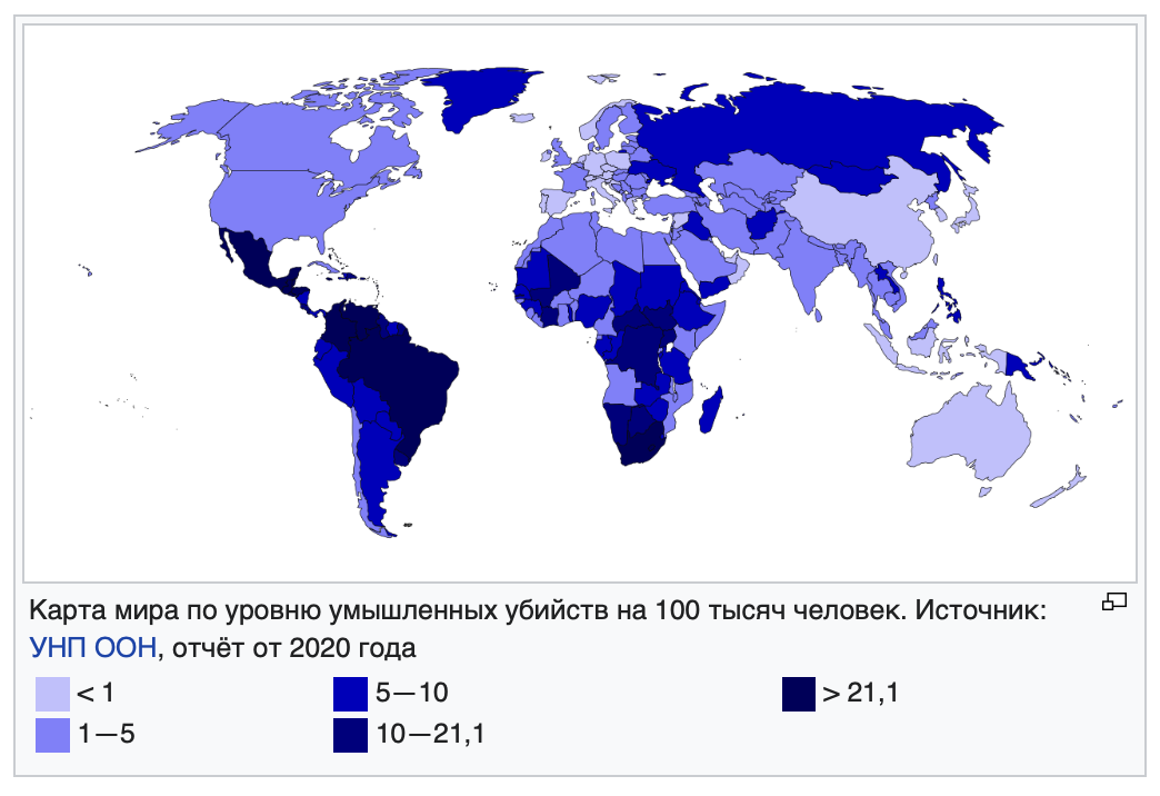 >При том, что в самом опасном месте, шанс того, что тебя кокнут, по статистике, которую ты привёл, Статистику? Я тебе пикчу прикрепил из википедии, чтобы показать, что есть страны в которых опасность выше или ниже