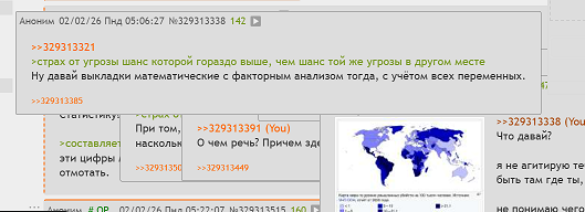 >>329313321 >страх от угрозы шанс которой гораздо выше, чем шанс той же угрозы в другом месте Ну давай выкладки математические с факторным анализом тогда, с учётом всех переменных.