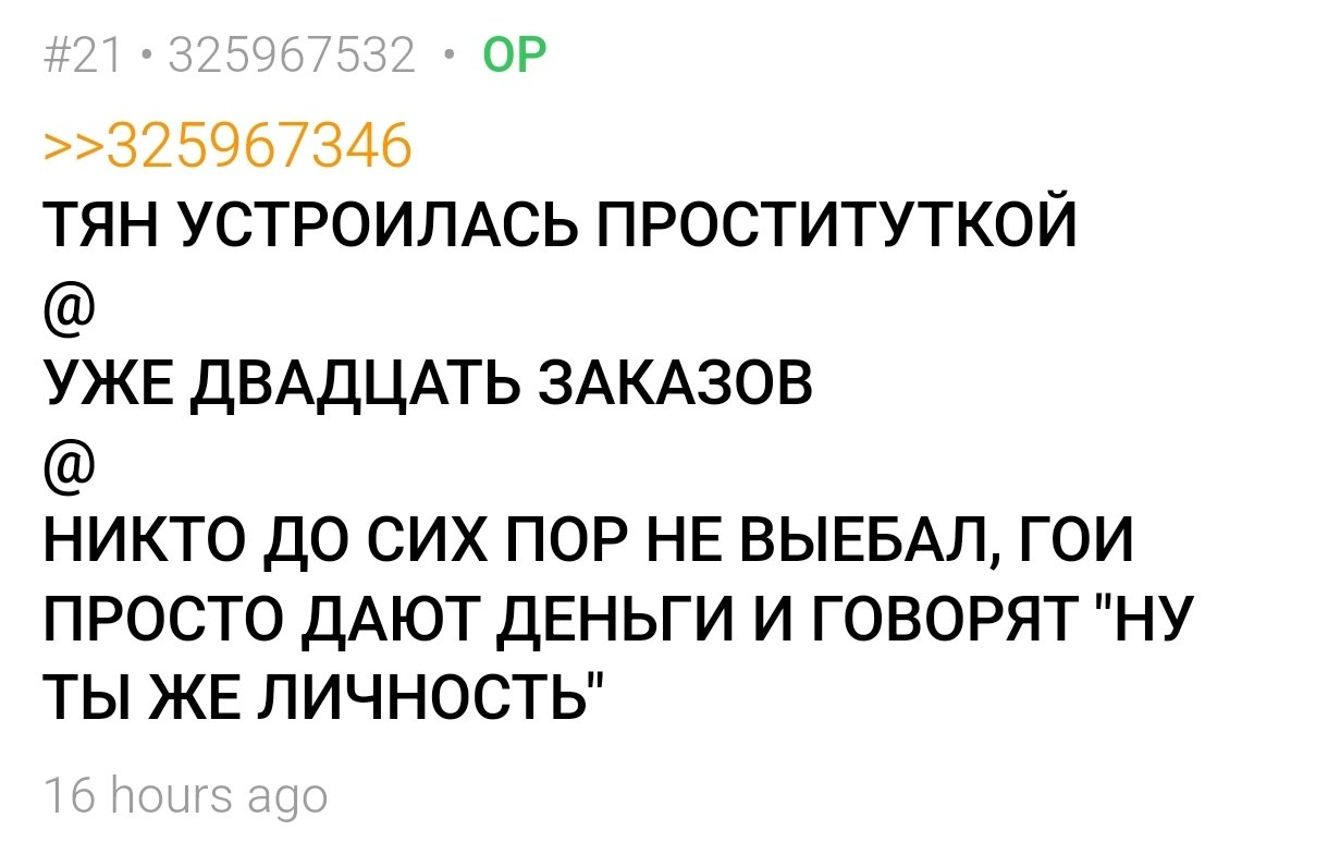 >>329395553 (OP) если бы задохнувшейся от копиума хуятине в этом треде тоже давали возможность заработать лёгкие деньги тут бы каждый первый согласился увы приходится искать проблемы в девушках