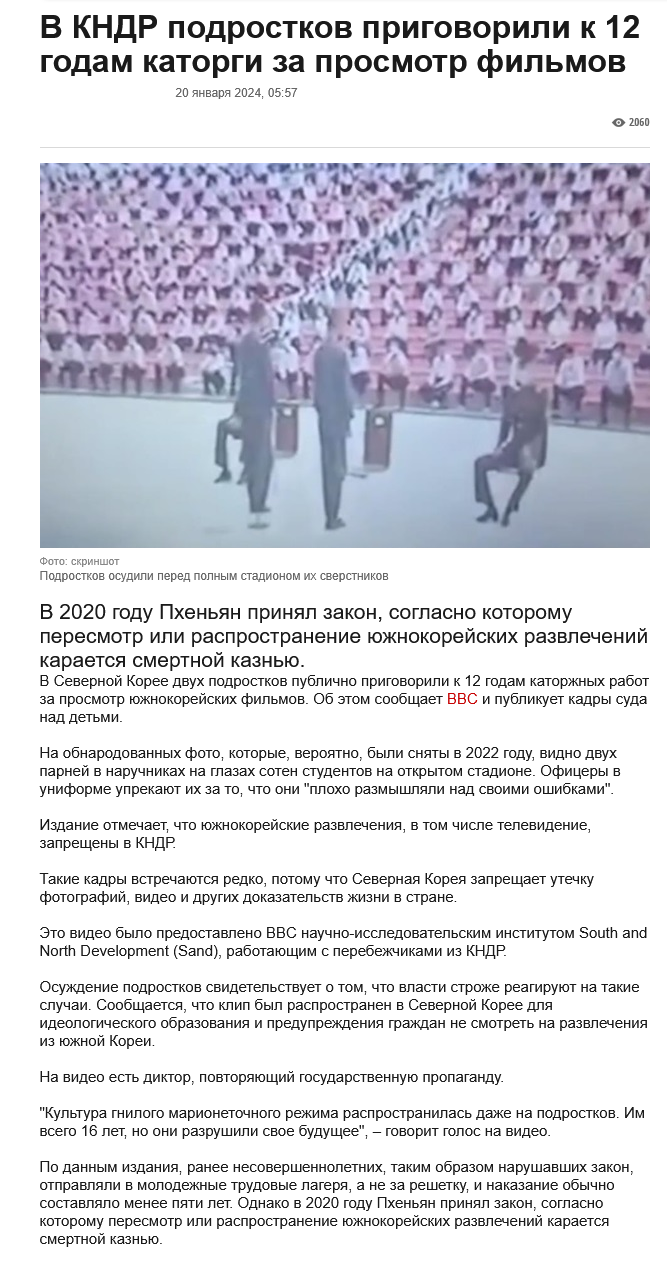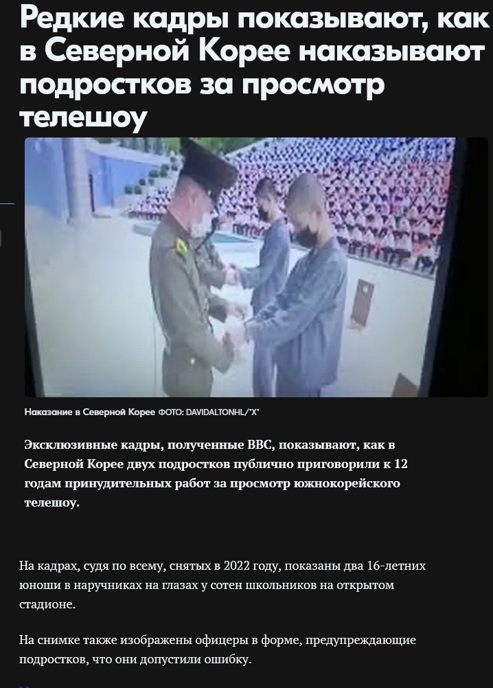 Классика двачерского ньюфага: взял одну байку и раздул в систему. В КНДР публичные казни бывают, но за реальные преступления типа саботажа или шпионажа, а не за сериальчики. Твои "свидетели" - те же, кто в 90-х орали про миллионы в лагерях, а потом цифры сдулись в разы. Это не воспитание, а твоя проекция на западные сказки про "жестокий тоталитаризм".
