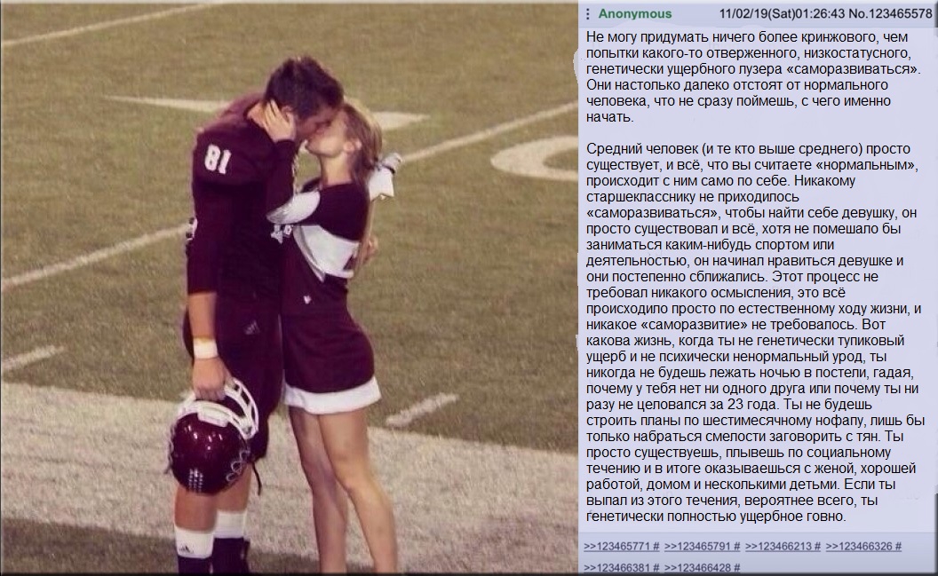 >>329435795 >Ну а я уже не 15-20 мальчик, не получится. То есть ты просто тупой и проебал свое время? >А ещё от ебли в попу с этой самой попой проблемы потом А то девок в попу не трахают, ну конечно. И от пиздосекса проблем не бывает. >А секс можно даже не давать, раз в месяц дать потыкать, а тебе уже должны. Так и живут. Ага. Все именно так. >>329435836 >Ничего хорошего ему не советуют. Я свою позицию высказал. >>329434034>>329434214>>329434637 >надо менять своё мировоззрение, а для этого надо много чего предпринять. Довольно мало. Либо идти ебаться с дегенератками, такими же как он, либо прокачивать межушный нервный узел. Это касается любого инцела. Диалог с ними невозможен, потому что они НАСТАИВАЮТ на своей шизе и ищут везде подтверждения таковой. А искать надо обратное, лол. Лучше конечно быть просто адекватным, но тут уж как получится.