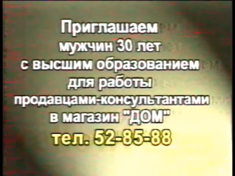 НОВОСТИ ПРО ОТКРЫТИЕ МЭРОМ ОБЩЕСТВЕННОГО ТУАЛЕТА (ПОСТРОЕН ИЗ КИРПИЧЕЙ С ЗАВОДА, ПРИНАДЛЕЖАЩЕГО ЕГО СЫНУ) @ РЕКЛАМНАЯ ПЕРЕДАЧА, ГДЕ ВЕДУЩИЕ РАЗЫГРЫВАЮТ ДИАЛОГИ С АКТЕРСКИМ МАСТЕРСТВОМ ЭДА ВУДА А ПОТОМ 20 МИНУТ ВЕРТЯТСЯ В ТРЯПКАХ ПОСРЕДИ ПРОПЛАТИВШЕГО ЭФИР МАГАЗИНА @ ТЕЛЕТЕКСТ - ПРОДАМ ГАРАЖ, АФГАНСКИЙ ГЕРОИН НАПРЯМУЮ ОТ ПОСТАВЩИКА, ПРЕДПРИЯТИЕ МУХОСРАНЬМЕТАЛЛ ПРЕДЛАГАЕТ ЖЕЛЕЗНОРУДНЫЕ ОКАТЫШИ С ВЫСОКИМ СОДЕРЖАНИЕМ ТАЛЛИЯ, БЕРИЛЛИЯ И РАДИЯ @ ЕЩЕ РЕКЛАМА - ШАПКИ ФОМАС, ТАКСИ ВЕТЕРОК - ИЗ ЧАСТИ В ЧАСТЬ ЗА 70 РУБЛЕЙ, ПОТОМСТВЕННЫЙ МАГ И ЦЕЛИТЕЛЬ СЕРГЕЙ ЛЕЧИТ ГЕМОРРОЙ, СПИД, ВОДОБОЯЗНЬ @ ЗАСТАВКА КАНАЛА, ЗАВИСШАЯ В КОНЦЕ НА 10 МИНУТ @ НАКОНЕЦ ВКЛЮЧАЮТ КАРТИНКУ С СТС - НА СЕРЕДИНЕ ФИЛЬМА