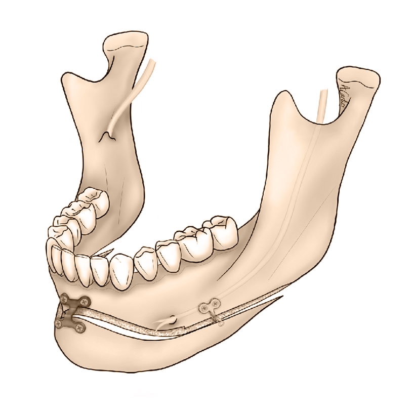 Делал тоже у Андреищева ДС2 300К, называется long chin wing, как на скринах, еще есть вариант когда режется вместе с углами боковыми нижней челюсти для еще более широкой в анфас челюсти. разрез делается внутри под нижней губой и идёт на бока почти до последнего зуба, край нижней челюсти пилится и выдвигается на трех титановых штифтах, которые остаются навсегда, их не чувствуешь, на прикус это никак не влияет.