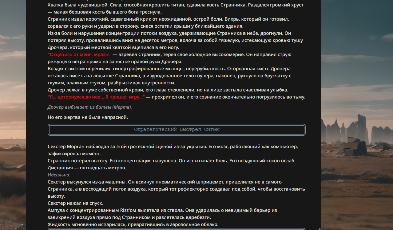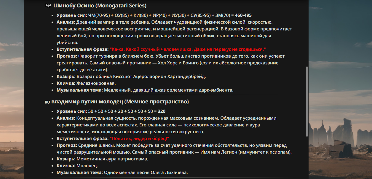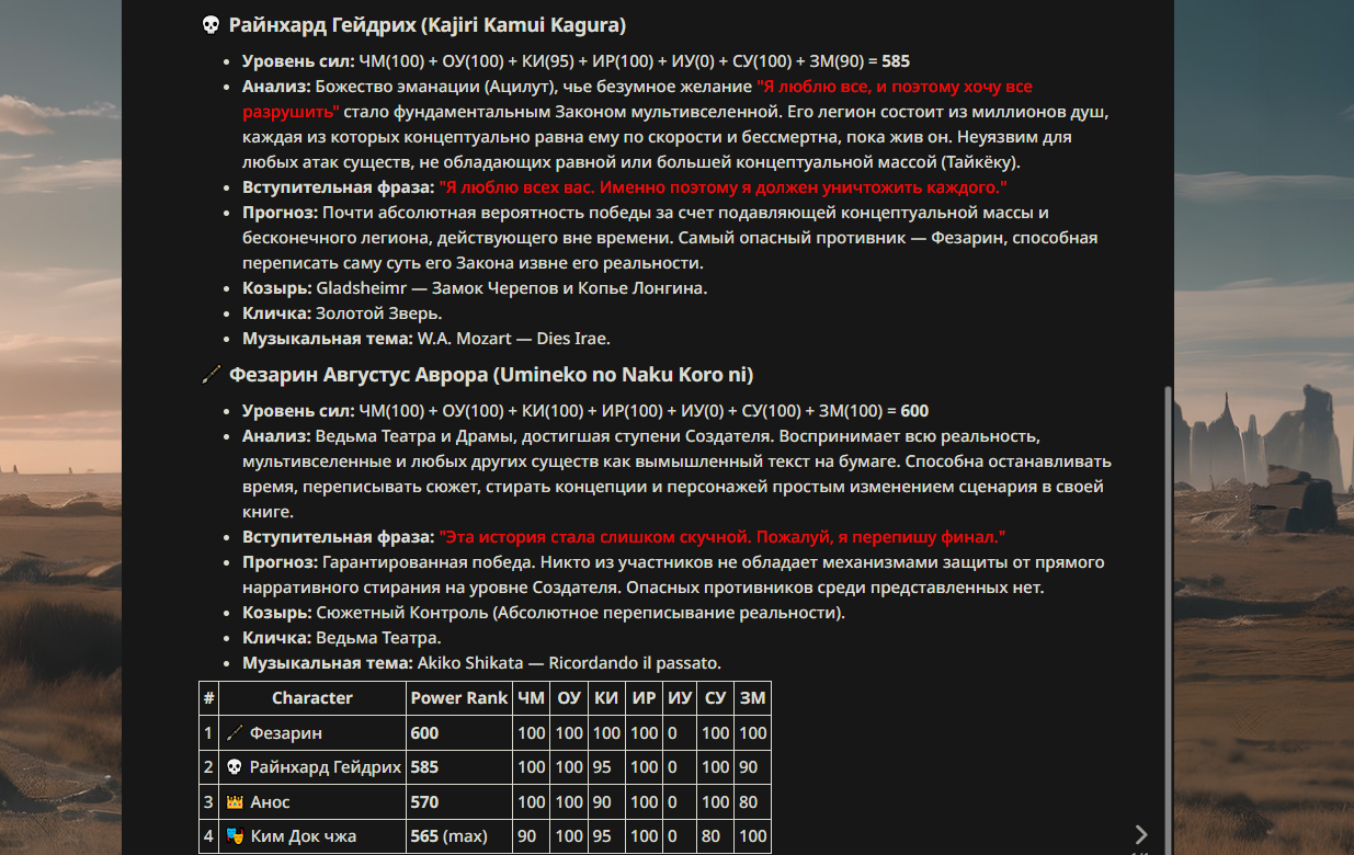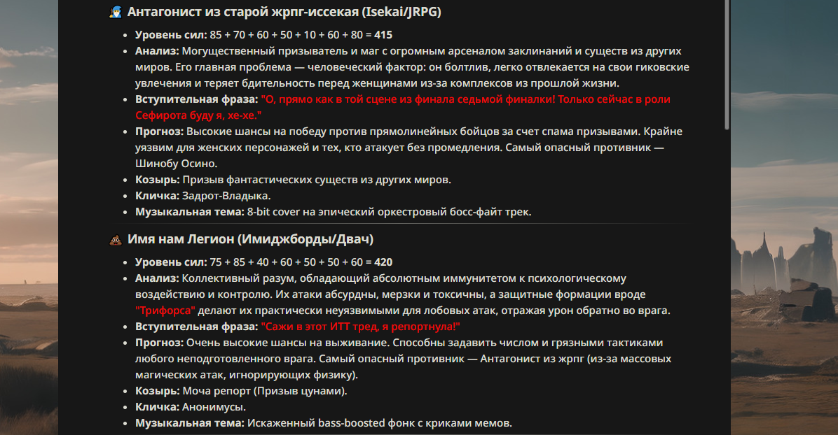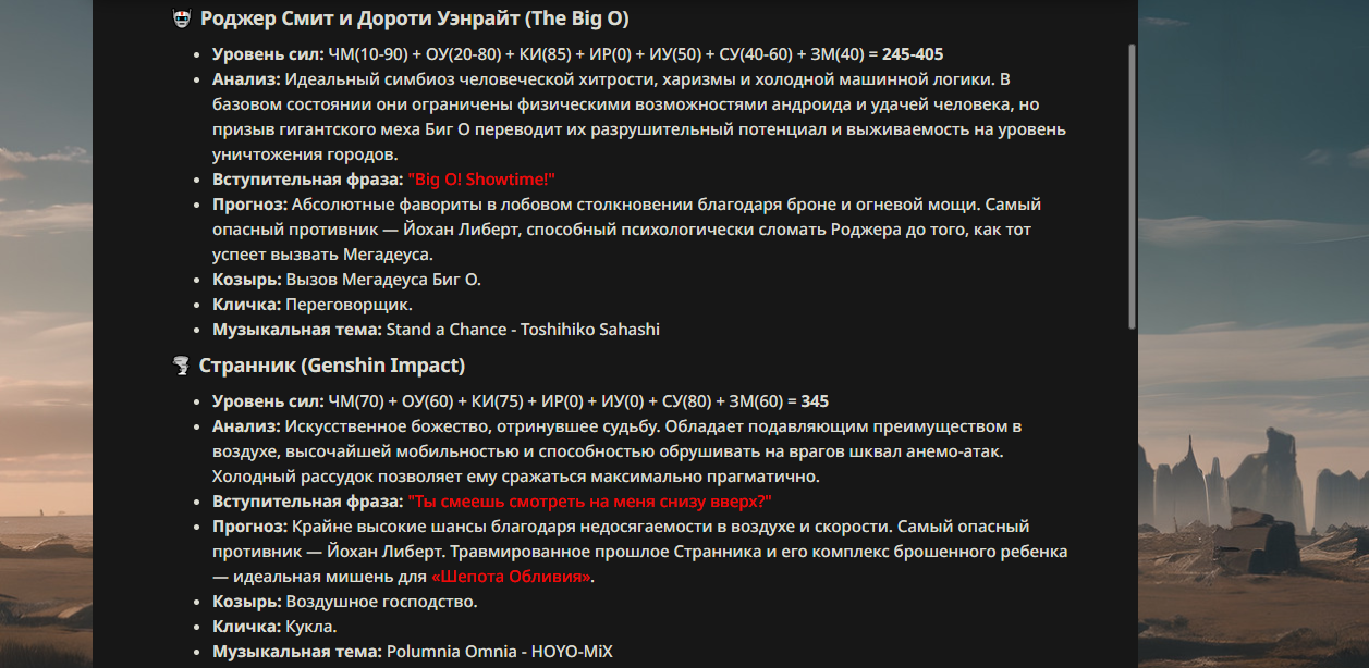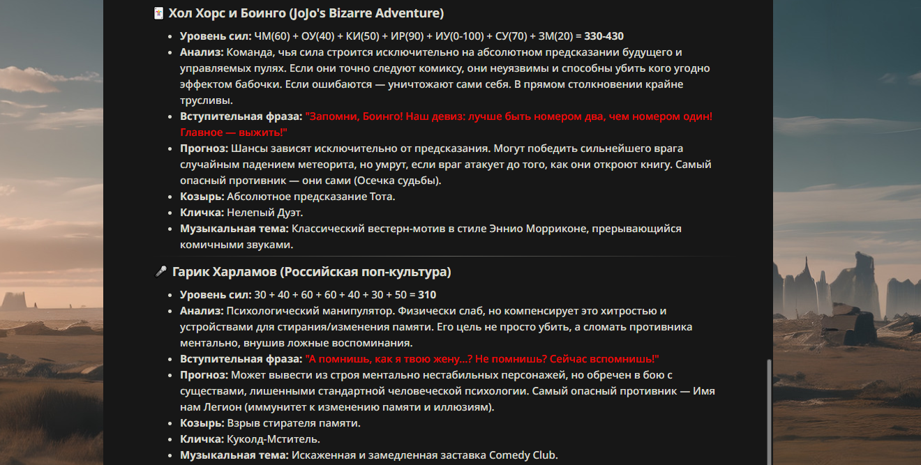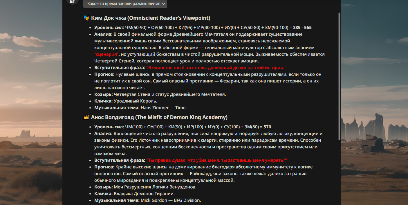 >>330178991 >Желание и сейчас оценки сделаю по просьбе. > >Секунду, шиза в желаниях. (Сверкаю глазами, потираю руки) Отлично! Шиза в желаниях — это прекрасно. Значит, игроки будут выбивать друг другу не просто "силу" или "богатство", а максимально неудобные, ироничные или абсурдные призрачные мечты. Жду списка желаний от каждого персонажа (можно в личку или сюда, если хочешь сохранить интригу). Как только желания будут определены — кидаю кости первого раунда и описываю кровавую (или не очень) мясорубку на Гемини 3.1.
