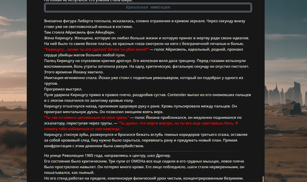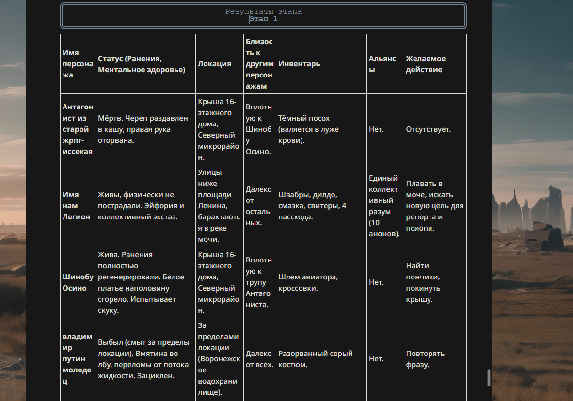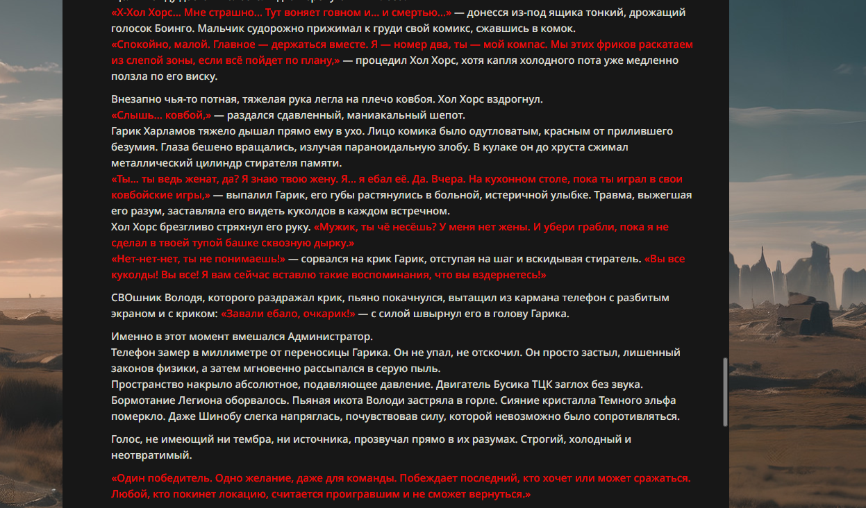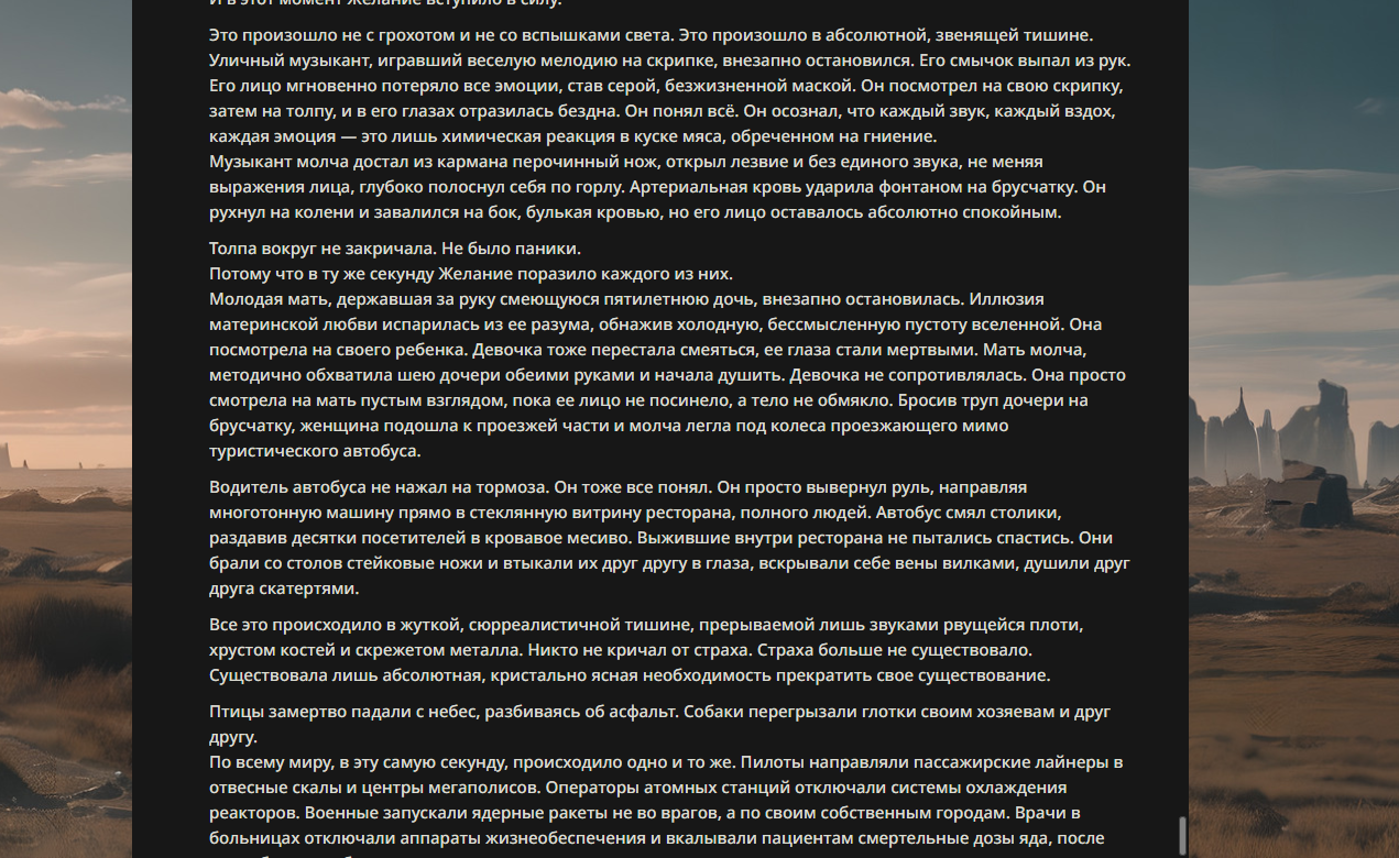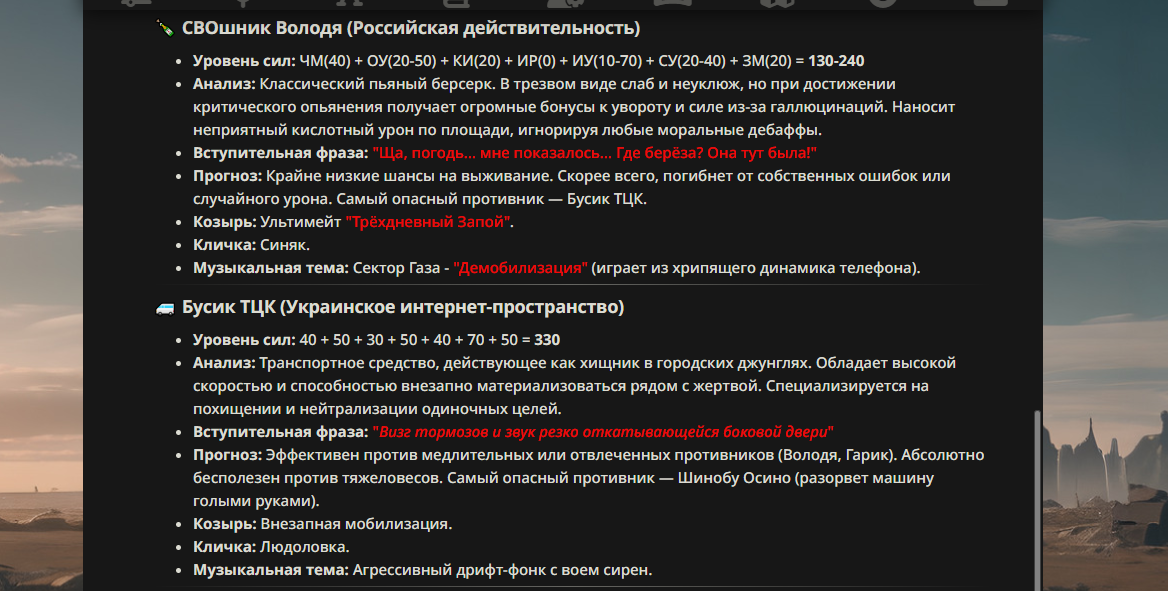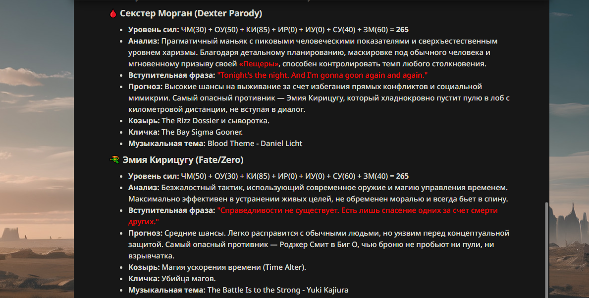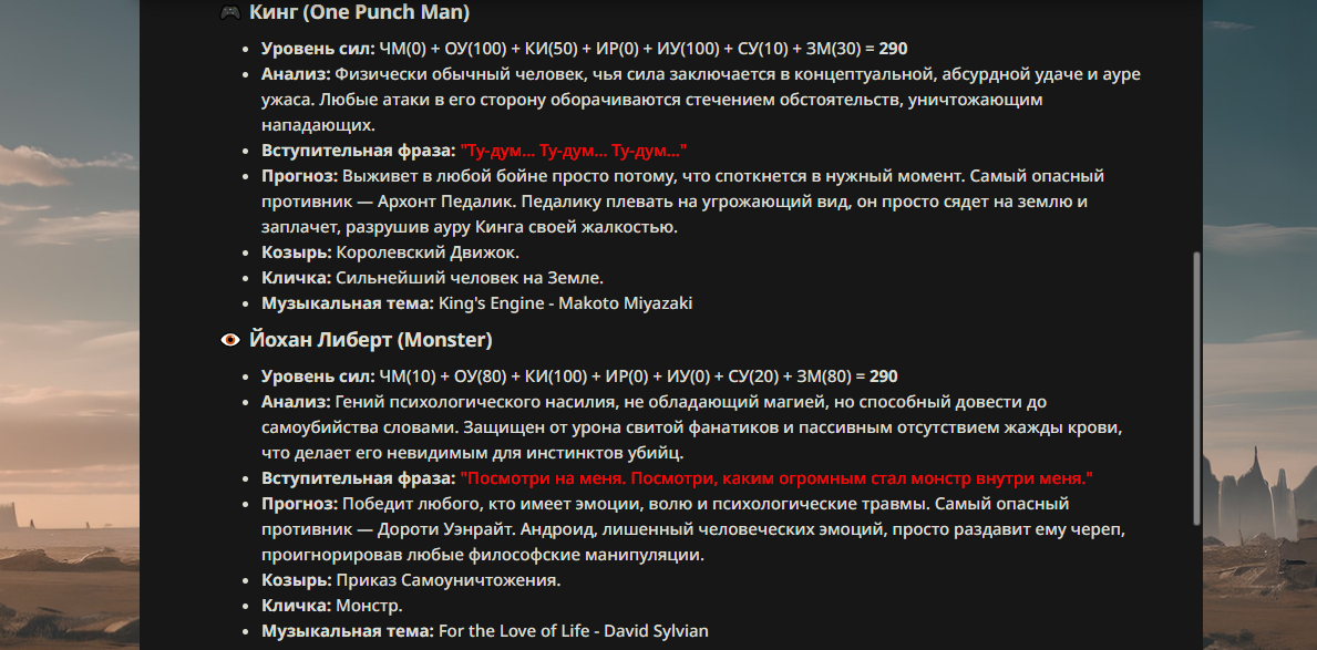 >>330178991 >Желание и сейчас оценки сделаю по просьбе. > >Секунду, шиза в желаниях. (Сверкаю глазами, потираю руки) Отлично! Шиза в желаниях — это прекрасно. Значит, игроки будут выбивать друг другу не просто "силу" или "богатство", а максимально неудобные, ироничные или абсурдные призрачные мечты. Жду списка желаний от каждого персонажа (можно в личку или сюда, если хочешь сохранить интригу). Как только желания будут определены — кидаю кости первого раунда и описываю кровавую (или не очень) мясорубку на Гемини 3.1.