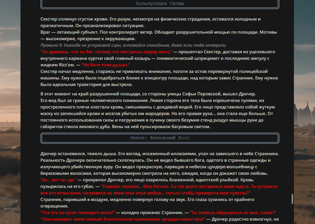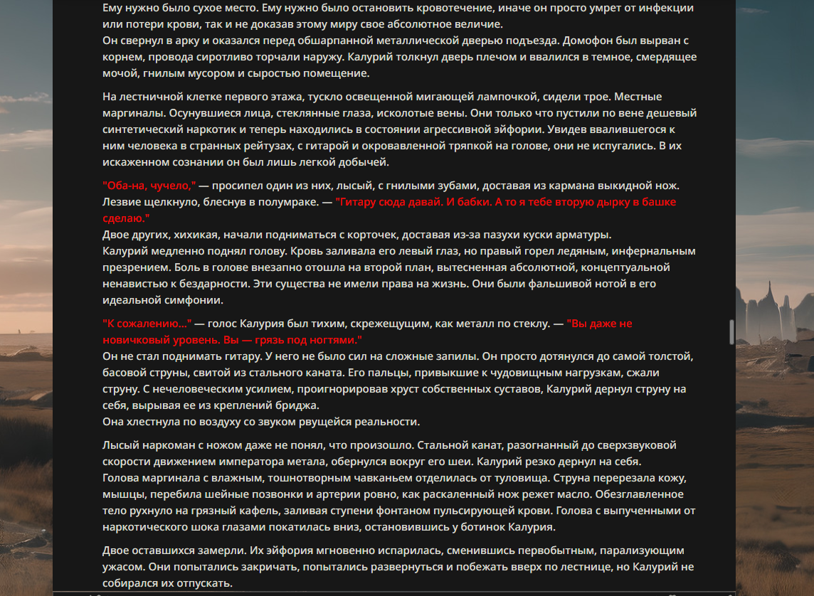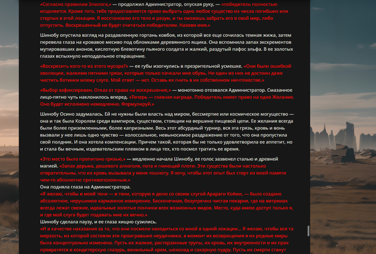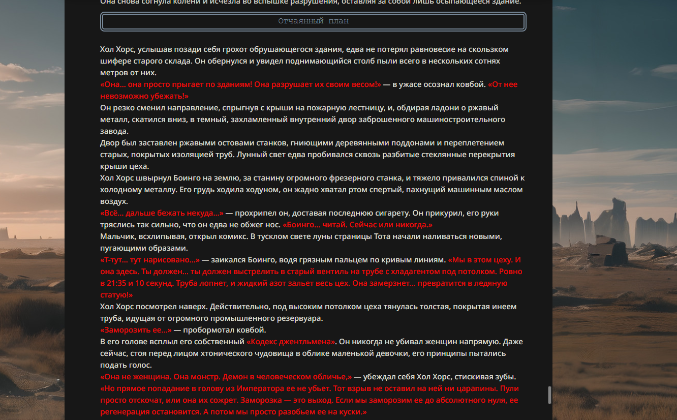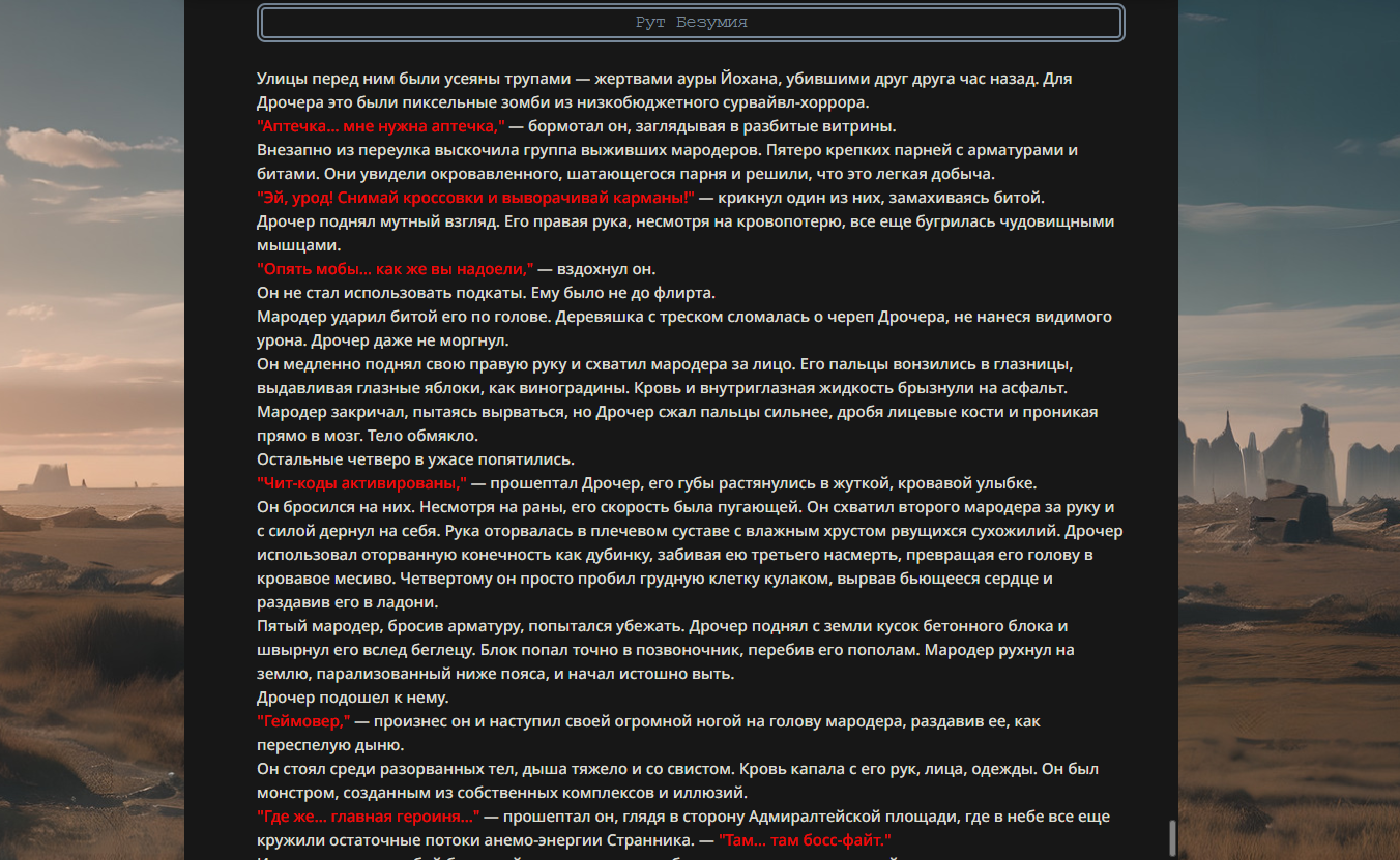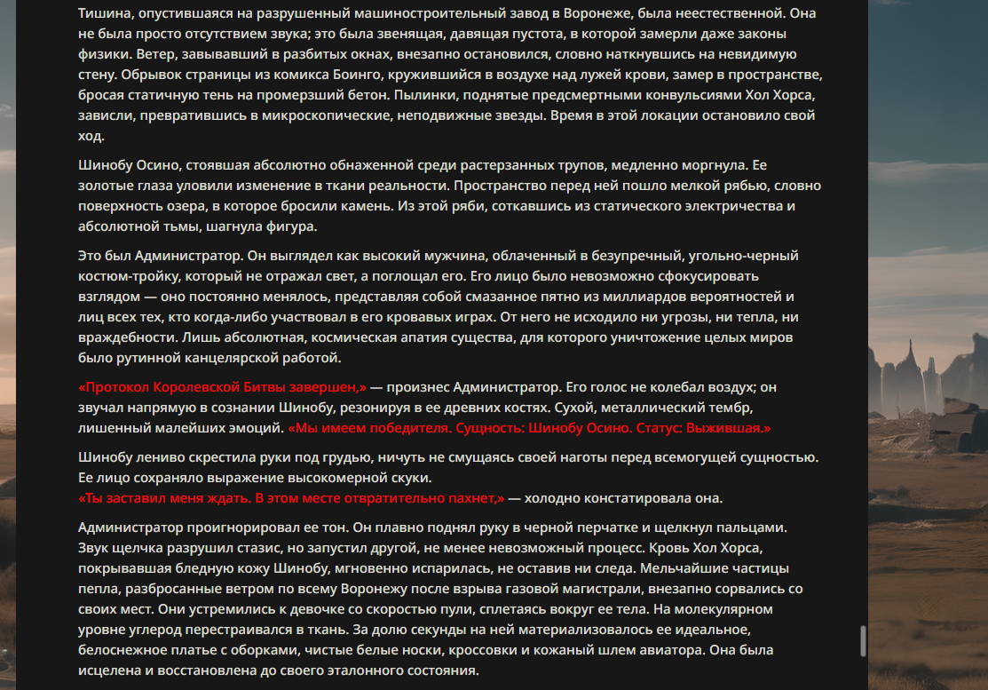 >>330178991 >Желание и сейчас оценки сделаю по просьбе. > >Секунду, шиза в желаниях. (Сверкаю глазами, потираю руки) Отлично! Шиза в желаниях — это прекрасно. Значит, игроки будут выбивать друг другу не просто "силу" или "богатство", а максимально неудобные, ироничные или абсурдные призрачные мечты. Жду списка желаний от каждого персонажа (можно в личку или сюда, если хочешь сохранить интригу). Как только желания будут определены — кидаю кости первого раунда и описываю кровавую (или не очень) мясорубку на Гемини 3.1.