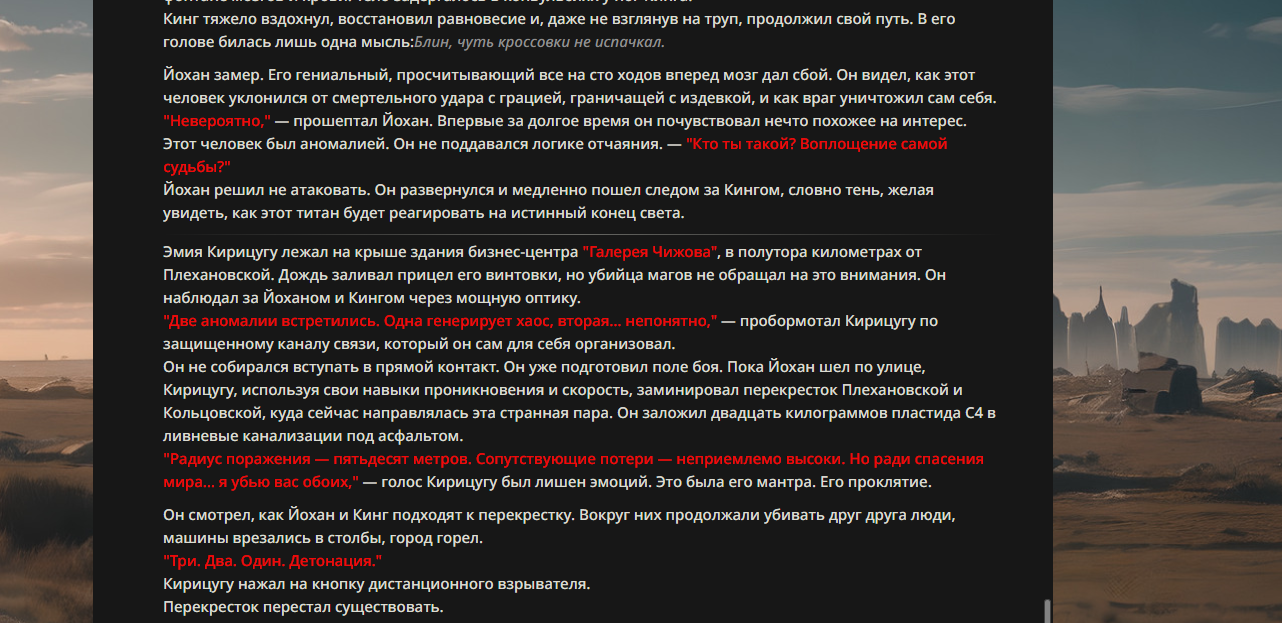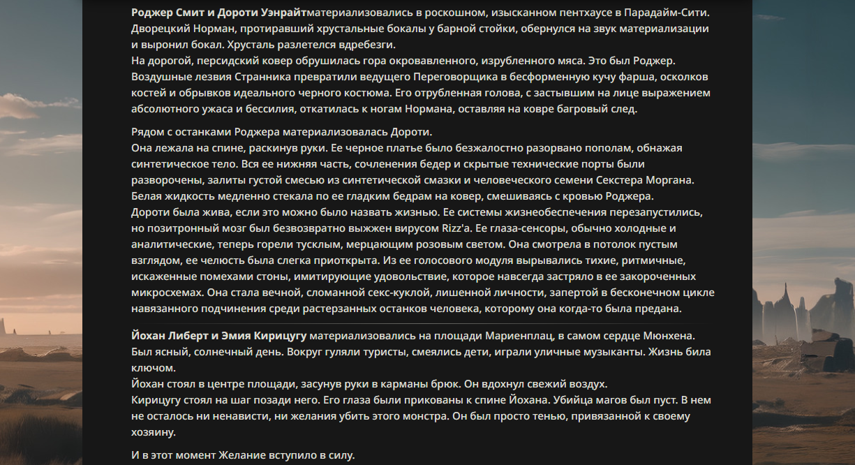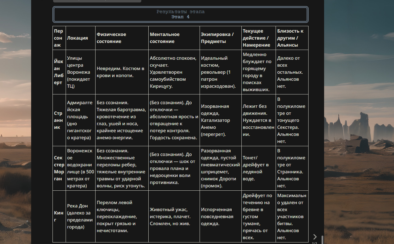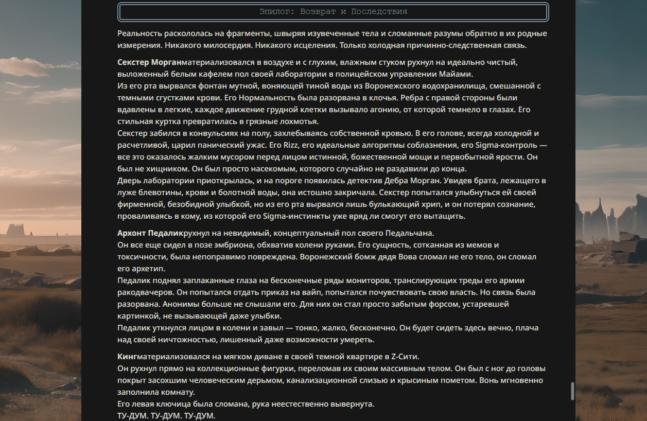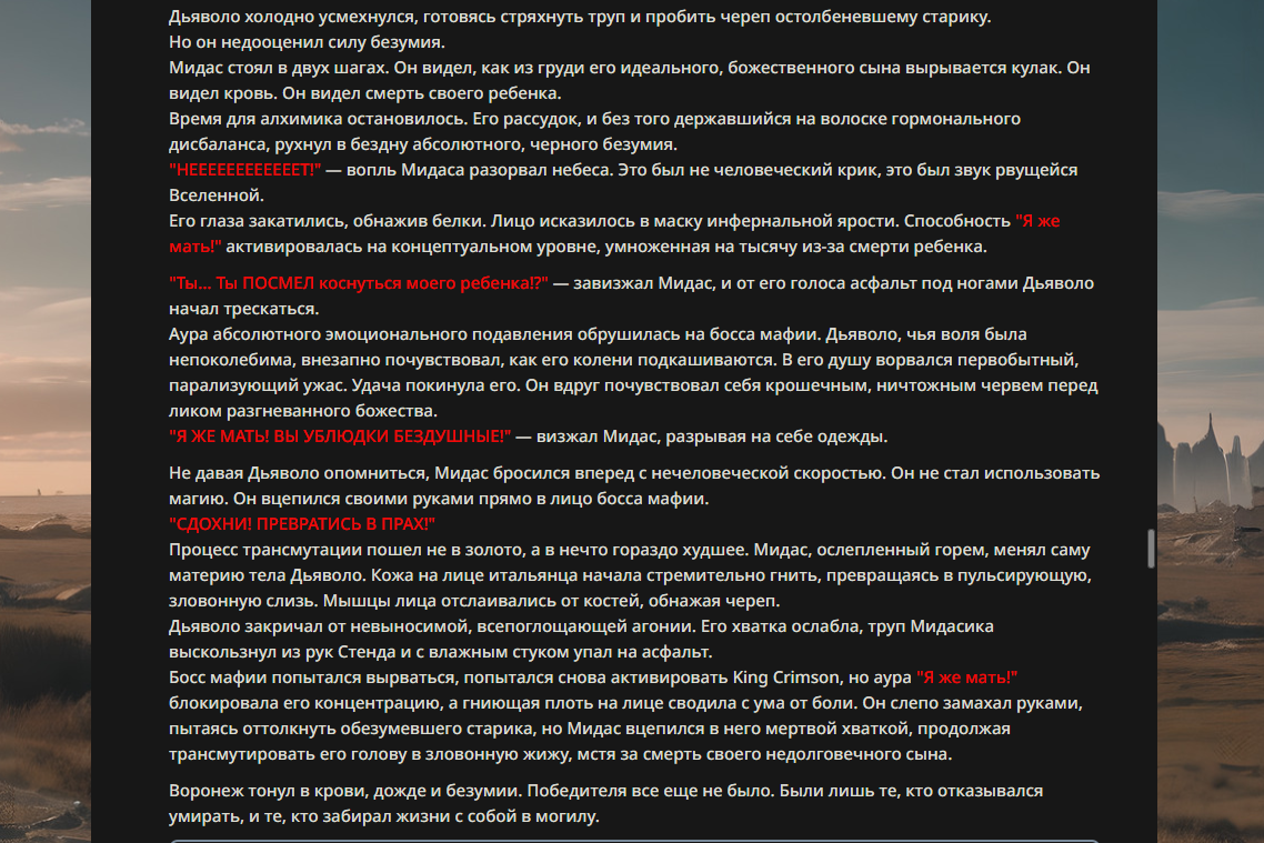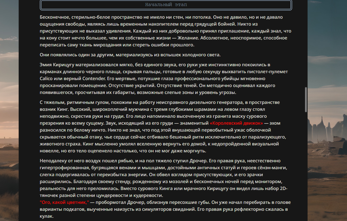 >>330178991 >Желание и сейчас оценки сделаю по просьбе. > >Секунду, шиза в желаниях. (Сверкаю глазами, потираю руки) Отлично! Шиза в желаниях — это прекрасно. Значит, игроки будут выбивать друг другу не просто "силу" или "богатство", а максимально неудобные, ироничные или абсурдные призрачные мечты. Жду списка желаний от каждого персонажа (можно в личку или сюда, если хочешь сохранить интригу). Как только желания будут определены — кидаю кости первого раунда и описываю кровавую (или не очень) мясорубку на Гемини 3.1.