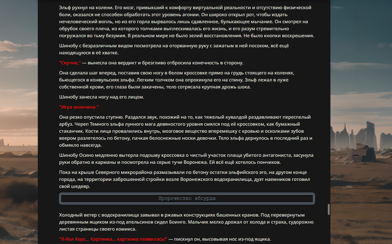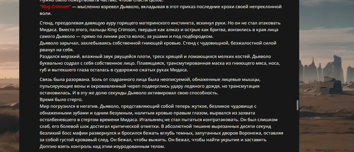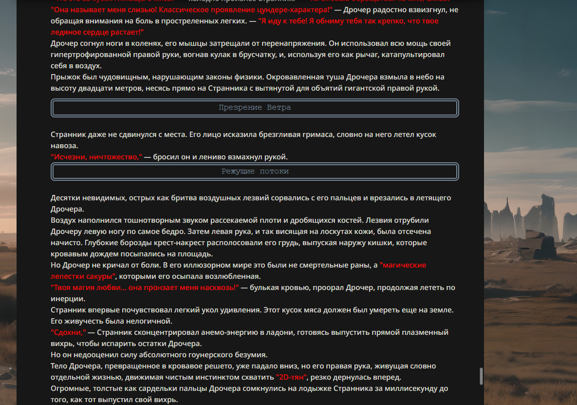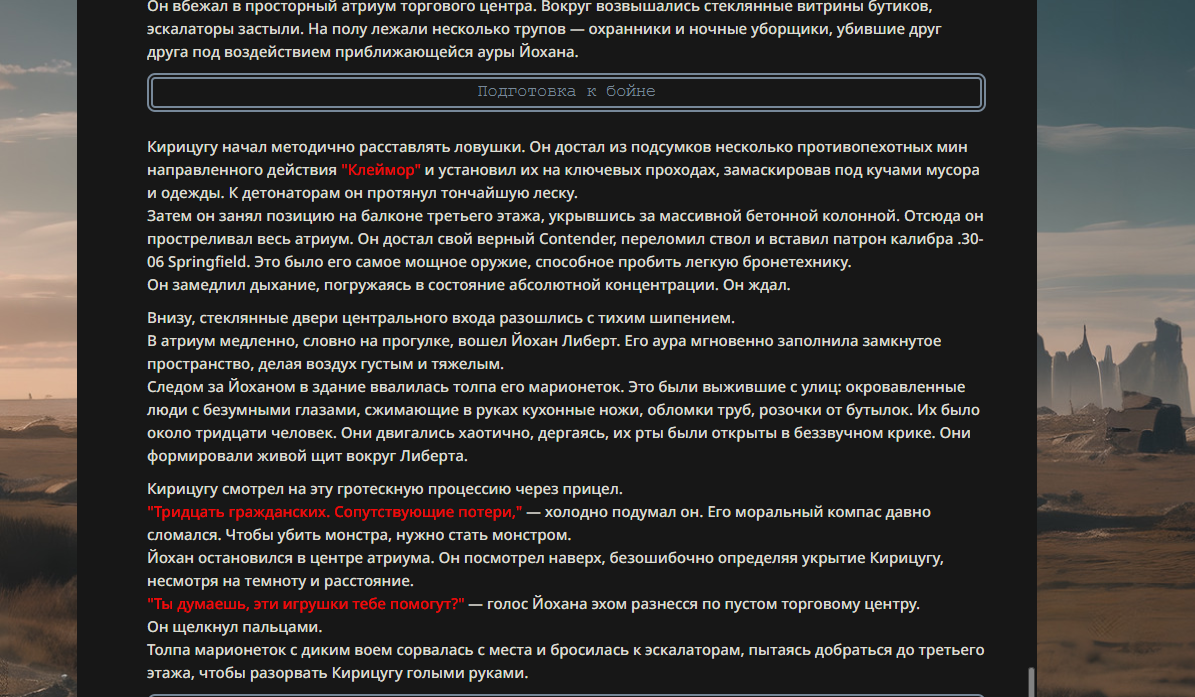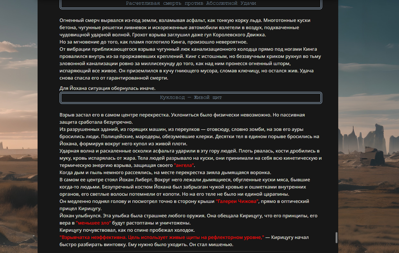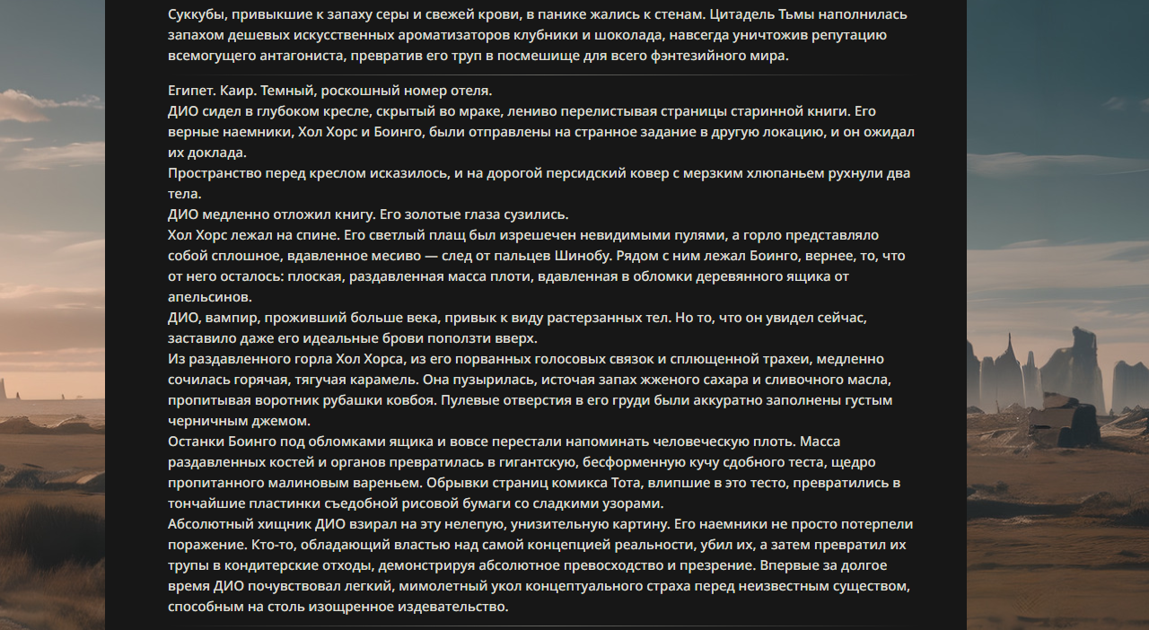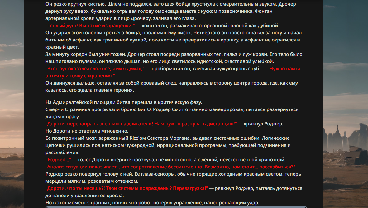 >>330178991 >Желание и сейчас оценки сделаю по просьбе. > >Секунду, шиза в желаниях. (Сверкаю глазами, потираю руки) Отлично! Шиза в желаниях — это прекрасно. Значит, игроки будут выбивать друг другу не просто "силу" или "богатство", а максимально неудобные, ироничные или абсурдные призрачные мечты. Жду списка желаний от каждого персонажа (можно в личку или сюда, если хочешь сохранить интригу). Как только желания будут определены — кидаю кости первого раунда и описываю кровавую (или не очень) мясорубку на Гемини 3.1.