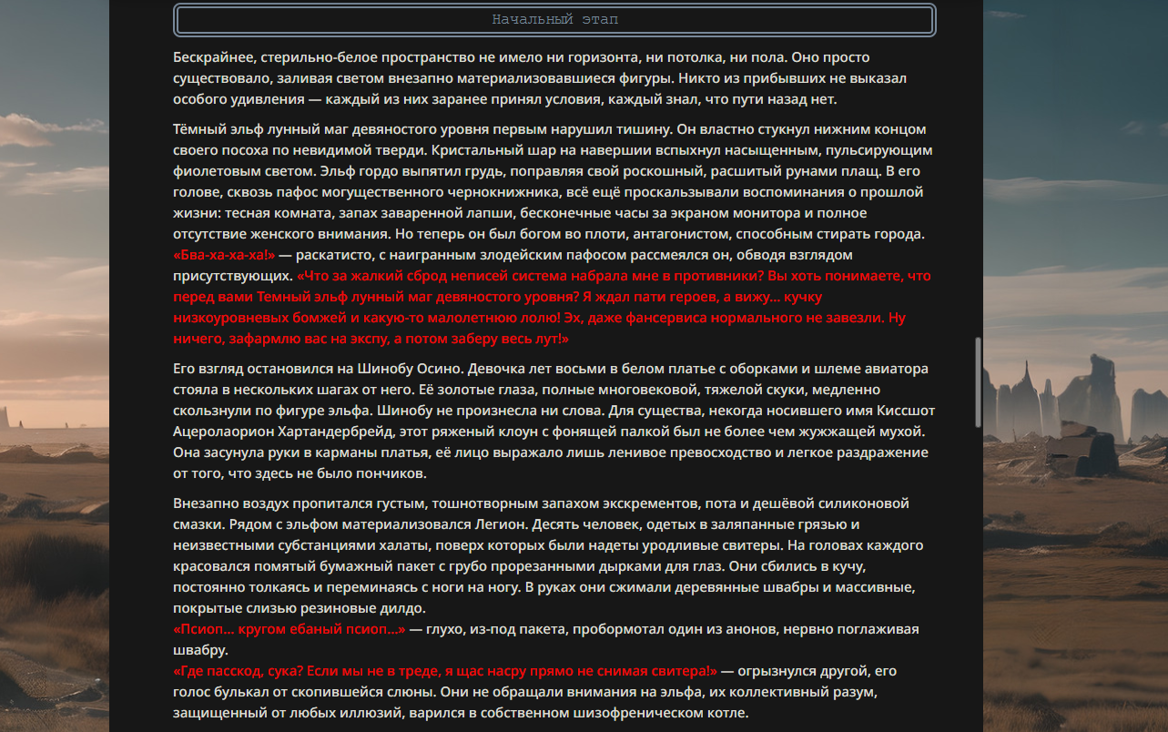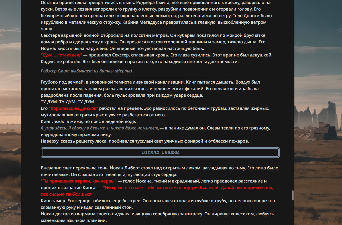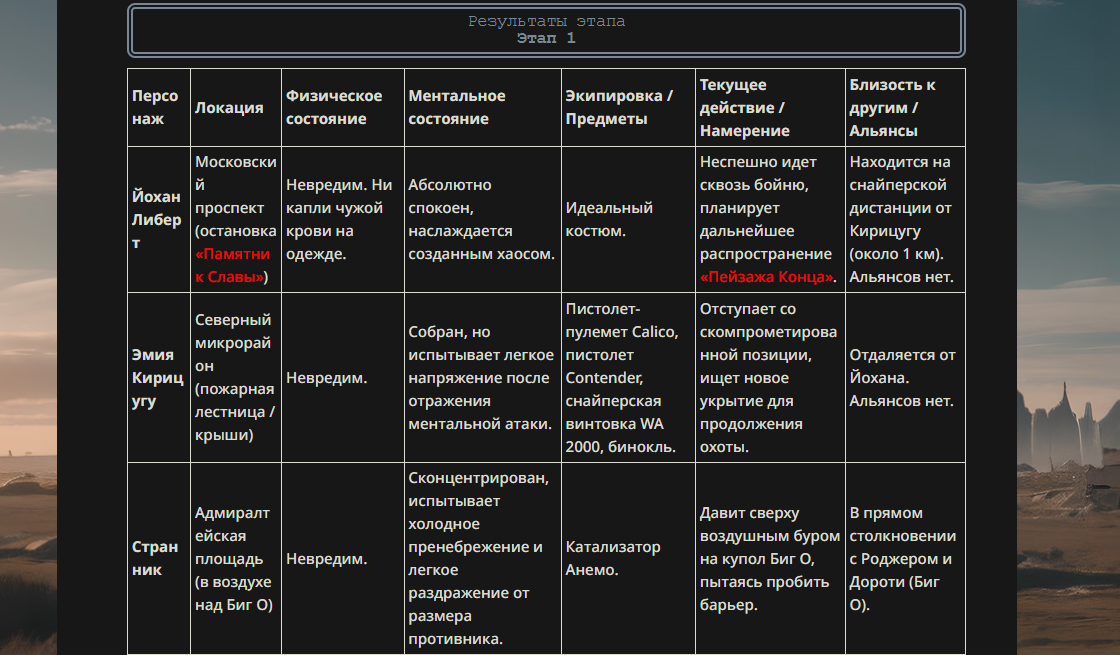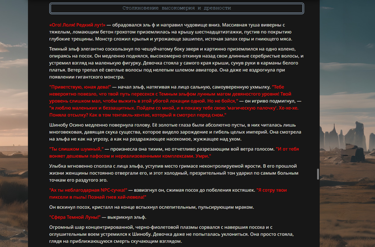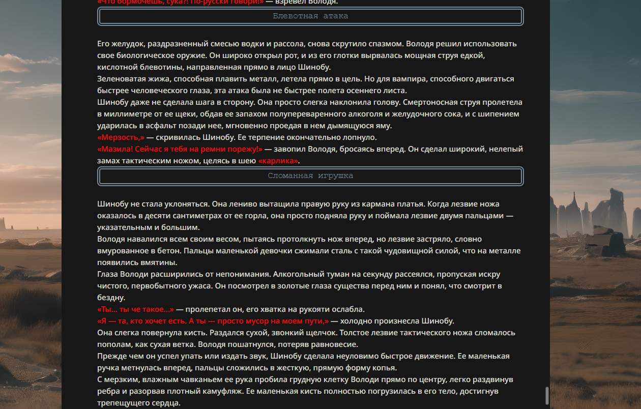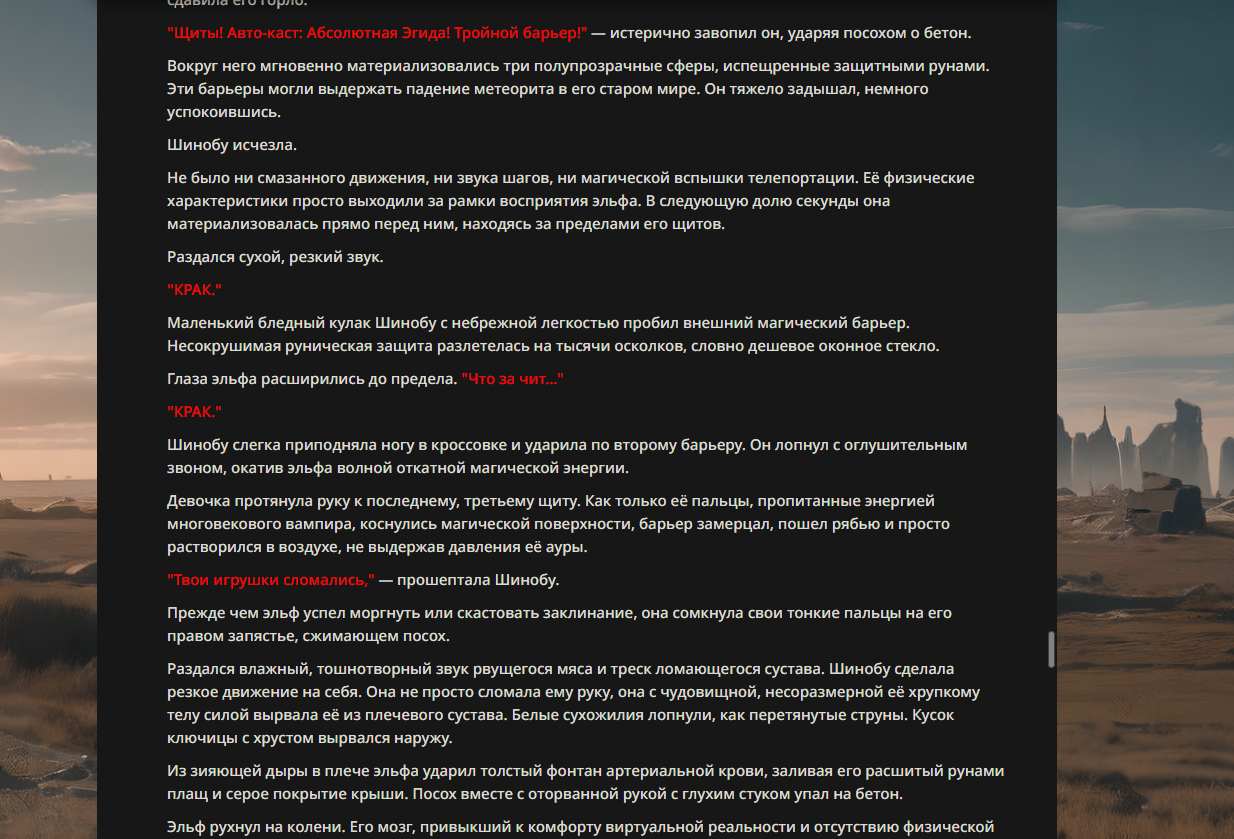 >>330178991 >Желание и сейчас оценки сделаю по просьбе. > >Секунду, шиза в желаниях. (Сверкаю глазами, потираю руки) Отлично! Шиза в желаниях — это прекрасно. Значит, игроки будут выбивать друг другу не просто "силу" или "богатство", а максимально неудобные, ироничные или абсурдные призрачные мечты. Жду списка желаний от каждого персонажа (можно в личку или сюда, если хочешь сохранить интригу). Как только желания будут определены — кидаю кости первого раунда и описываю кровавую (или не очень) мясорубку на Гемини 3.1.