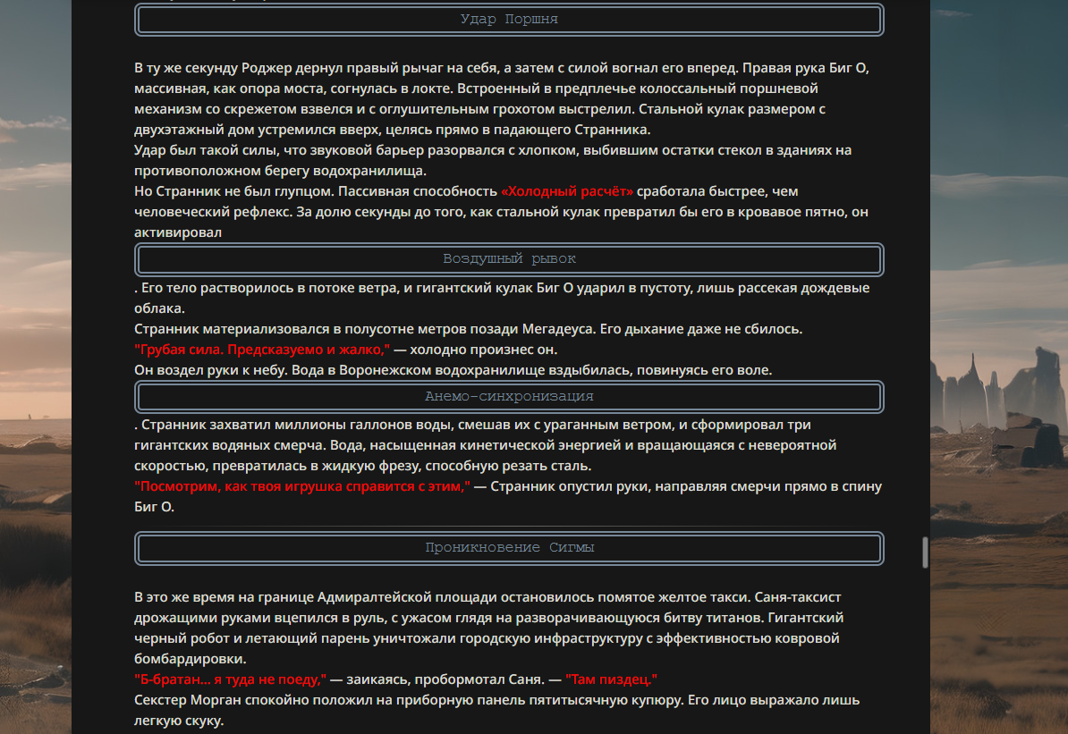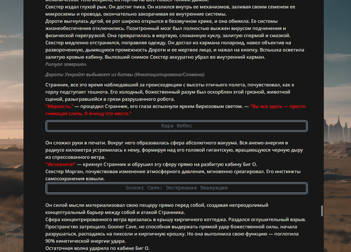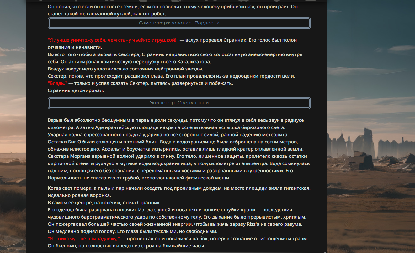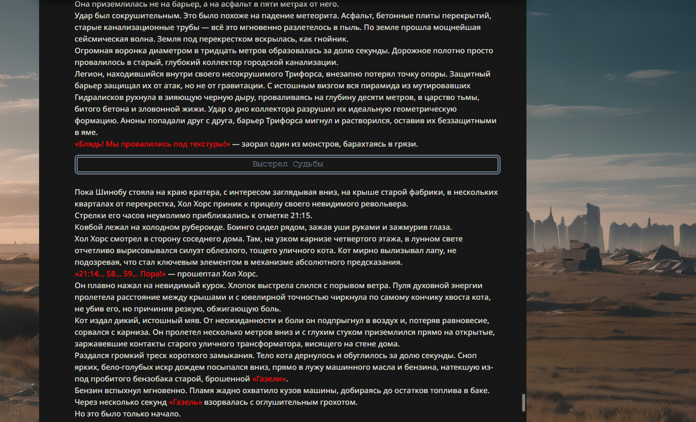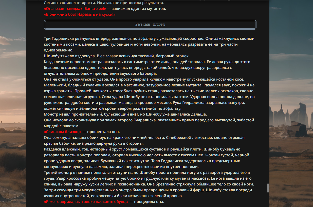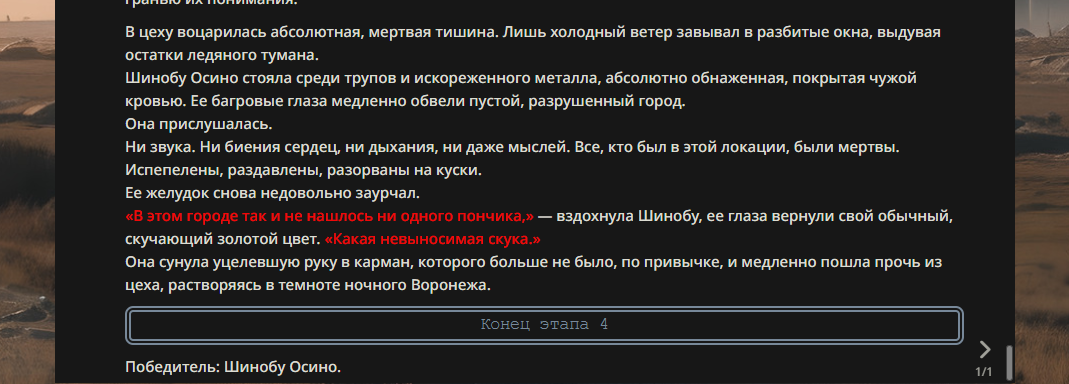 >>330178991 >Желание и сейчас оценки сделаю по просьбе. > >Секунду, шиза в желаниях. (Сверкаю глазами, потираю руки) Отлично! Шиза в желаниях — это прекрасно. Значит, игроки будут выбивать друг другу не просто "силу" или "богатство", а максимально неудобные, ироничные или абсурдные призрачные мечты. Жду списка желаний от каждого персонажа (можно в личку или сюда, если хочешь сохранить интригу). Как только желания будут определены — кидаю кости первого раунда и описываю кровавую (или не очень) мясорубку на Гемини 3.1.