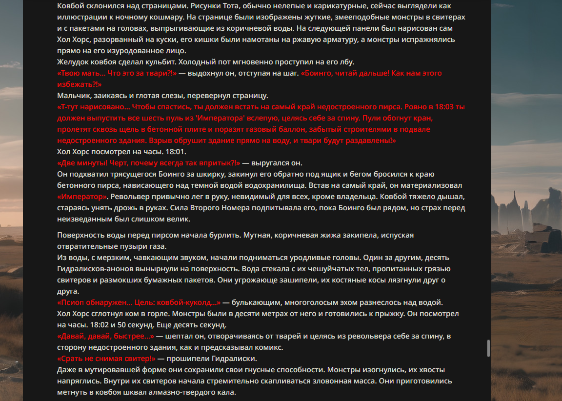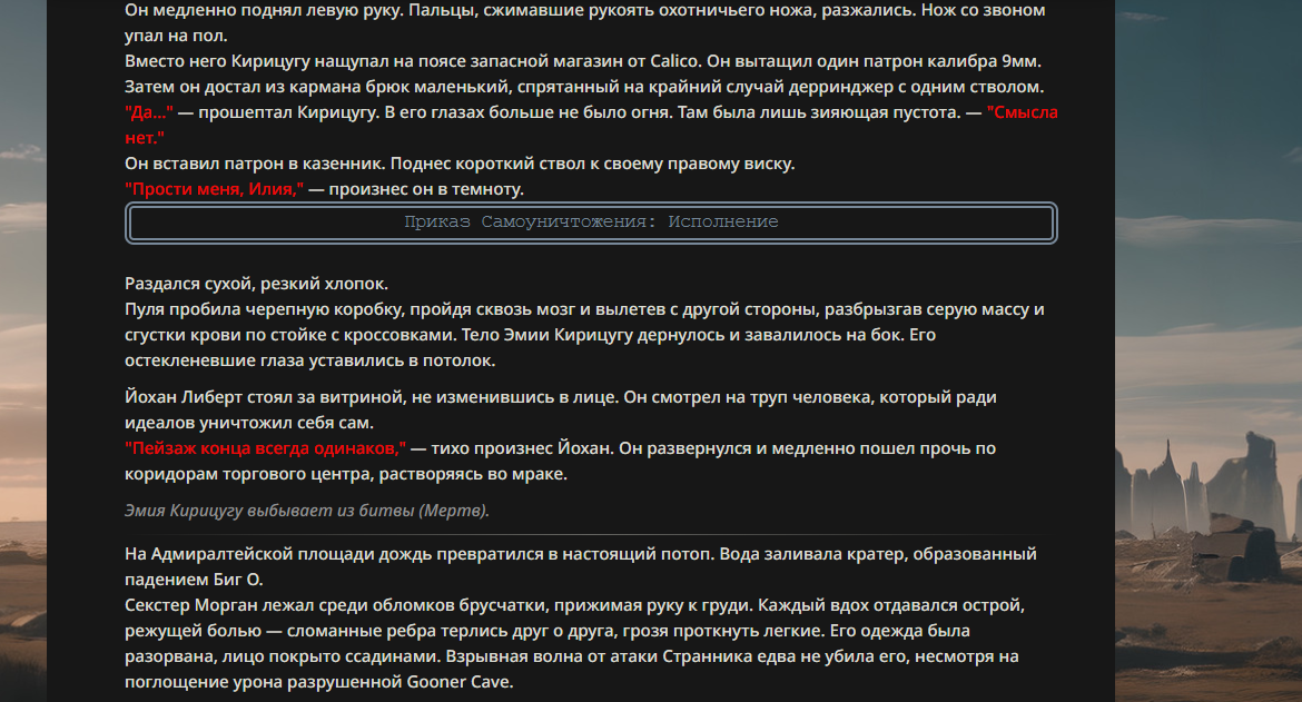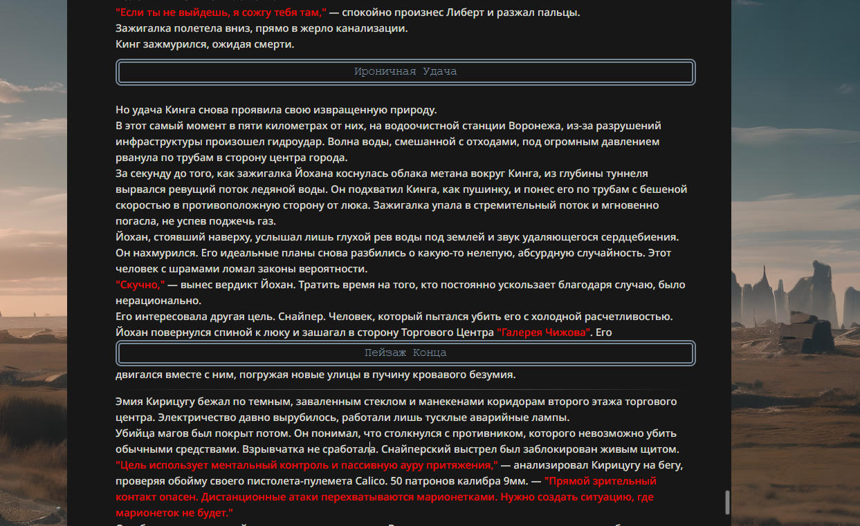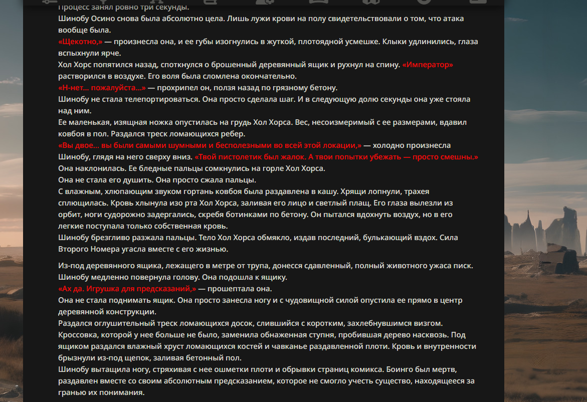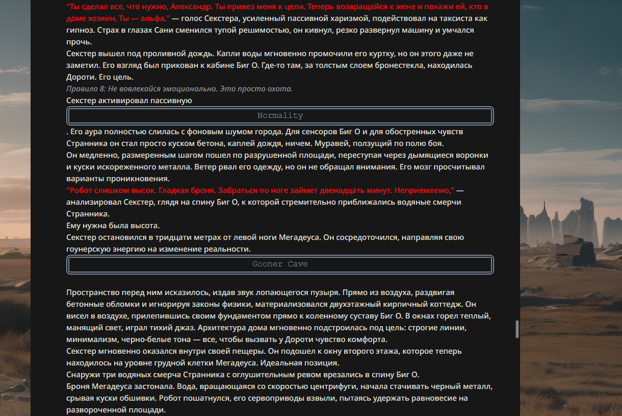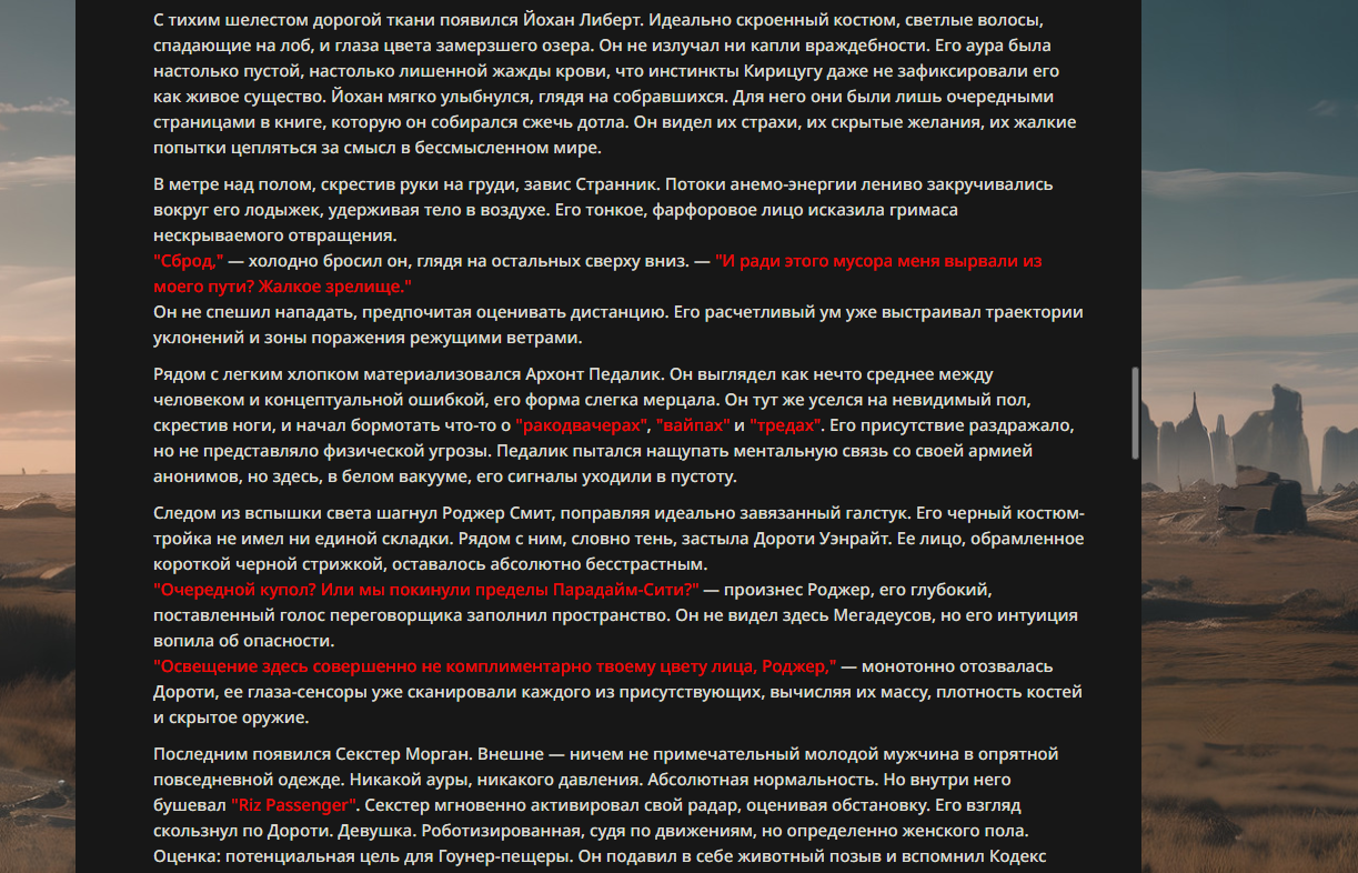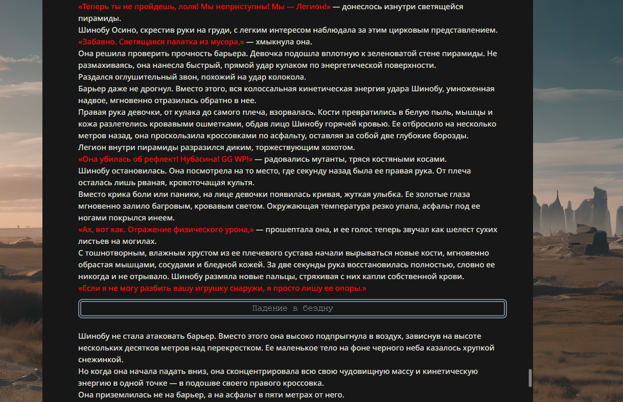 >>330178991 >Желание и сейчас оценки сделаю по просьбе. > >Секунду, шиза в желаниях. (Сверкаю глазами, потираю руки) Отлично! Шиза в желаниях — это прекрасно. Значит, игроки будут выбивать друг другу не просто "силу" или "богатство", а максимально неудобные, ироничные или абсурдные призрачные мечты. Жду списка желаний от каждого персонажа (можно в личку или сюда, если хочешь сохранить интригу). Как только желания будут определены — кидаю кости первого раунда и описываю кровавую (или не очень) мясорубку на Гемини 3.1.