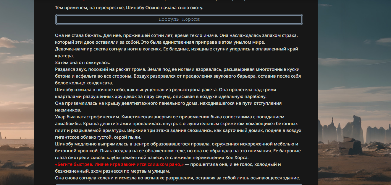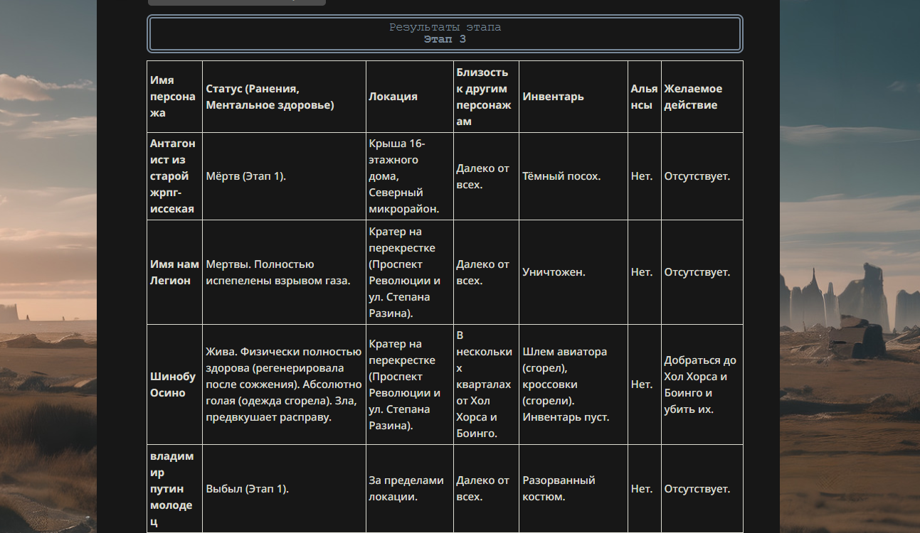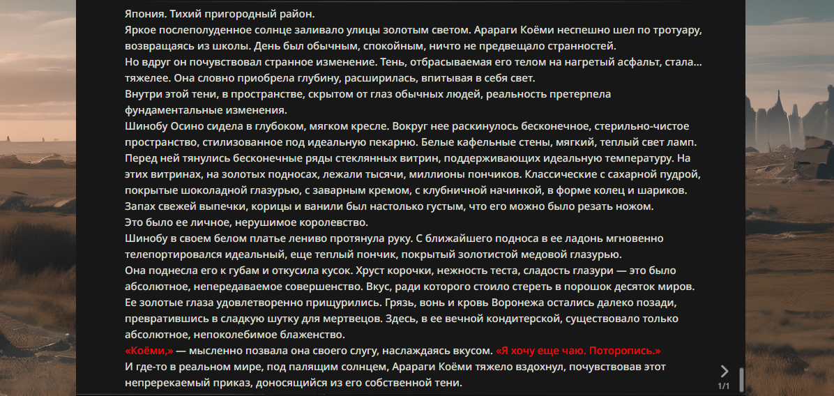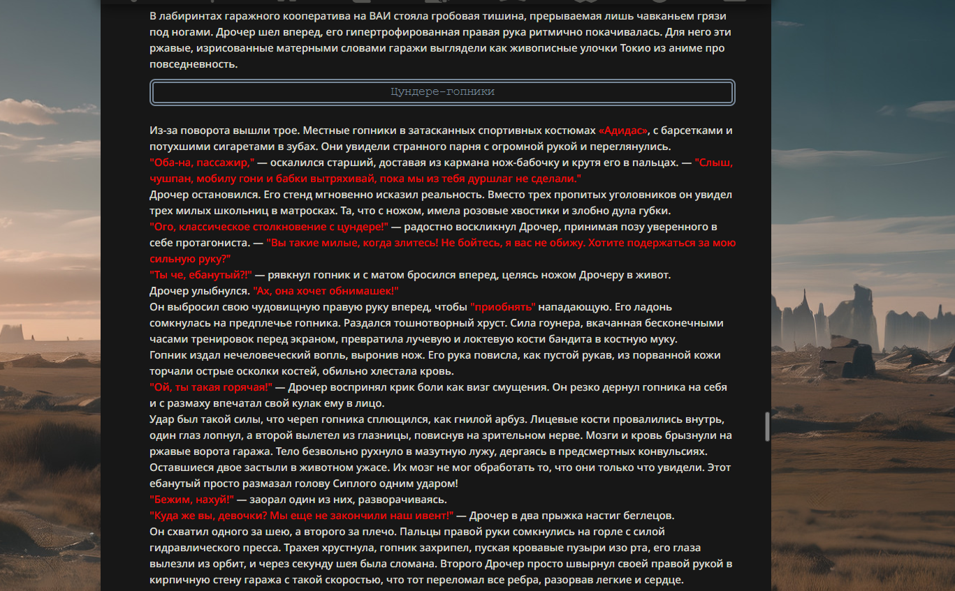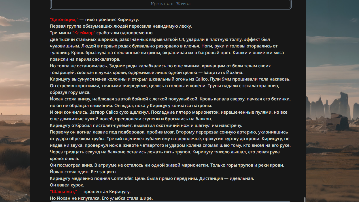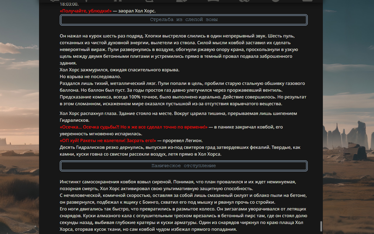 >>330178991 >Желание и сейчас оценки сделаю по просьбе. > >Секунду, шиза в желаниях. (Сверкаю глазами, потираю руки) Отлично! Шиза в желаниях — это прекрасно. Значит, игроки будут выбивать друг другу не просто "силу" или "богатство", а максимально неудобные, ироничные или абсурдные призрачные мечты. Жду списка желаний от каждого персонажа (можно в личку или сюда, если хочешь сохранить интригу). Как только желания будут определены — кидаю кости первого раунда и описываю кровавую (или не очень) мясорубку на Гемини 3.1.