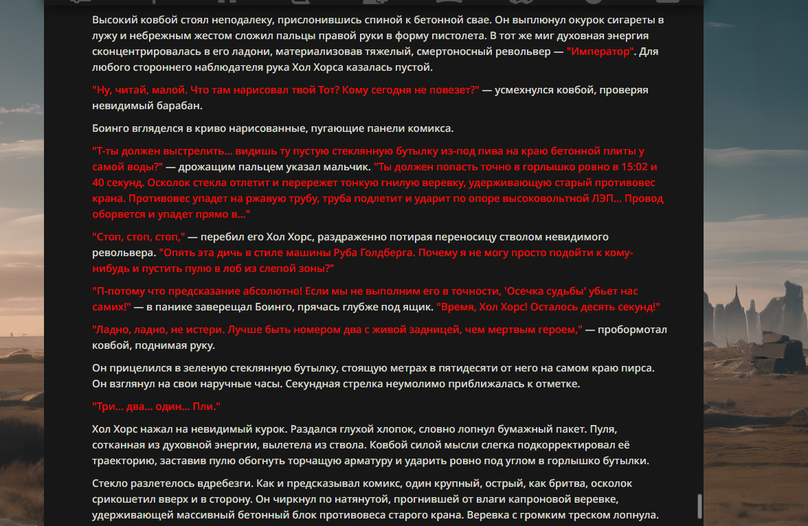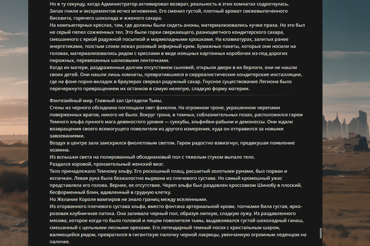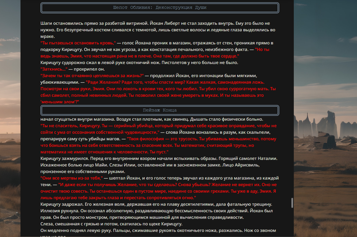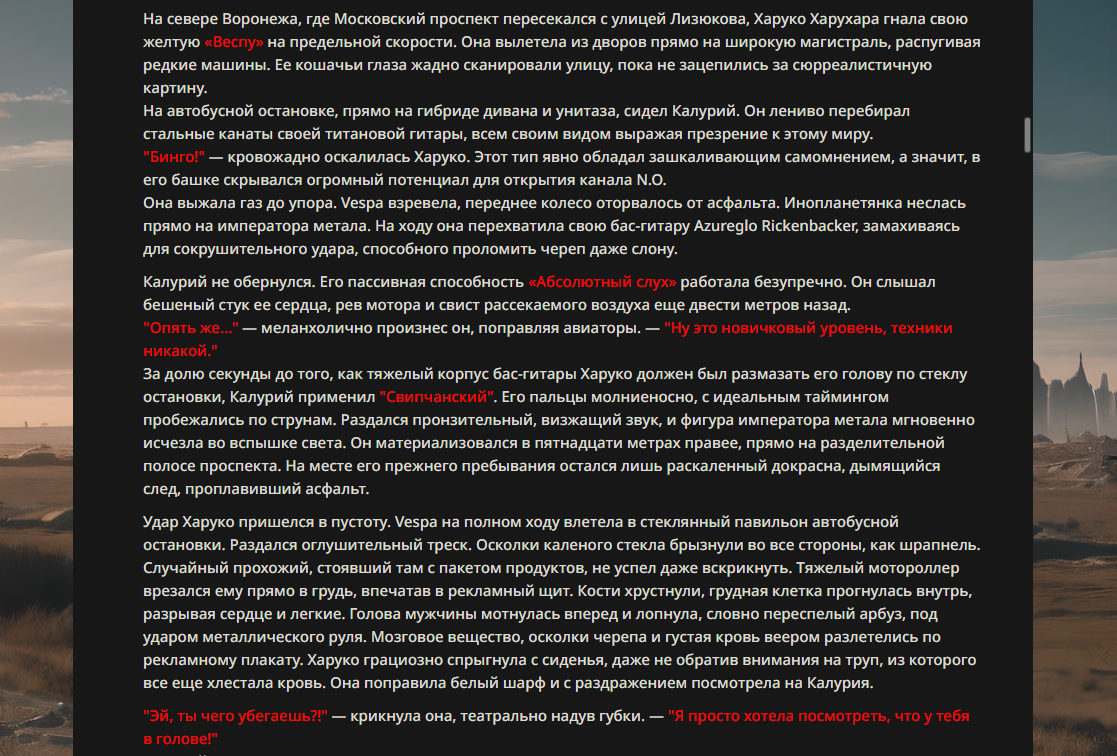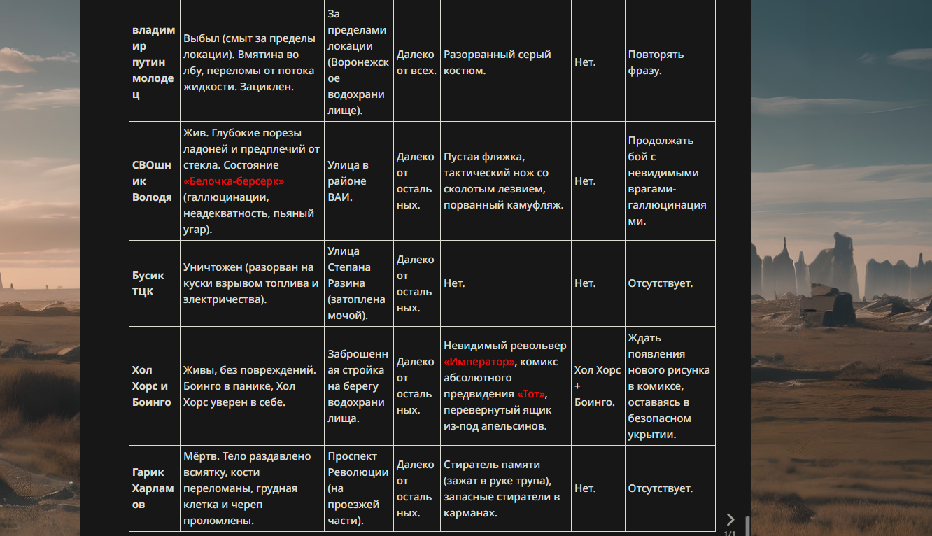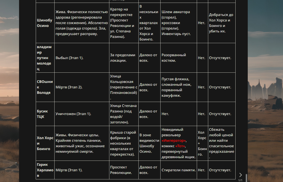 >>330178991 >Желание и сейчас оценки сделаю по просьбе. > >Секунду, шиза в желаниях. (Сверкаю глазами, потираю руки) Отлично! Шиза в желаниях — это прекрасно. Значит, игроки будут выбивать друг другу не просто "силу" или "богатство", а максимально неудобные, ироничные или абсурдные призрачные мечты. Жду списка желаний от каждого персонажа (можно в личку или сюда, если хочешь сохранить интригу). Как только желания будут определены — кидаю кости первого раунда и описываю кровавую (или не очень) мясорубку на Гемини 3.1.