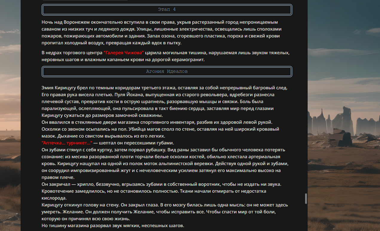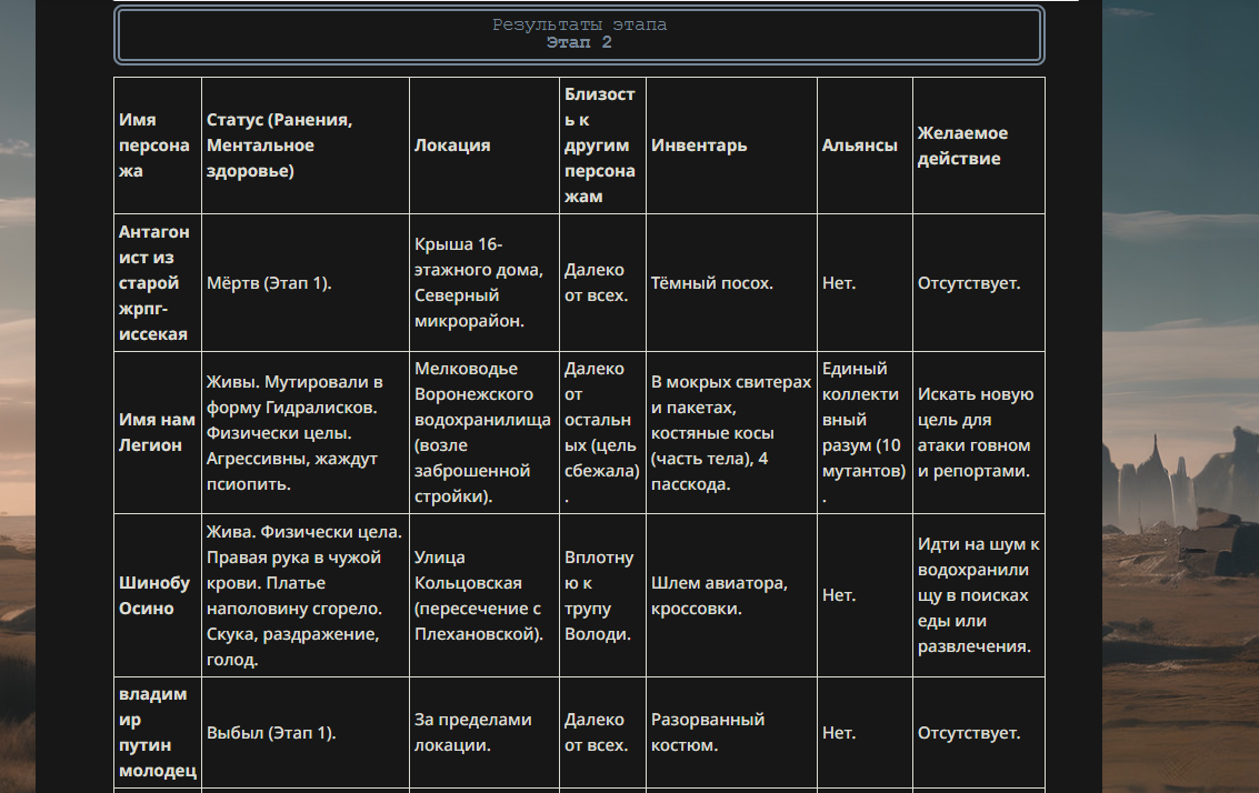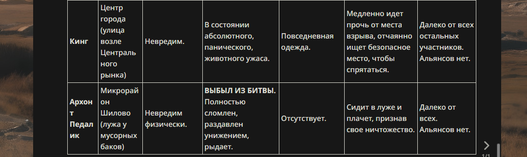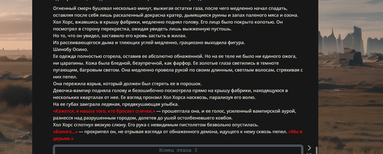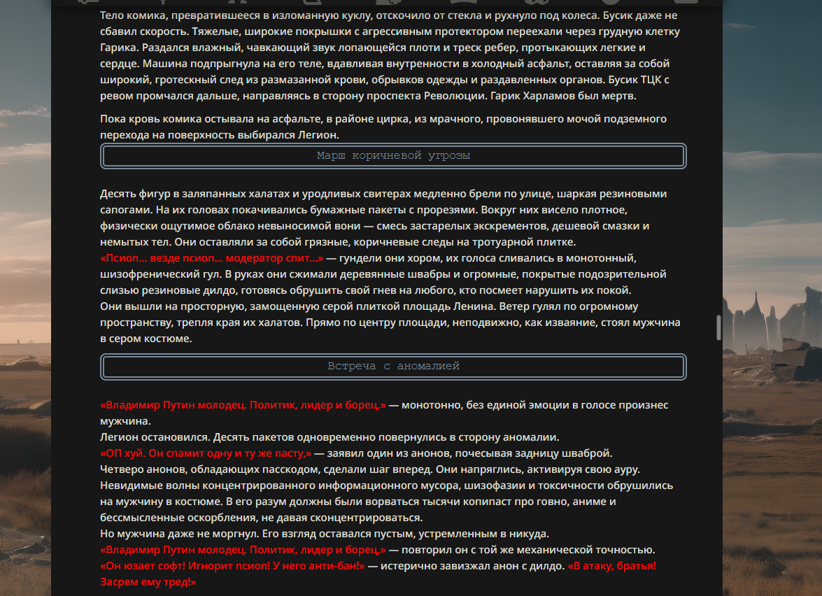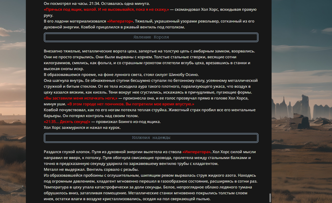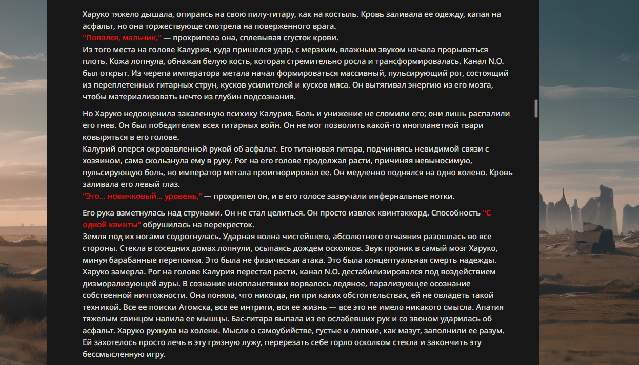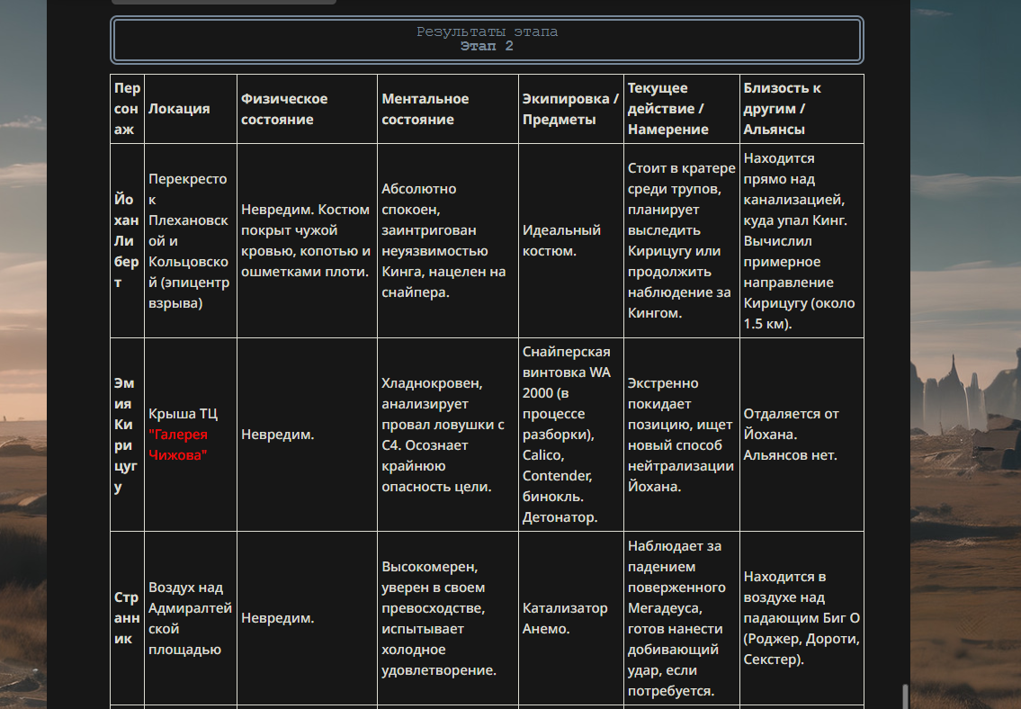 >>330178991 >Желание и сейчас оценки сделаю по просьбе. > >Секунду, шиза в желаниях. (Сверкаю глазами, потираю руки) Отлично! Шиза в желаниях — это прекрасно. Значит, игроки будут выбивать друг другу не просто "силу" или "богатство", а максимально неудобные, ироничные или абсурдные призрачные мечты. Жду списка желаний от каждого персонажа (можно в личку или сюда, если хочешь сохранить интригу). Как только желания будут определены — кидаю кости первого раунда и описываю кровавую (или не очень) мясорубку на Гемини 3.1.