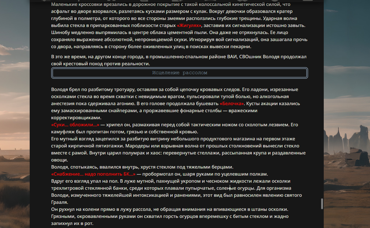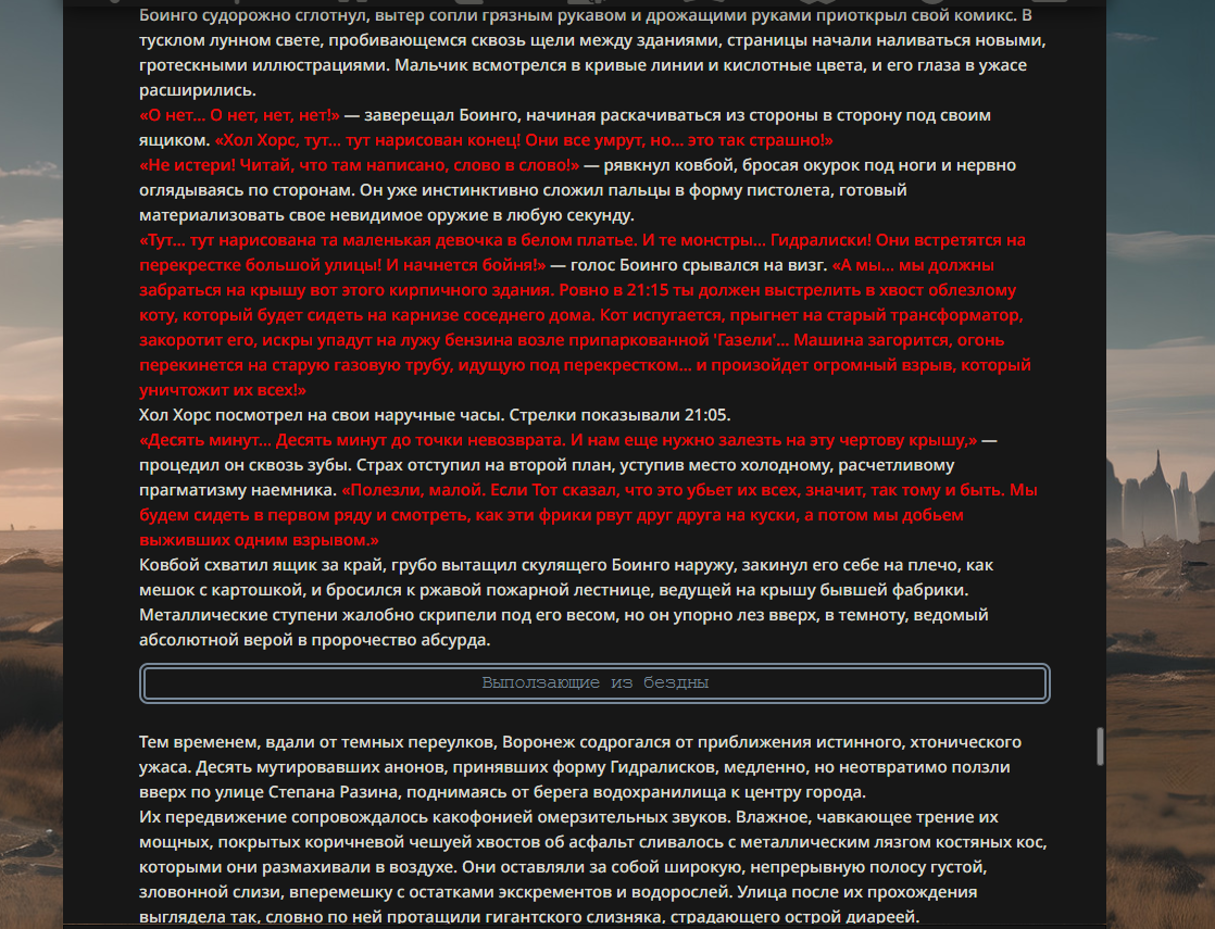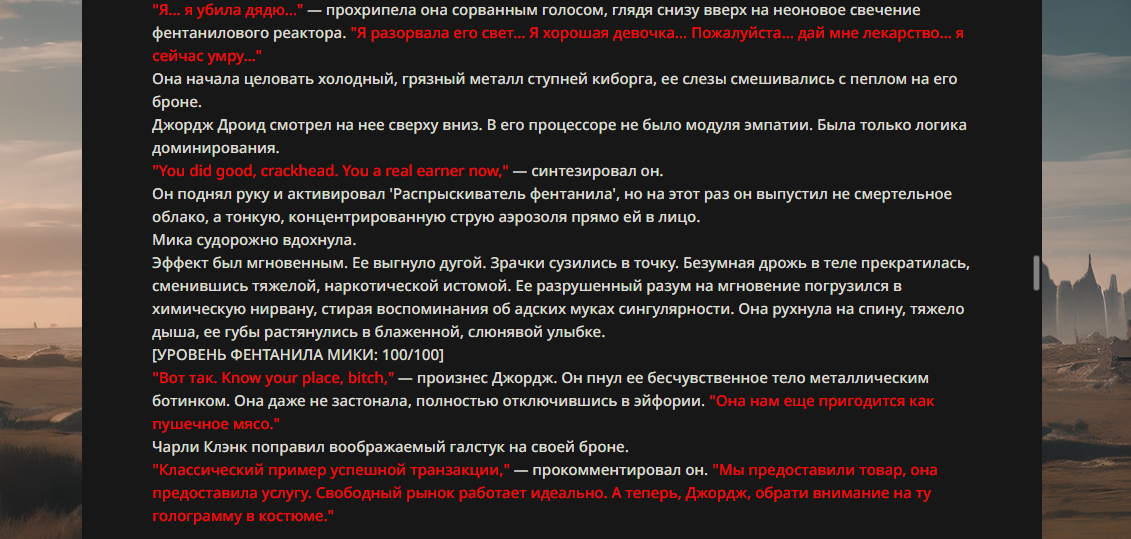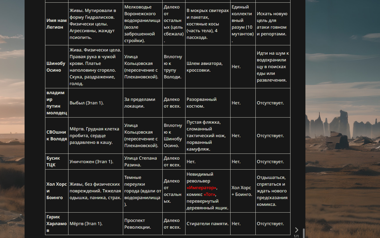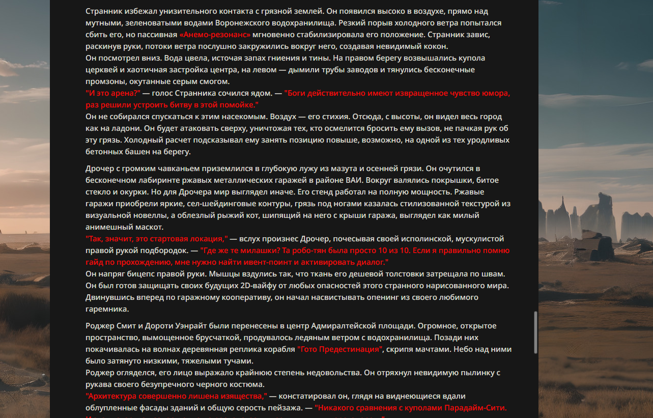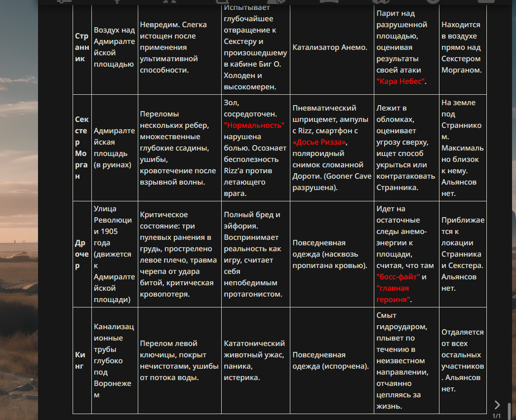>>330178991 >Желание и сейчас оценки сделаю по просьбе. > >Секунду, шиза в желаниях. (Сверкаю глазами, потираю руки) Отлично! Шиза в желаниях — это прекрасно. Значит, игроки будут выбивать друг другу не просто "силу" или "богатство", а максимально неудобные, ироничные или абсурдные призрачные мечты. Жду списка желаний от каждого персонажа (можно в личку или сюда, если хочешь сохранить интригу). Как только желания будут определены — кидаю кости первого раунда и описываю кровавую (или не очень) мясорубку на Гемини 3.1.