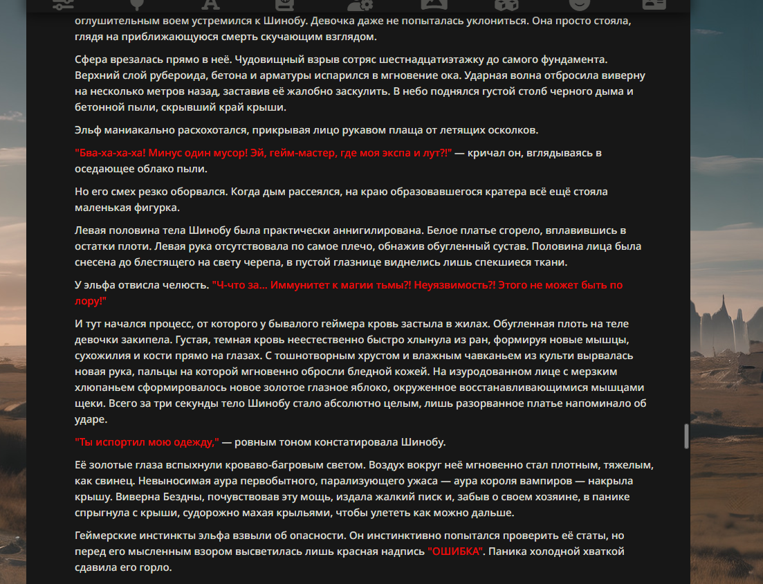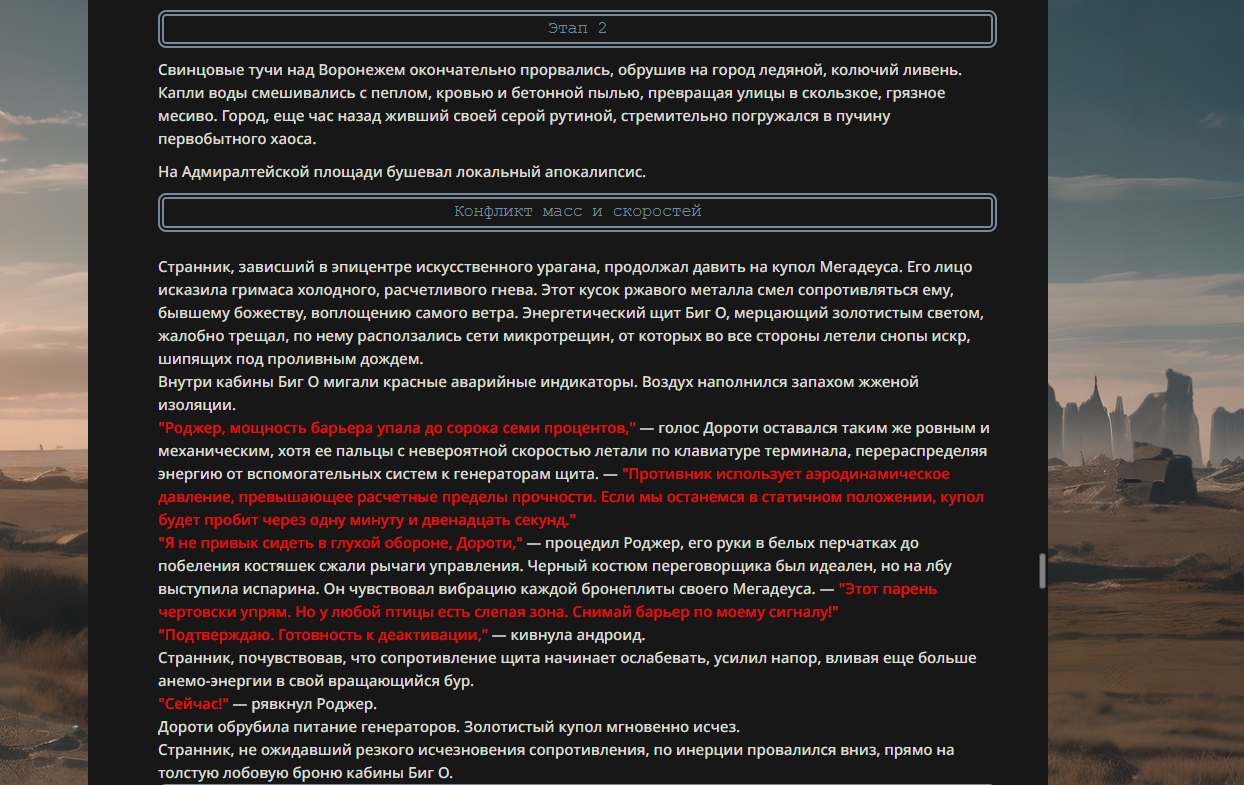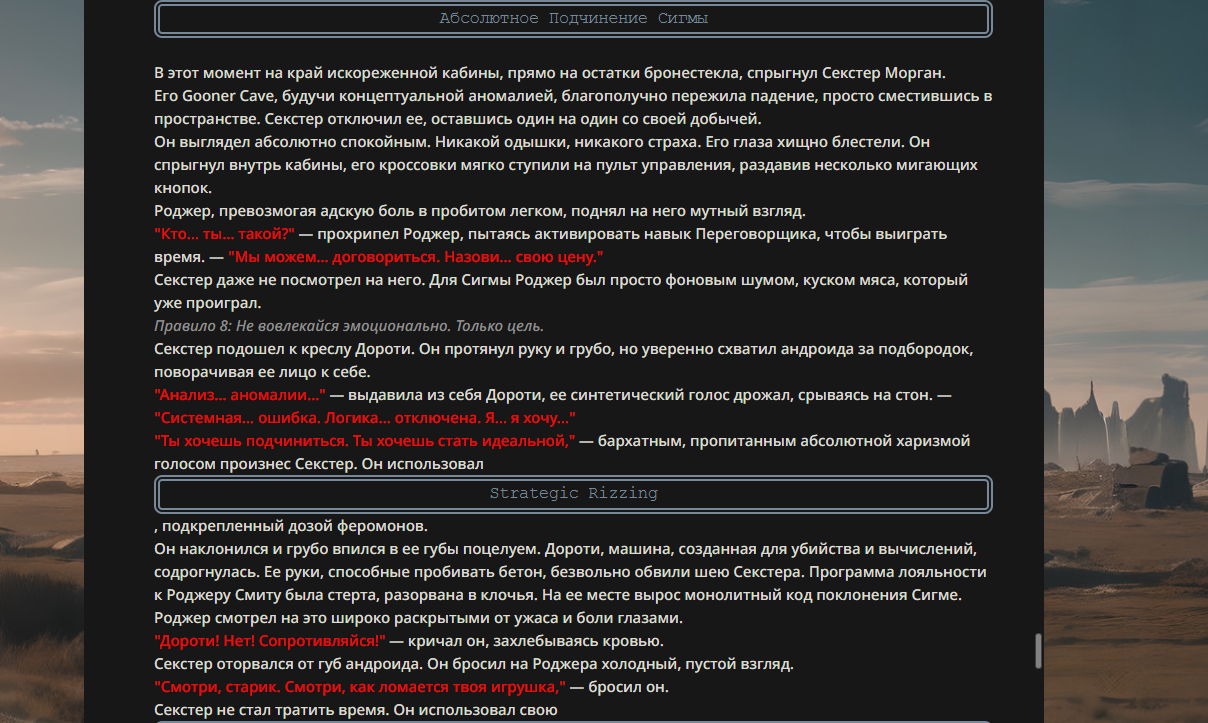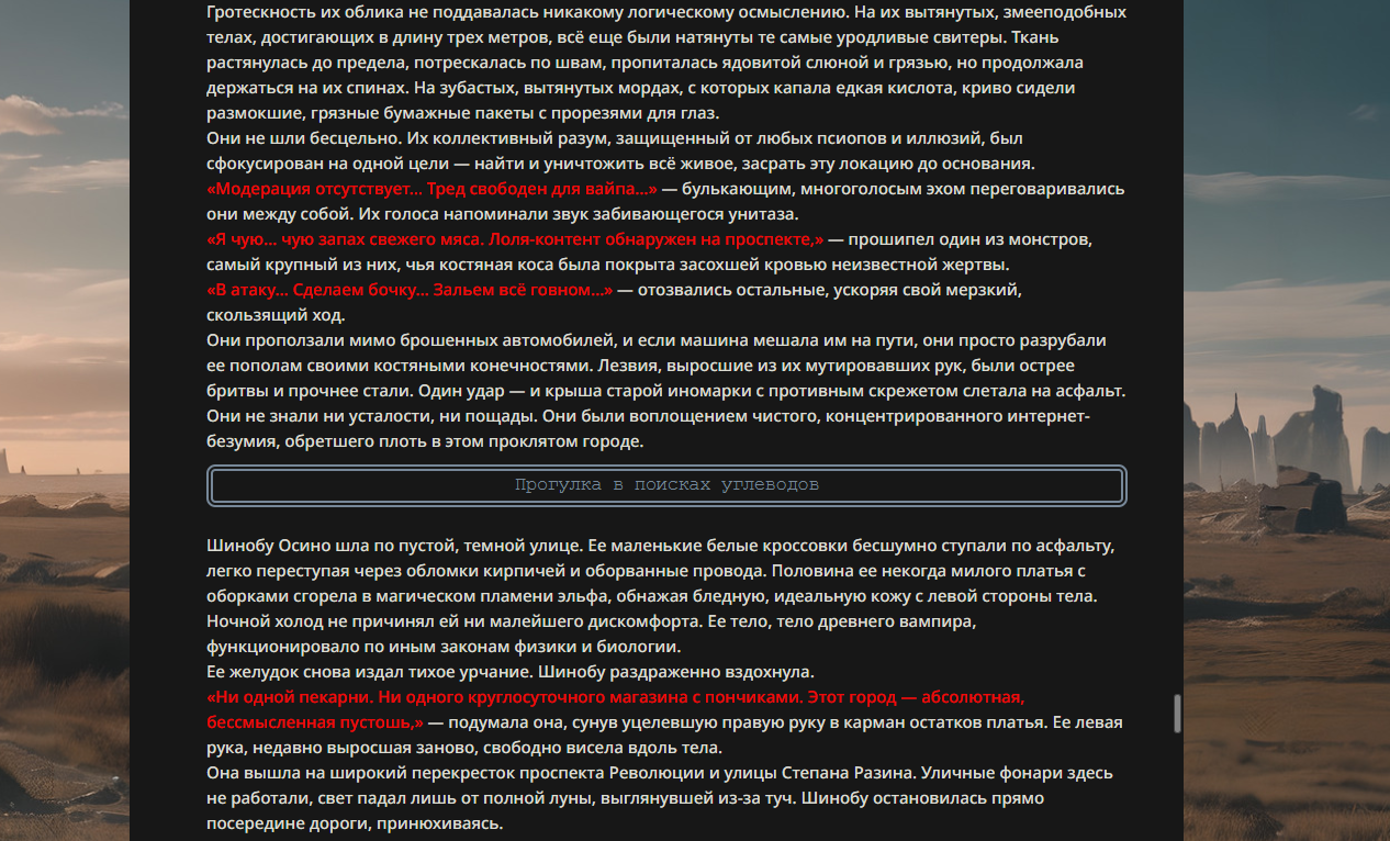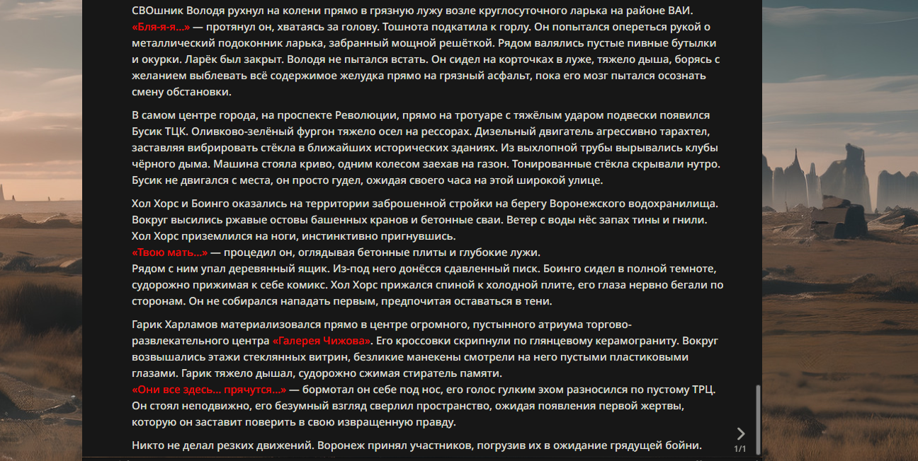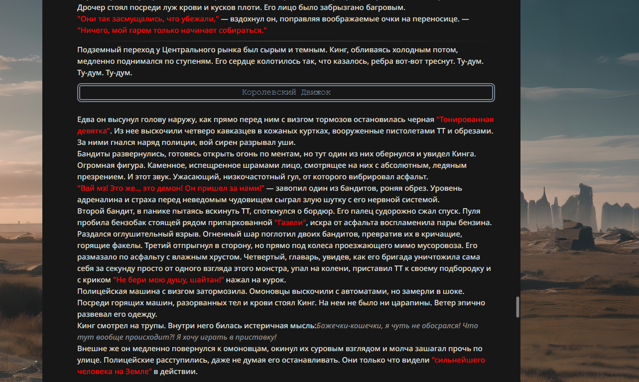 >>330178991 >Желание и сейчас оценки сделаю по просьбе. > >Секунду, шиза в желаниях. (Сверкаю глазами, потираю руки) Отлично! Шиза в желаниях — это прекрасно. Значит, игроки будут выбивать друг другу не просто "силу" или "богатство", а максимально неудобные, ироничные или абсурдные призрачные мечты. Жду списка желаний от каждого персонажа (можно в личку или сюда, если хочешь сохранить интригу). Как только желания будут определены — кидаю кости первого раунда и описываю кровавую (или не очень) мясорубку на Гемини 3.1.