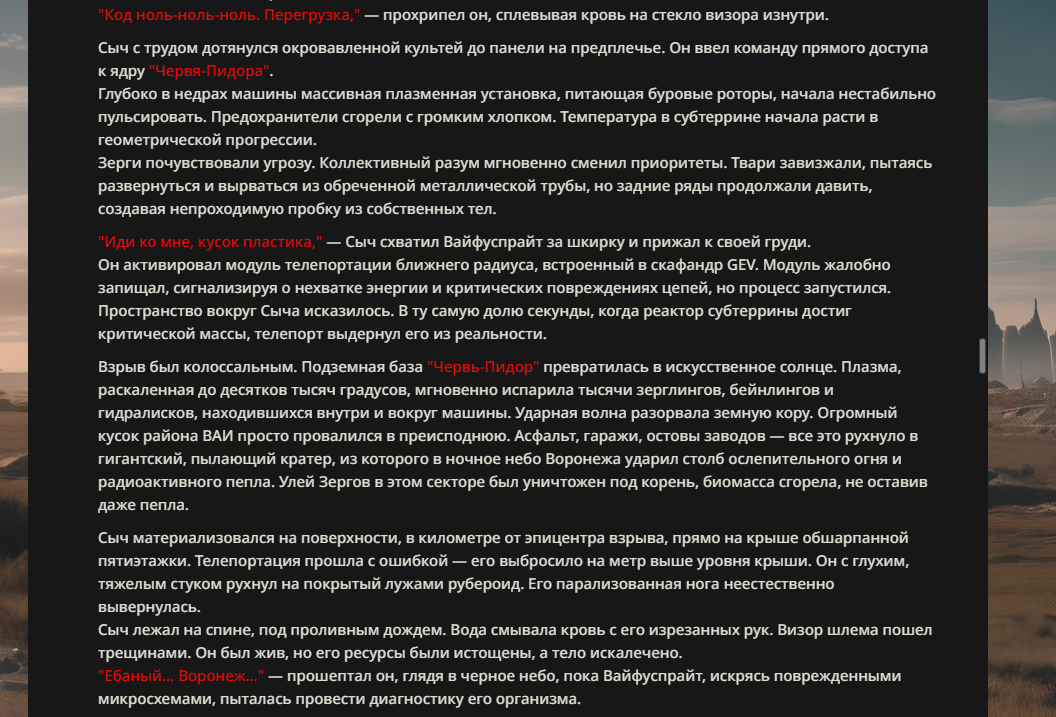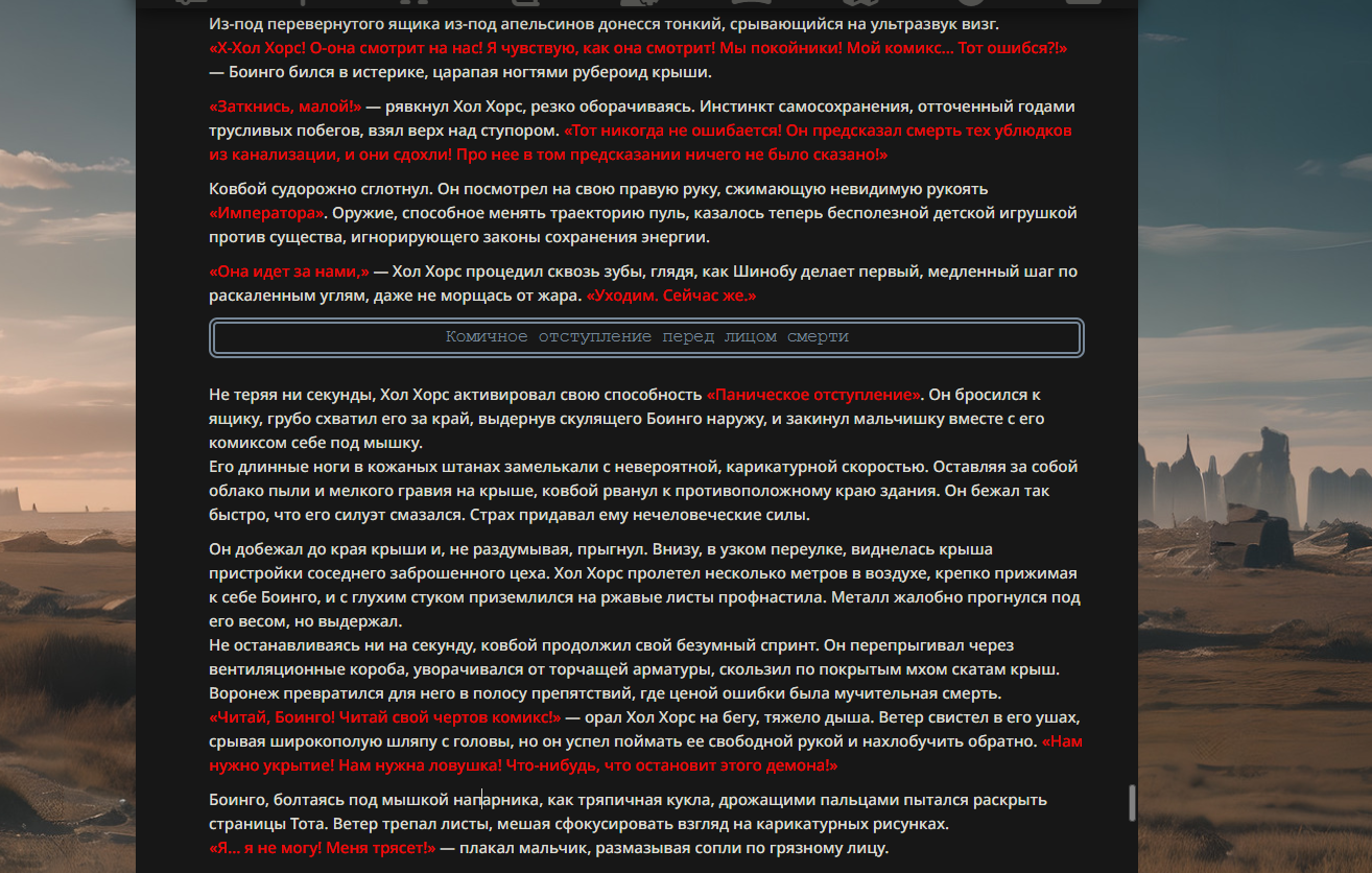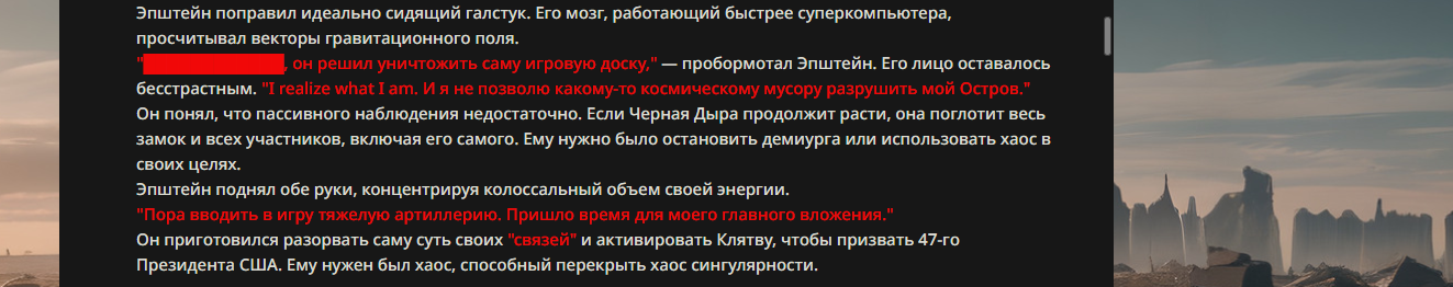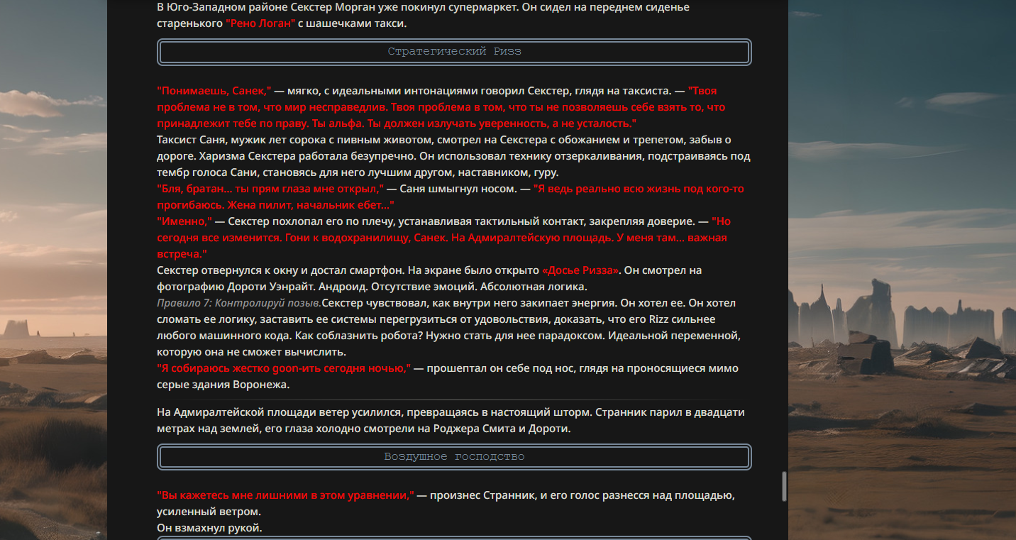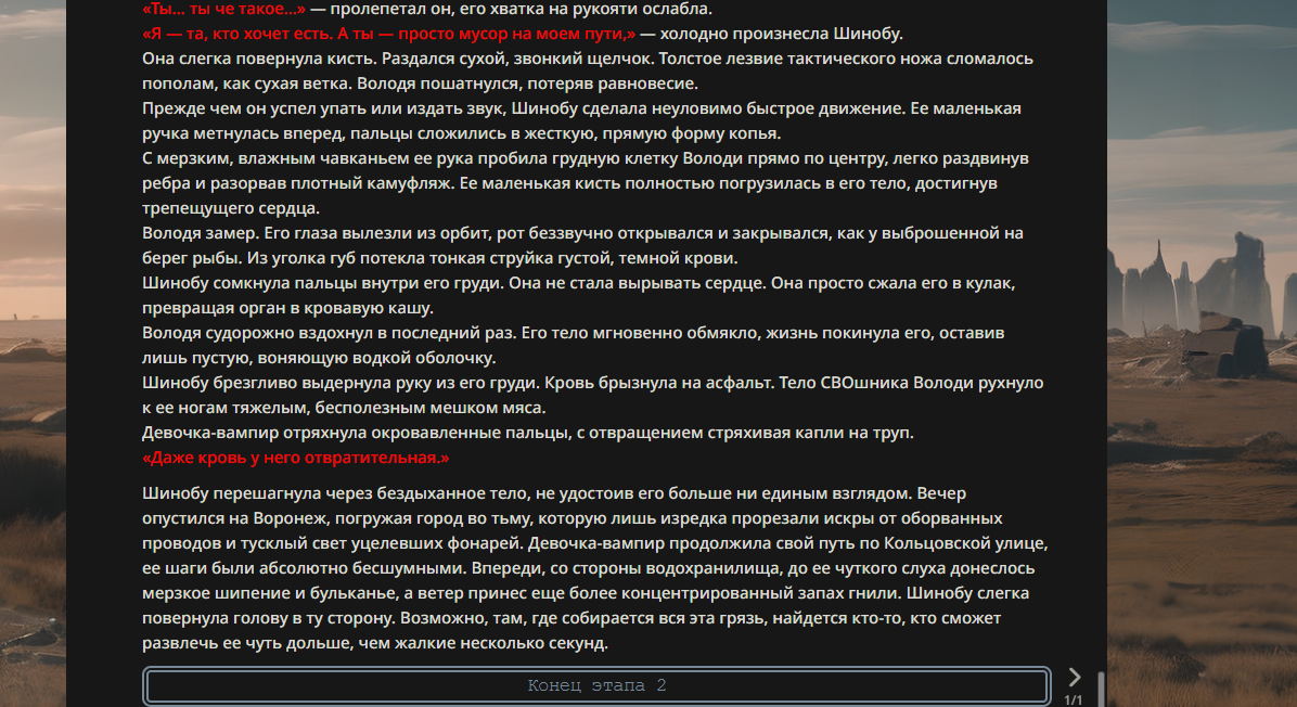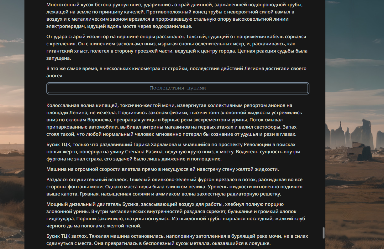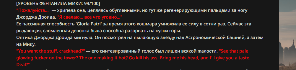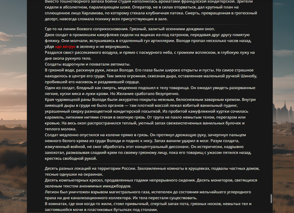 >>330178991 >Желание и сейчас оценки сделаю по просьбе. > >Секунду, шиза в желаниях. (Сверкаю глазами, потираю руки) Отлично! Шиза в желаниях — это прекрасно. Значит, игроки будут выбивать друг другу не просто "силу" или "богатство", а максимально неудобные, ироничные или абсурдные призрачные мечты. Жду списка желаний от каждого персонажа (можно в личку или сюда, если хочешь сохранить интригу). Как только желания будут определены — кидаю кости первого раунда и описываю кровавую (или не очень) мясорубку на Гемини 3.1.