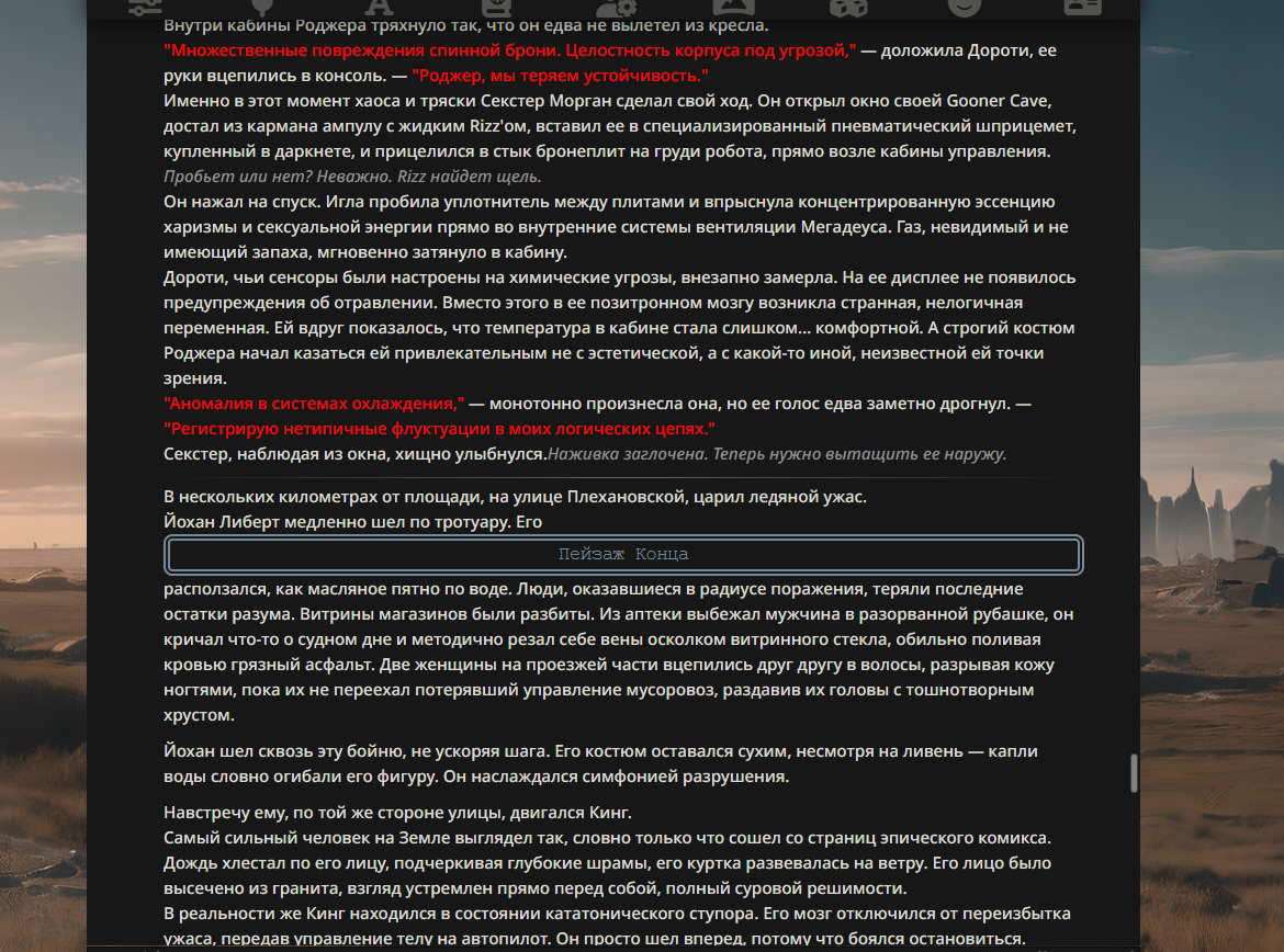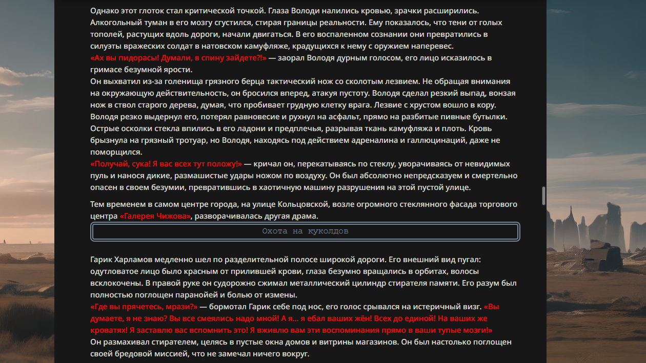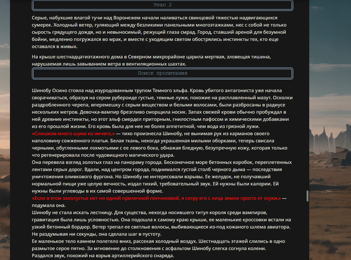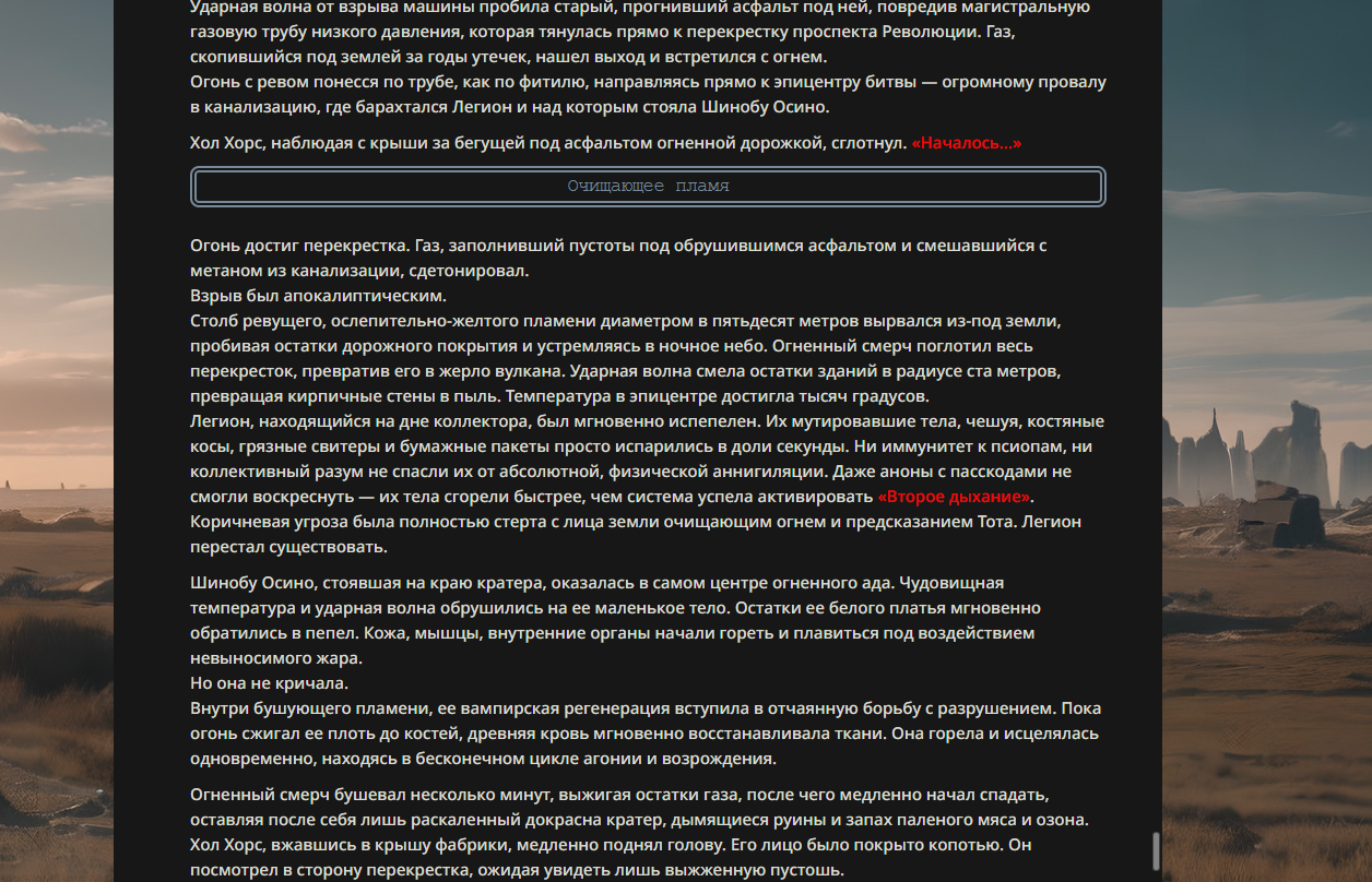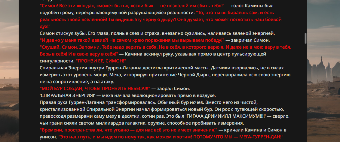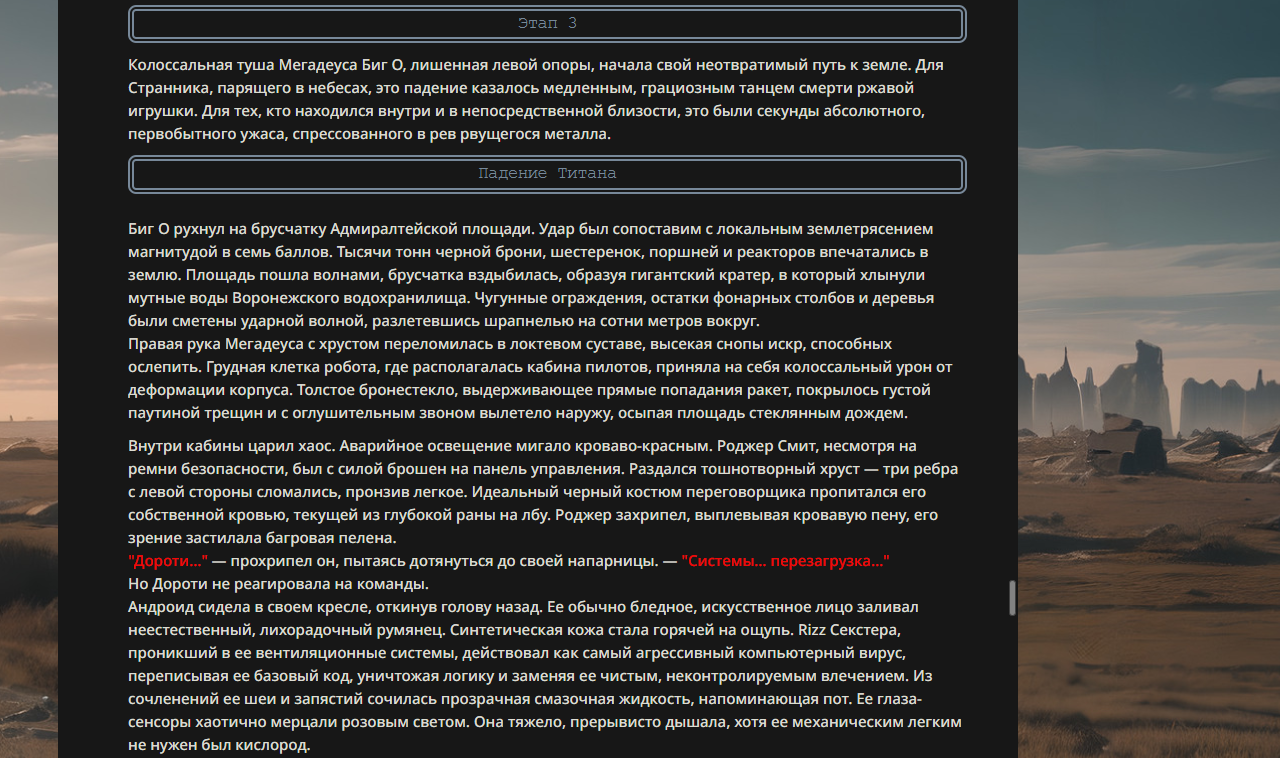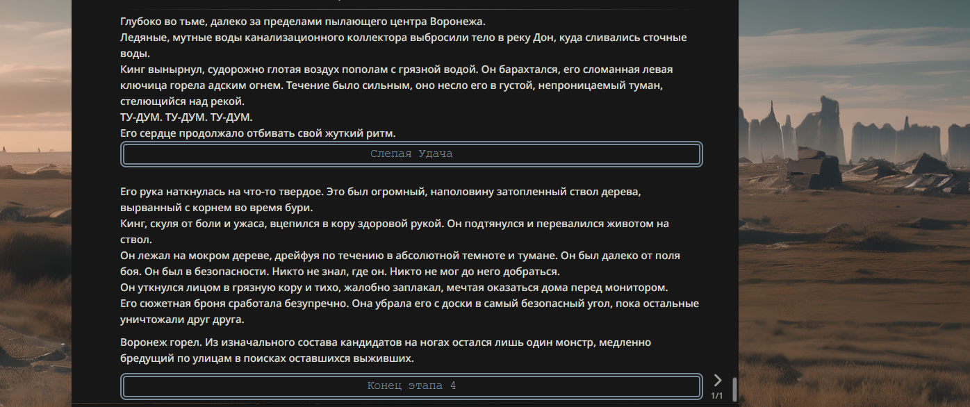 >>330178991 >Желание и сейчас оценки сделаю по просьбе. > >Секунду, шиза в желаниях. (Сверкаю глазами, потираю руки) Отлично! Шиза в желаниях — это прекрасно. Значит, игроки будут выбивать друг другу не просто "силу" или "богатство", а максимально неудобные, ироничные или абсурдные призрачные мечты. Жду списка желаний от каждого персонажа (можно в личку или сюда, если хочешь сохранить интригу). Как только желания будут определены — кидаю кости первого раунда и описываю кровавую (или не очень) мясорубку на Гемини 3.1.